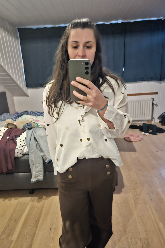 Associe cette chemise avec un pantalon noir ajusté et des bottines pour un look chic et raffiné, idéal pour les soirées d'hiver. • Chemise à manches longues • Col à volants • Motif cœur charmant • Détail boutonné sur le devant • Doublure légèrement transparente