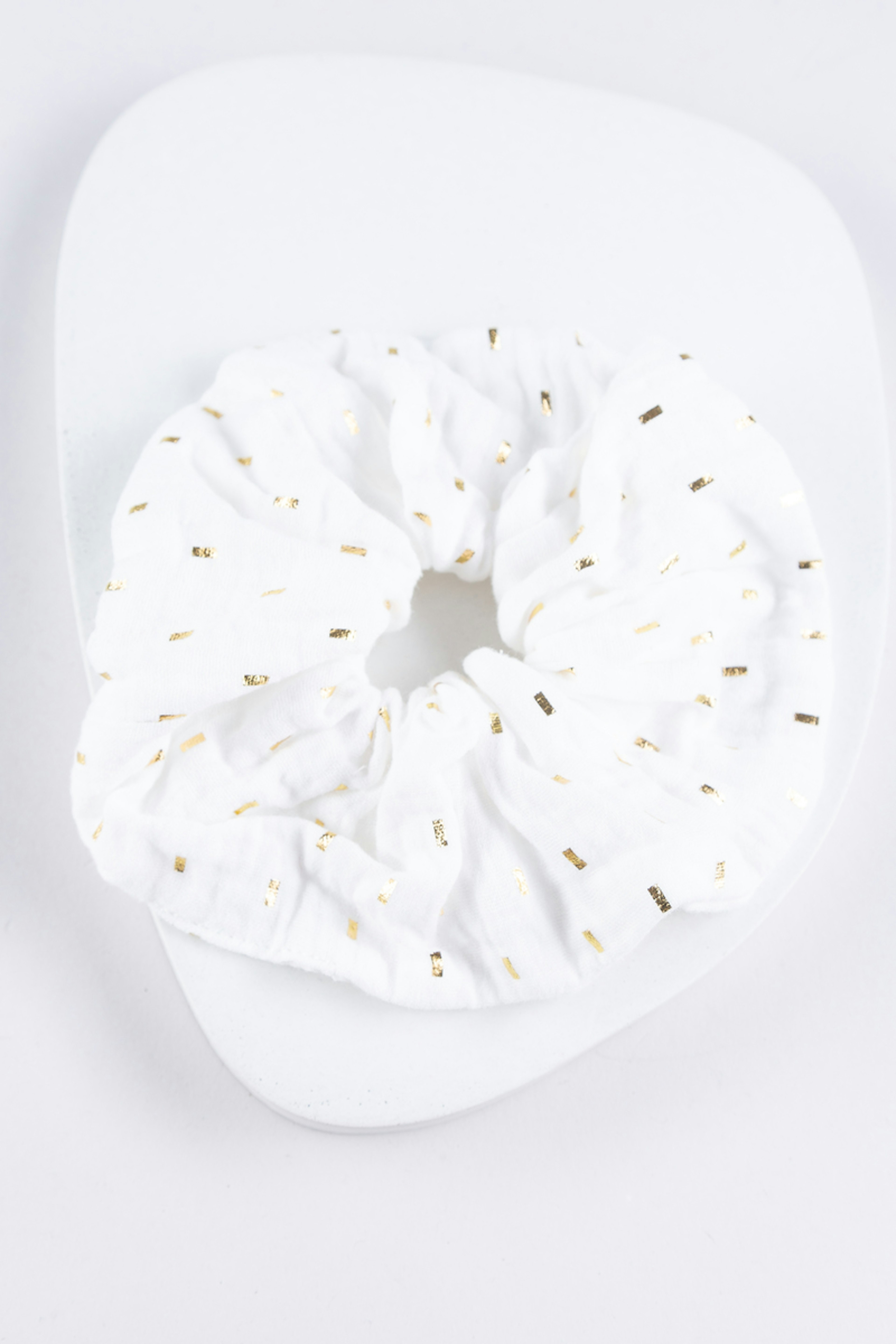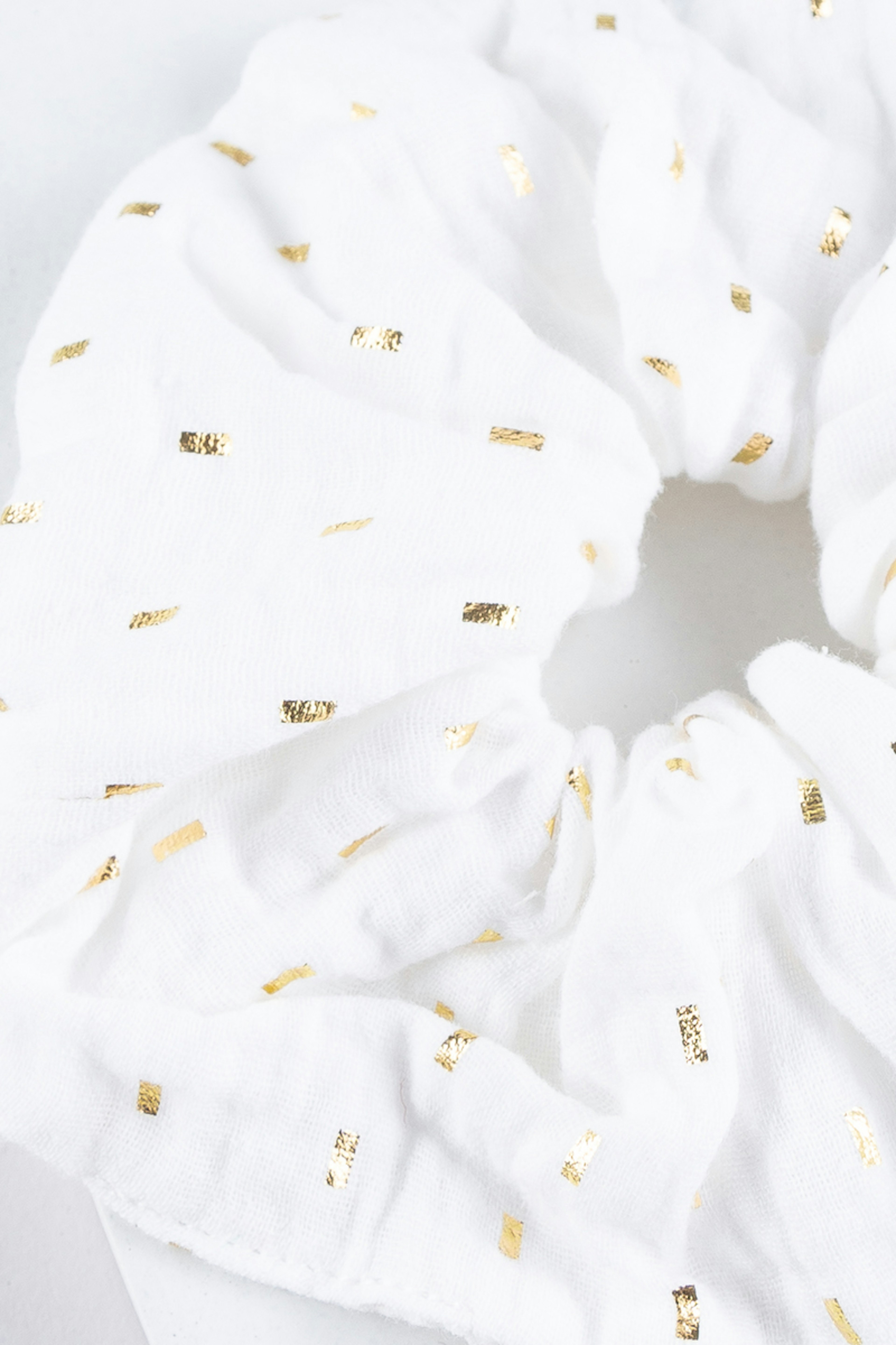 โข Chouchou en double gaze รฉcrue et dorรฉe โข Dรฉtails dorรฉs sur le tissu โข Matiรจre lรฉgรจre en coton ร l'aspect gaufrรฉ โข Idรฉal pour accessoiriser vos coiffures d'รฉtรฉ โข 100% gaze cotonย biologique Oeko-Tex et GOTS