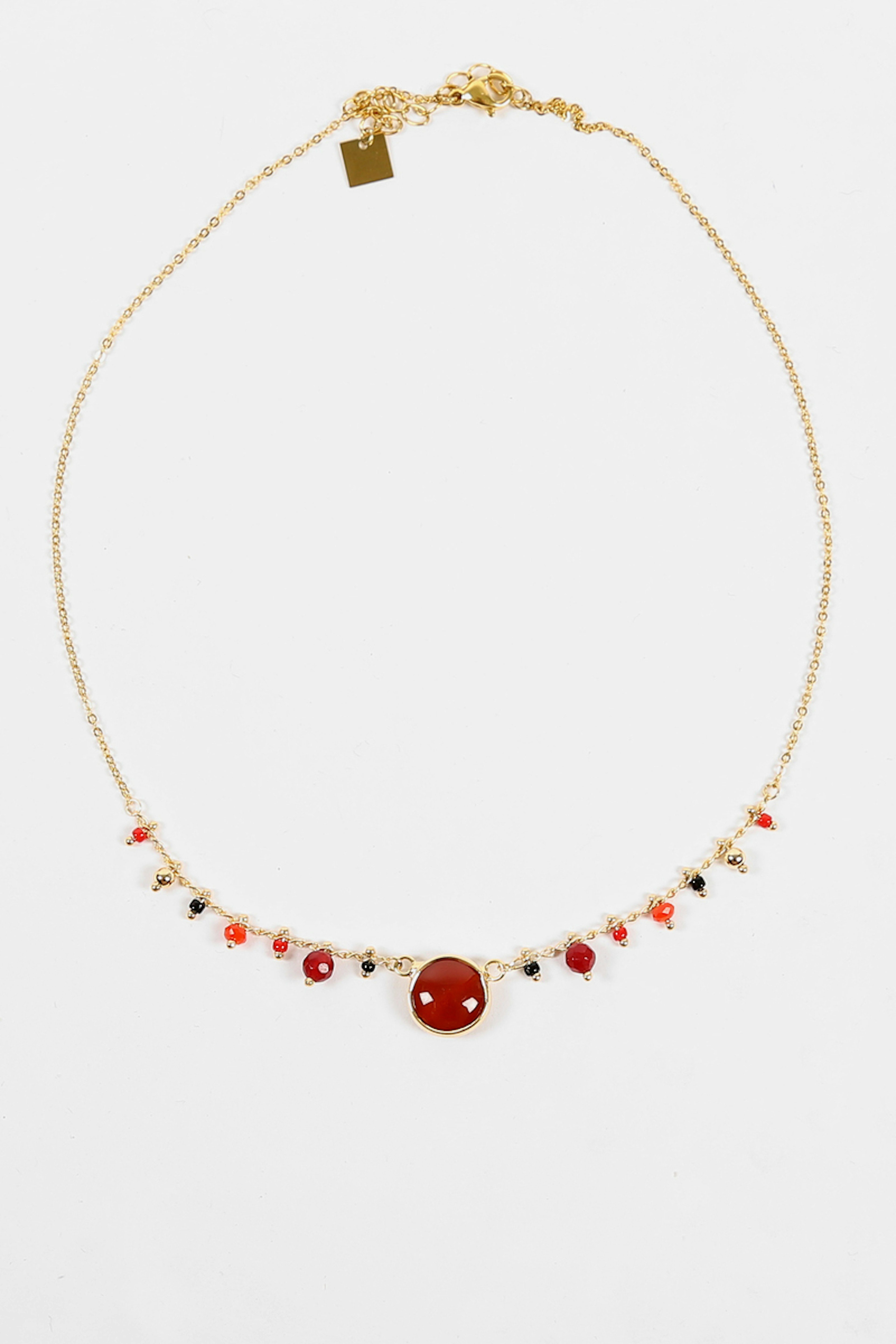 Collier chaรฎne or avec perles rouges et noires et pendentif avec pierre rouge sertie.