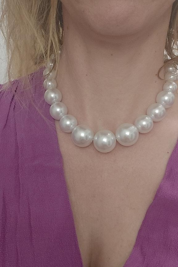 Sublimez votre allure avec cette piรจce intemporelle, parfaite pour toute saison, qui ajoutera une touche d'รฉlรฉgance ร votre tenue de jour comme de nuit. โข Collier en perles blanches de taille irrรฉguliรจre โข Fermoir sรฉcurisรฉ โข Longueur ajustable โข Design intemporel
