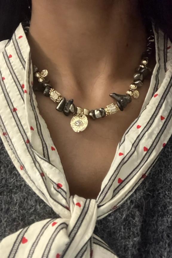 Ajoutez une touche de mystère à vos tenues avec ce collier en le combinant à une chemise en soie pour une élégance intemporelle. Parfait en toute saison. • Perles dorées raffinées • Pierres naturelles sculptées • Fermoir magnétique pratique • Charm incrusté de cristaux • Design inspiré du Brésil