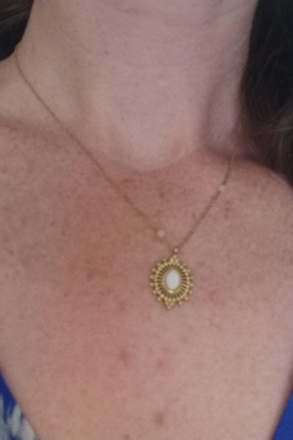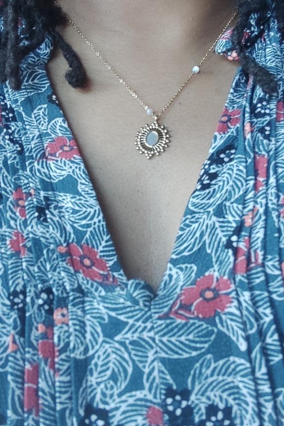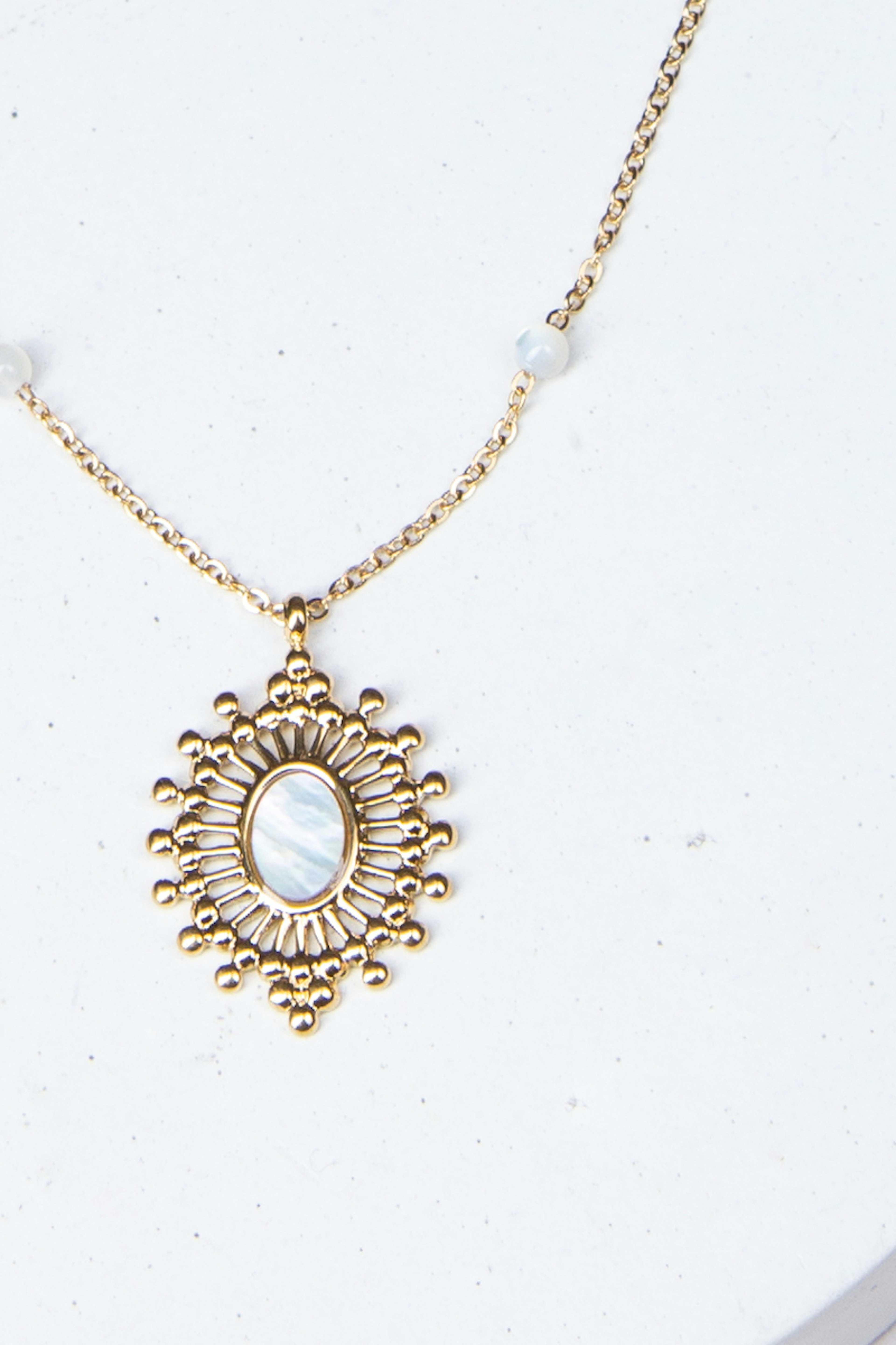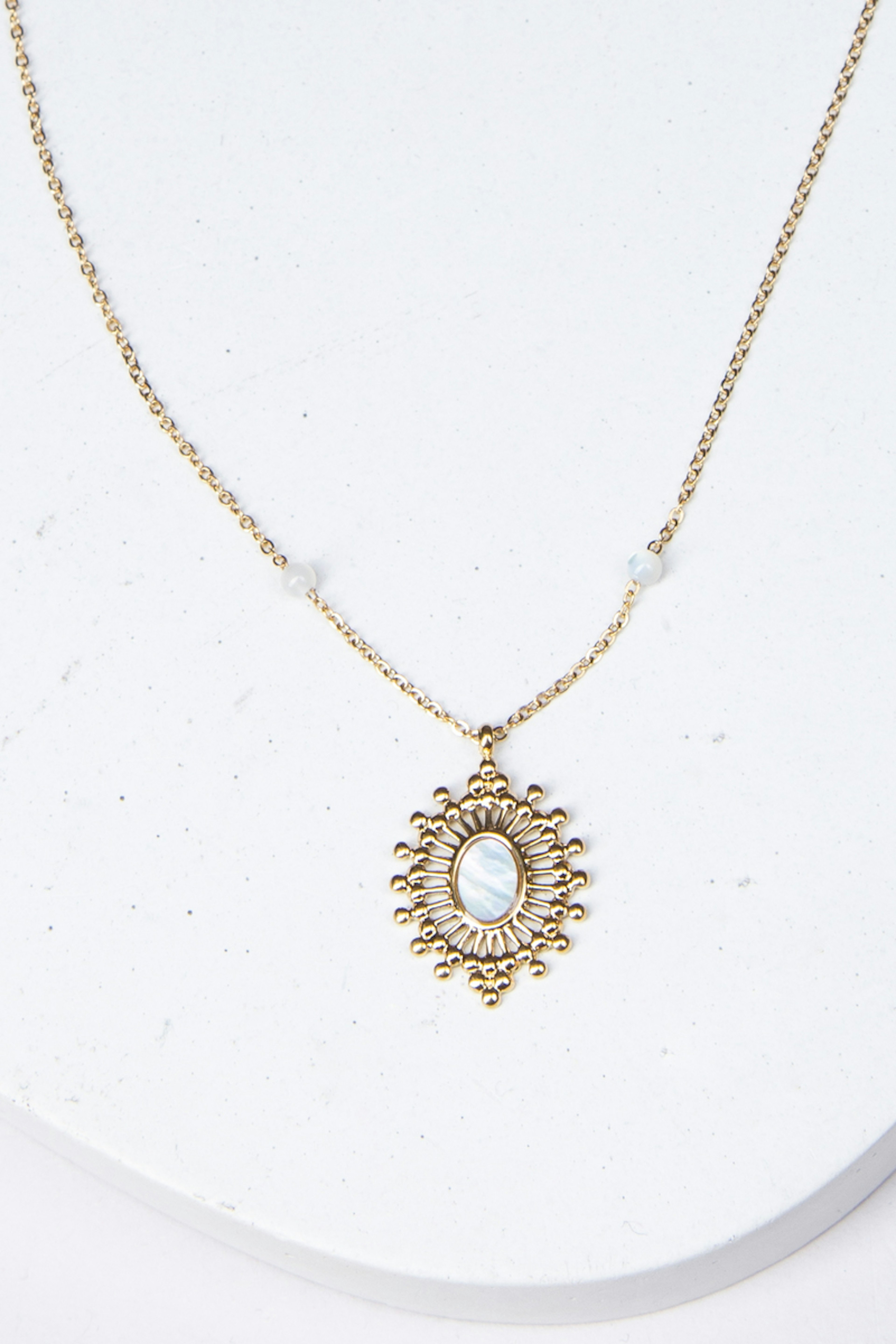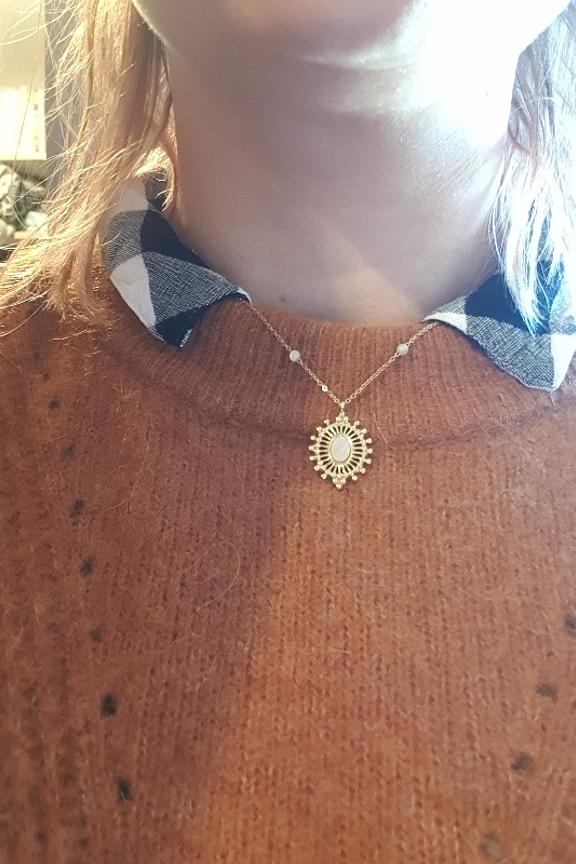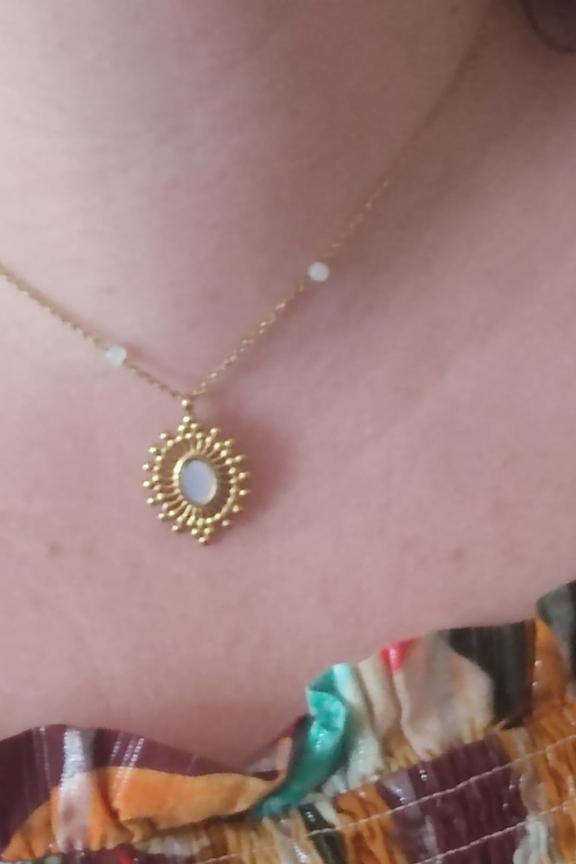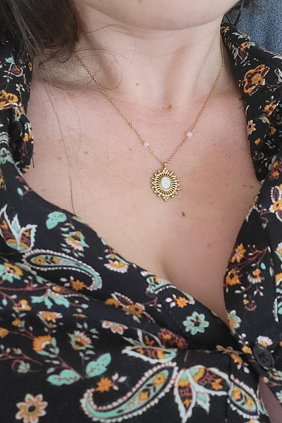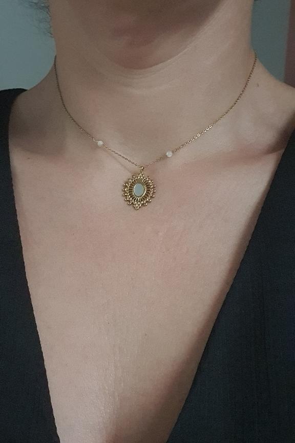 Collier rรฉglable sur chaine avec une piรจce ajourรฉe et sertie d'une pierre naturelle. โข Fermoir mousqueton et chainette de rรฉglage โข Pierre naturelle : nacre, โข Dimension : 38+5 cm โข Acier inoxydable โข Hypoallergรฉnique, ce bijou rรฉsiste ร l'eau et ne noircit pas