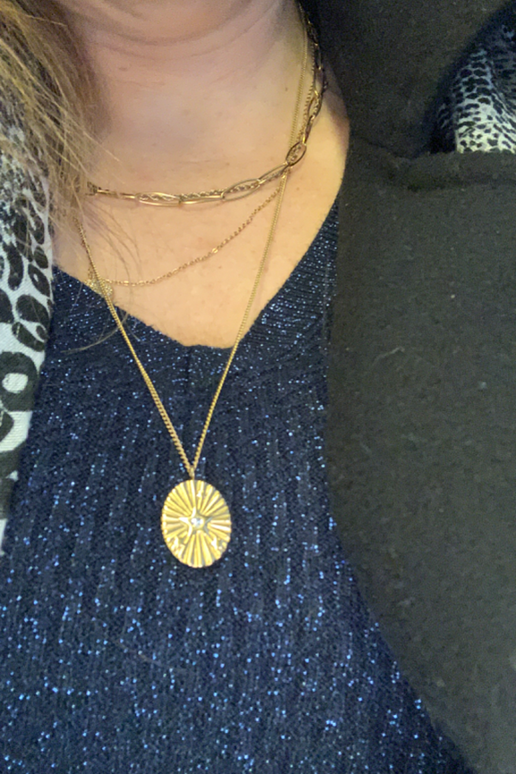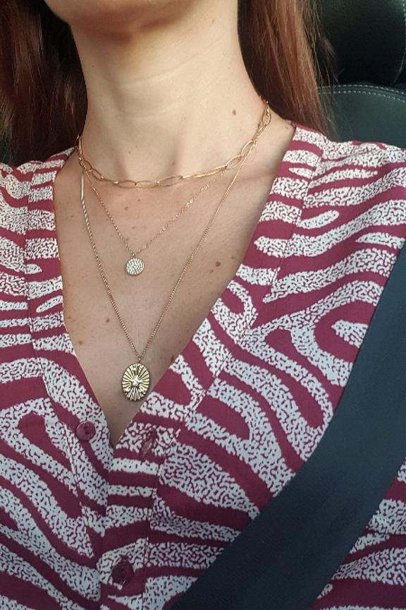 Collier rรฉglable sur chaine 3 rangs ornรฉ d'une chaine avec touches รฉmaillรฉes, d'un pendentif dorรฉ martelรฉ et d'une piรจce รฉmaillรฉe avec une รฉtoile โข Fermoir mousqueton et chainette de rรฉglage โข Matiรจre : Acier inoxydable โข Hypoallergรฉnique, ce bijou rรฉsiste ร l'eau et ne noircit pas.