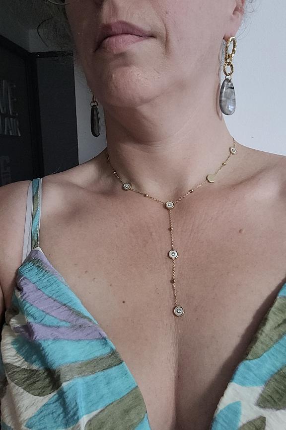 Ajoutez une touche d'รฉlรฉgance avec ce collier dorรฉ. Parfait ร porter avec un chemisier ouvert et des boucles d'oreilles assorties pour une allure raffinรฉe. โข Collier en acier inoxydable โข Conception avec pendentifs ronds โข Chaรฎne fine et dรฉlicate โข Fermeture sรฉcurisรฉe ร l'arriรจre โข Dรฉtails dorรฉs รฉlรฉgants