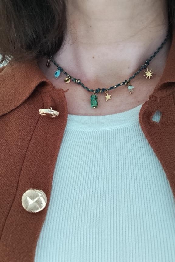 Ce collier est un trรฉsor bohรจme qui ajoutera une touche de charme ร vos ensembles de toutes saisons. Portez-le avec une blouse รฉthรฉrรฉe pour un look captivant. โข Collier ร breloques โข Cordage torsadรฉ โข Dรฉtails dorรฉs โข Pendentif en pierre โข Charm ลil protecteur