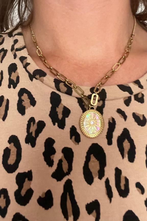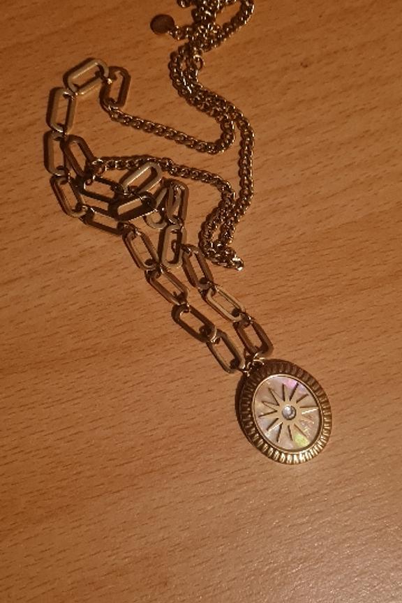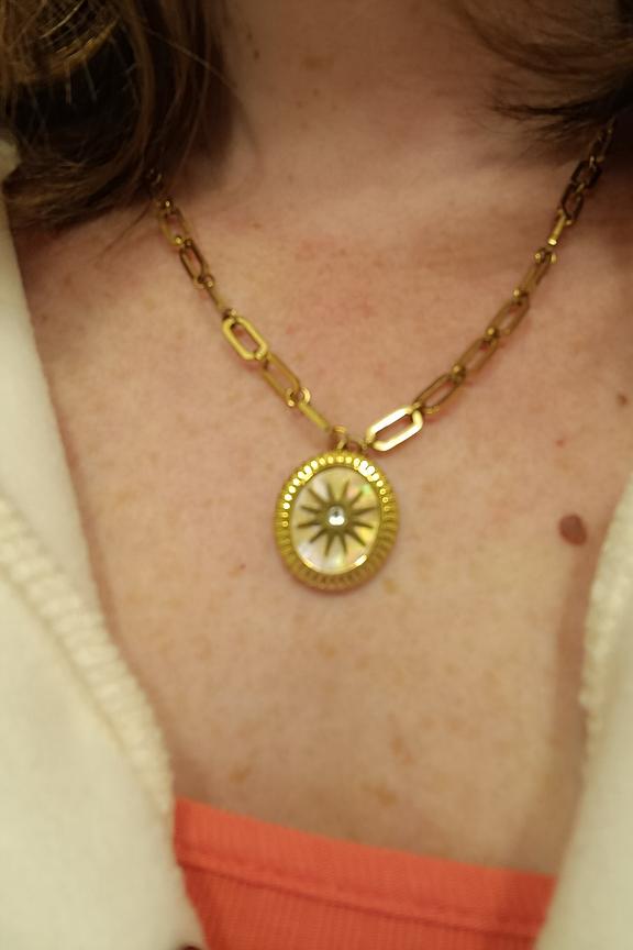 โ€ข Collier sur chaine avec un jeu de maillons composรฉ d'un pendentif graphique serti d'une feuille de nacre vรฉritable ornรฉe d'une รฉtoile et d'un strass โ€ข Fermoir mousqueton et chaรฎnette de rรฉglage โ€ข Dimensions : 45+5 cm โ€ข Hypoallergรฉnique, ce bijou rรฉsiste ร  l'eau et ne noircit pas