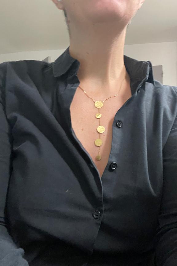 Ajoutez une touche d'รฉlรฉgance ร  votre tenue avec ce collier dorรฉ. Parfait avec un dรฉcolletรฉ en V pour une allure chic et moderne. โ€ข Collier en acier inoxydable โ€ข Chaรฎne fine et dรฉlicate โ€ข Suspensions circulaires โ€ข Fermoir discret โ€ข Design intemporel