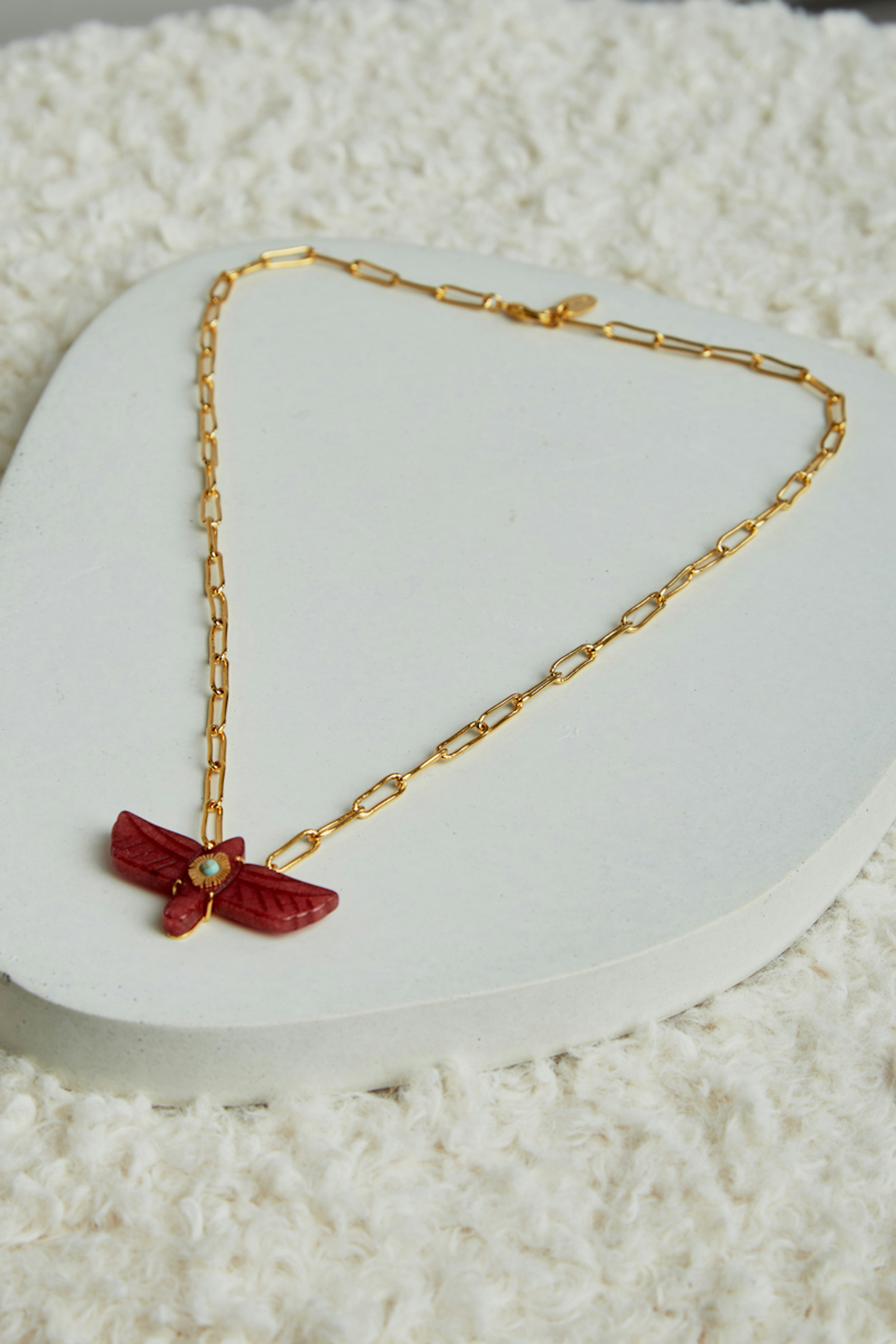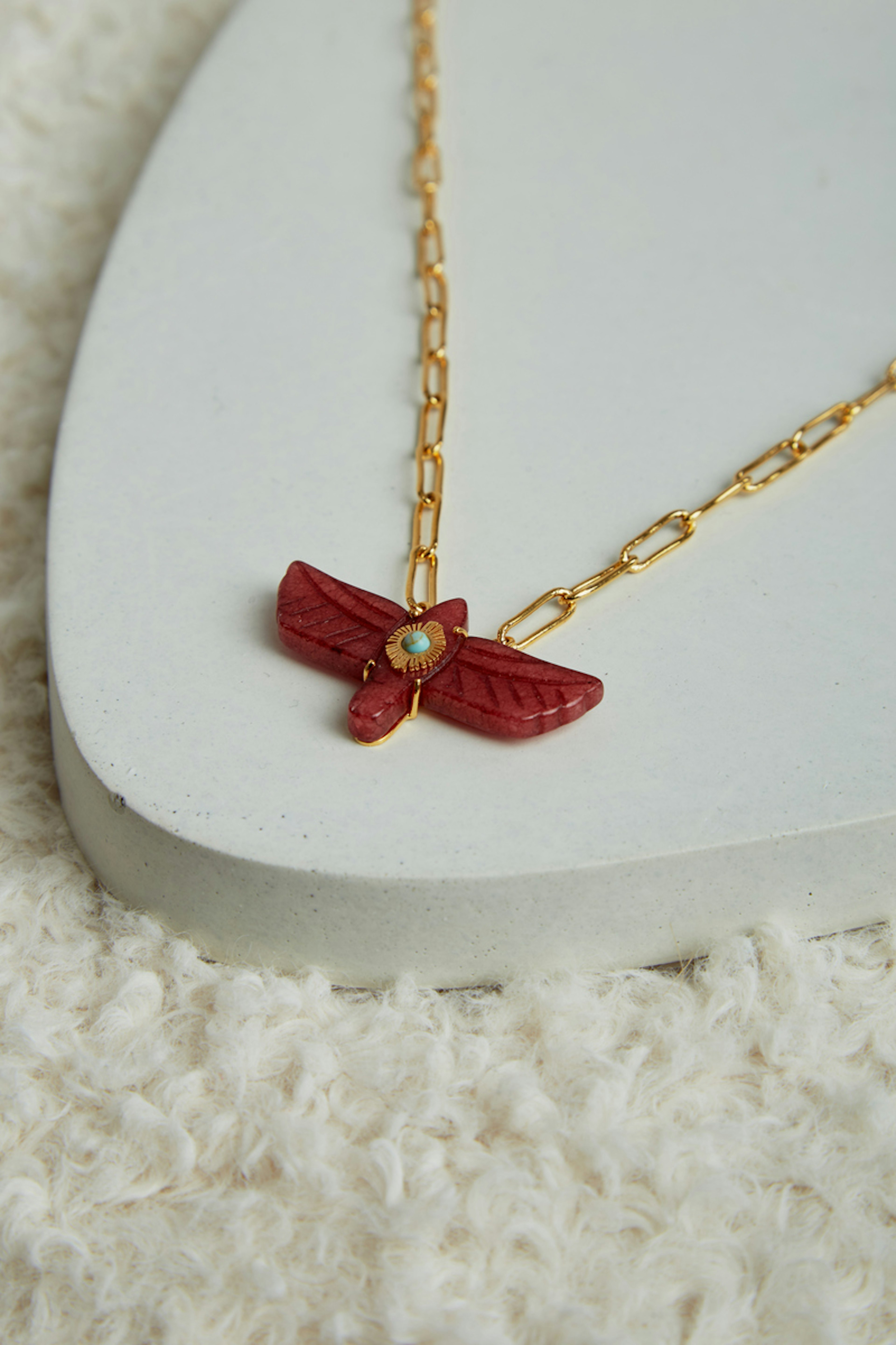 Joli collier chaine dรฉcorรฉ d'un aigle en pierre topaze ornรฉ d'un cabochon couleur turquoise. Ces aigles rappellent les oiseaux des tribus Zuni qui occupaient autrefois le nouveau Mexique et l'Arizona.