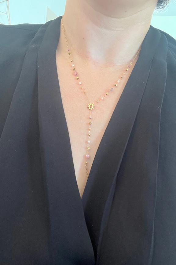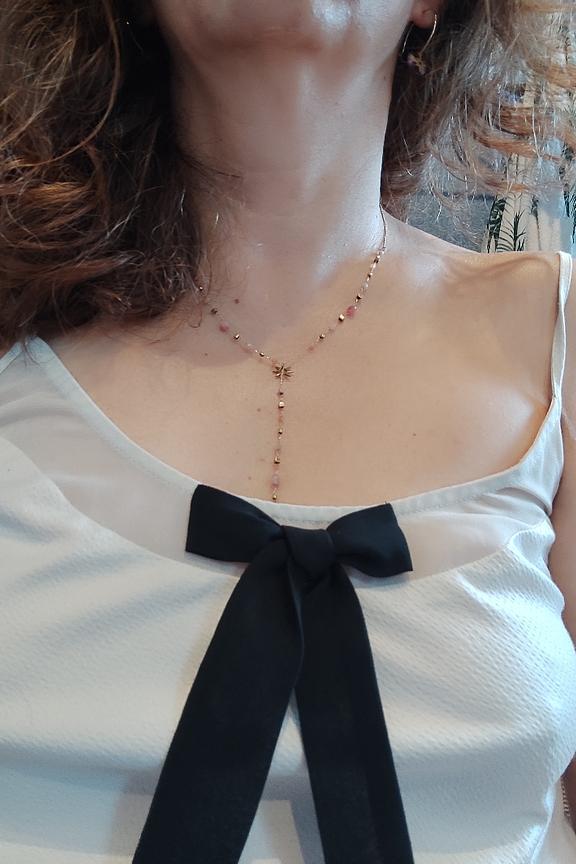 โข Collier dorรฉ avec chaรฎne dรฉcorรฉe de pierres roses, billes et รฉtoiles dorรฉes โข Conรงu en acier inoxydable