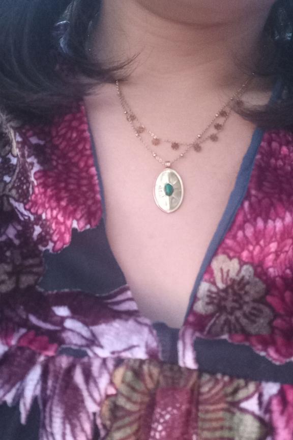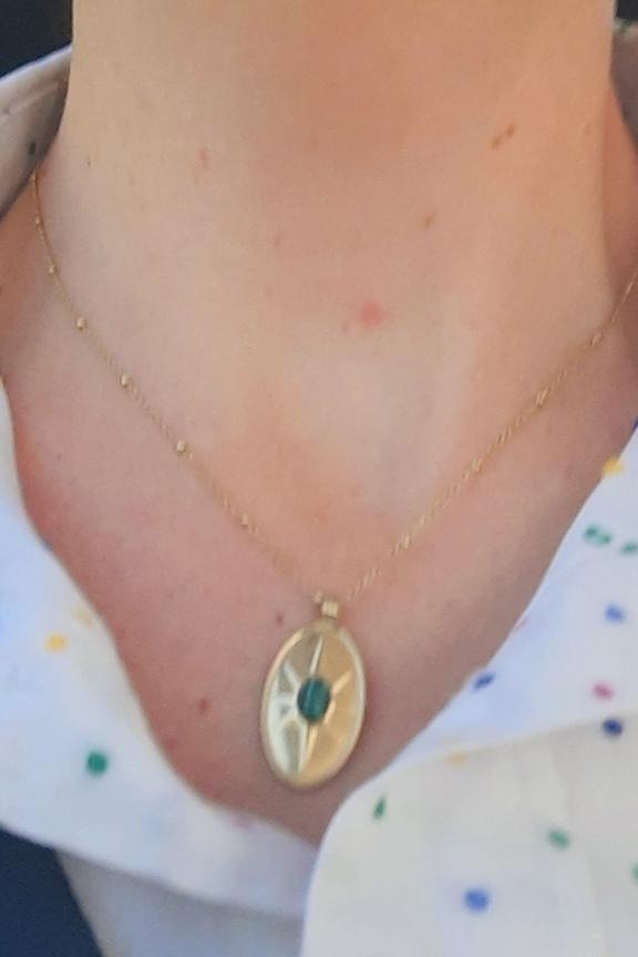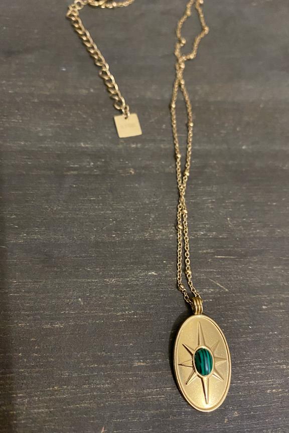 โข Collier en acier inoxydable dorรฉ โข Mรฉdaille ovale avec soleil dorรฉ โข Dรฉtail de pierre malachite verte