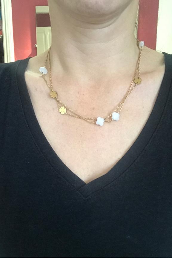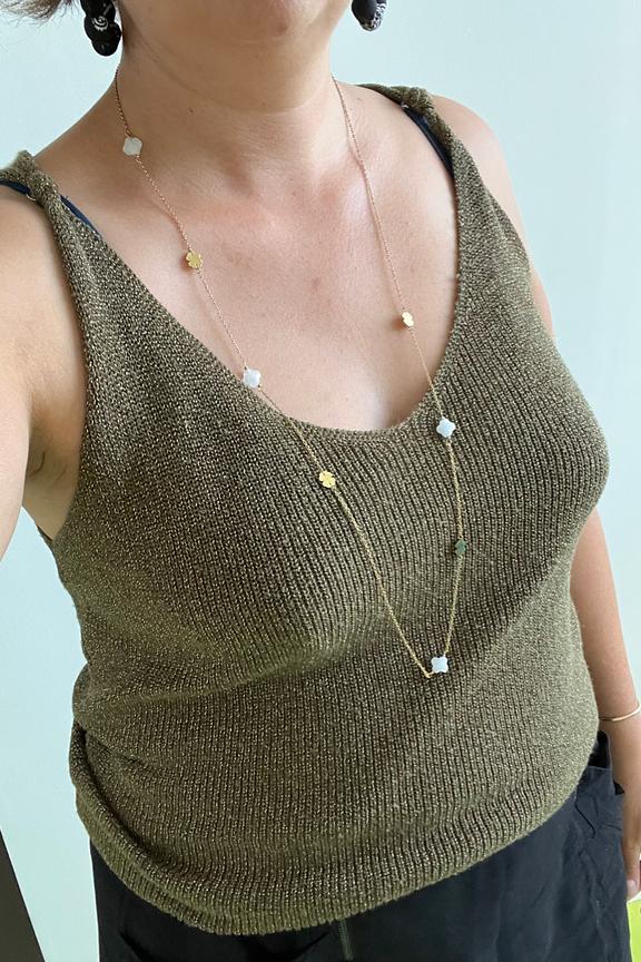 โข Collier ร chaรฎne fine โข Dรฉtails de pendentifs en forme de trรจfle le long de la chaรฎne โข Couleur dorรฉ โข Conรงu en acier inoxydable