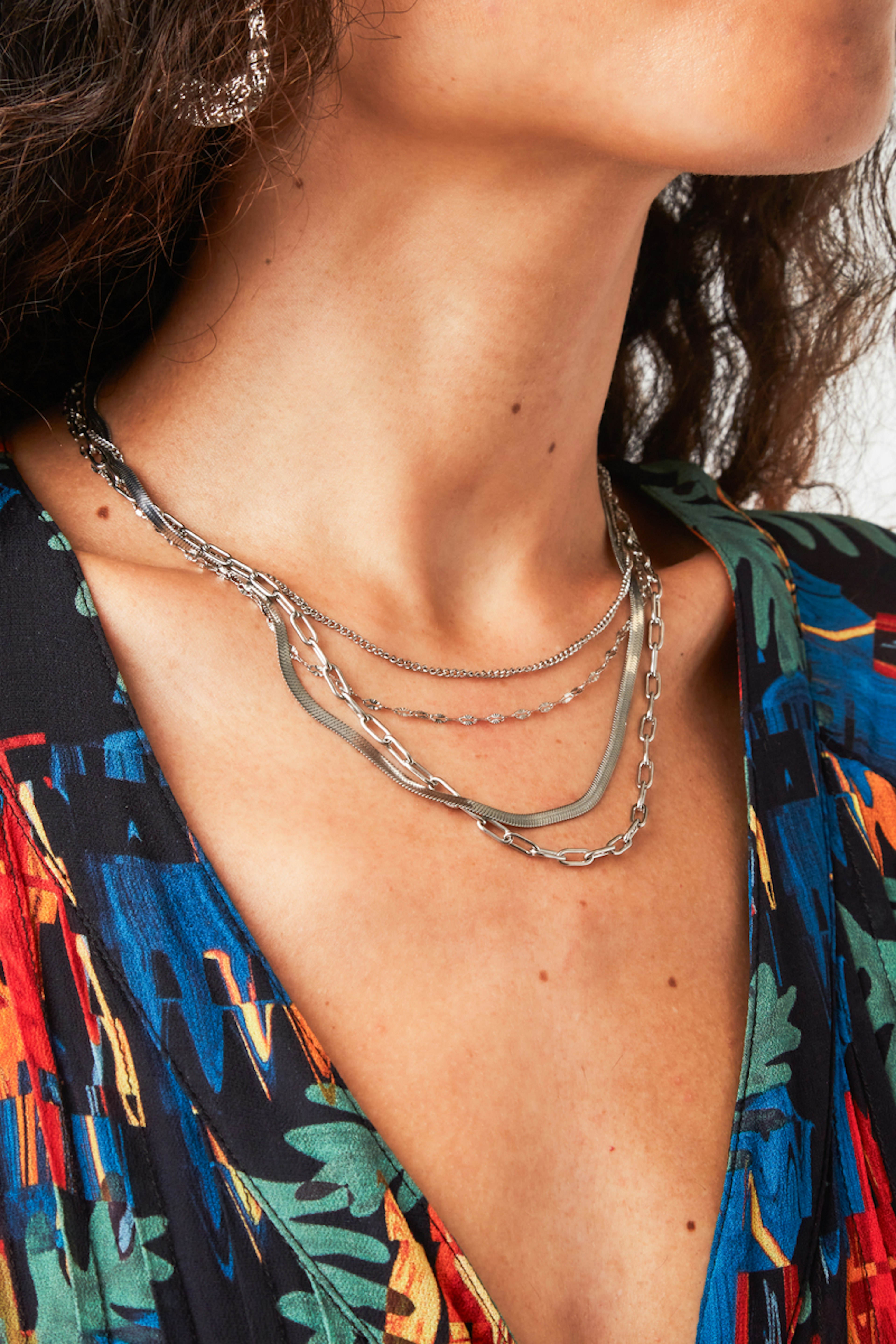 โข Collier argentรฉ multi rang โข Assemblage de quatre types de chaรฎne pour un effet de superposition โข Bijou en acier inoxydable