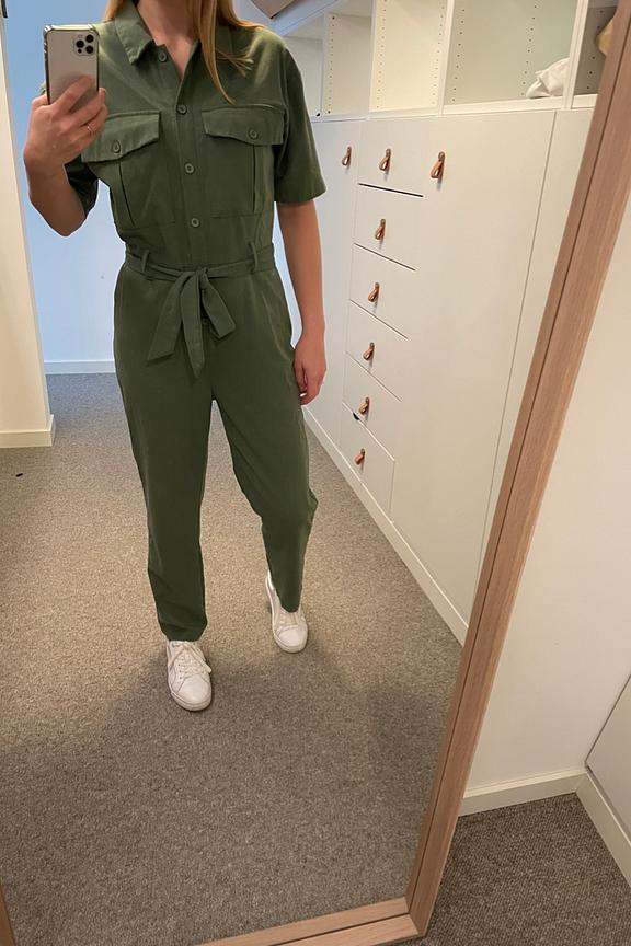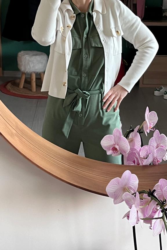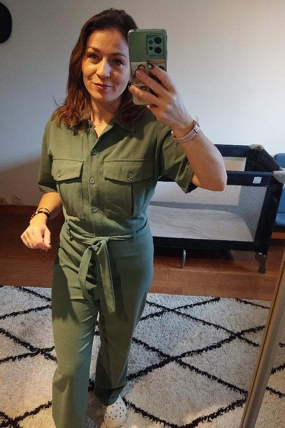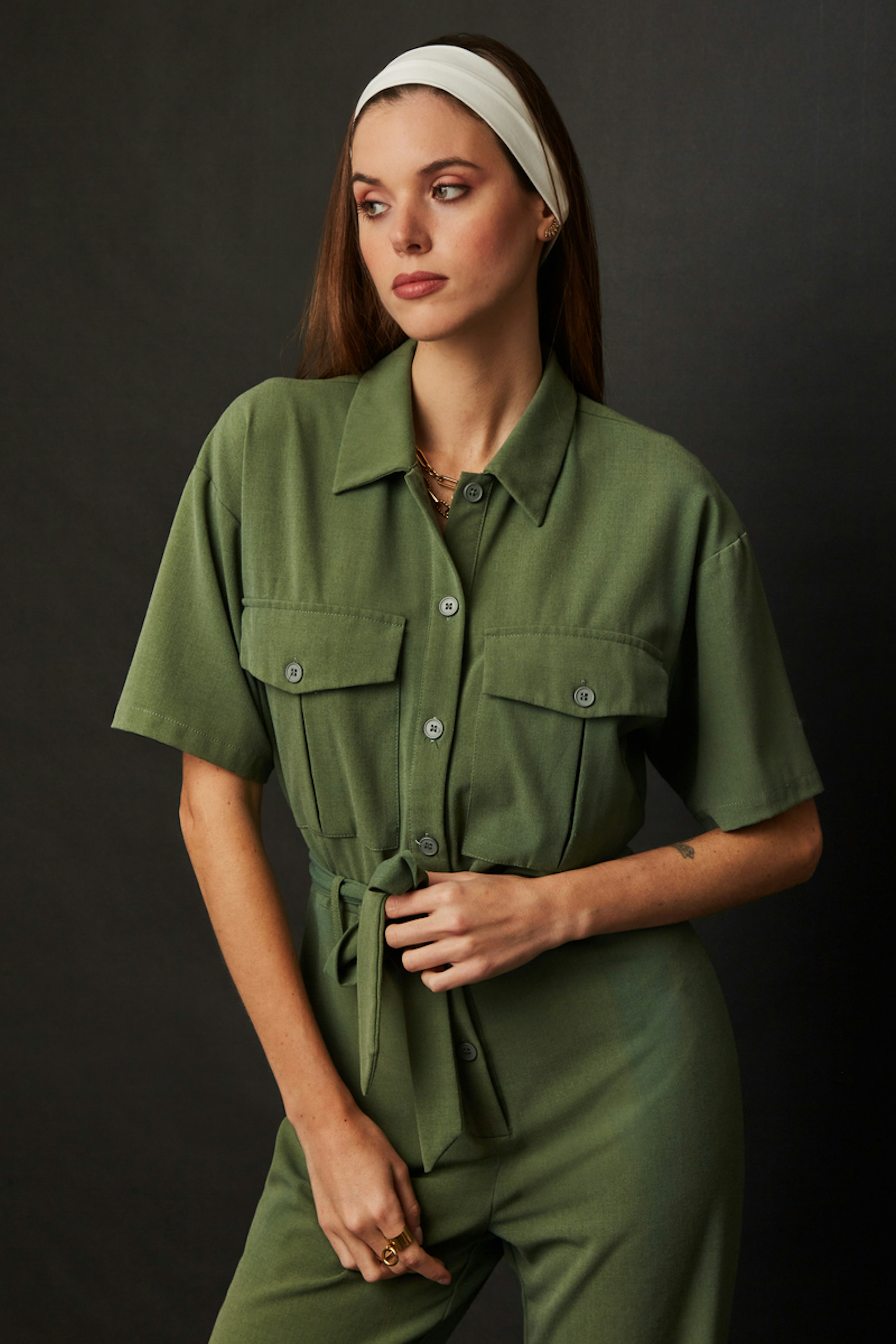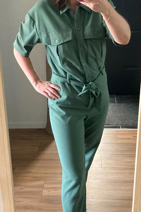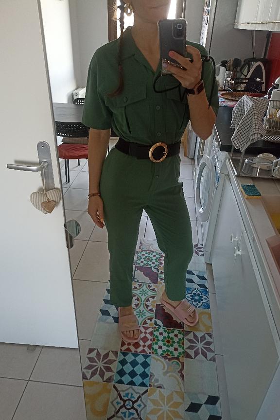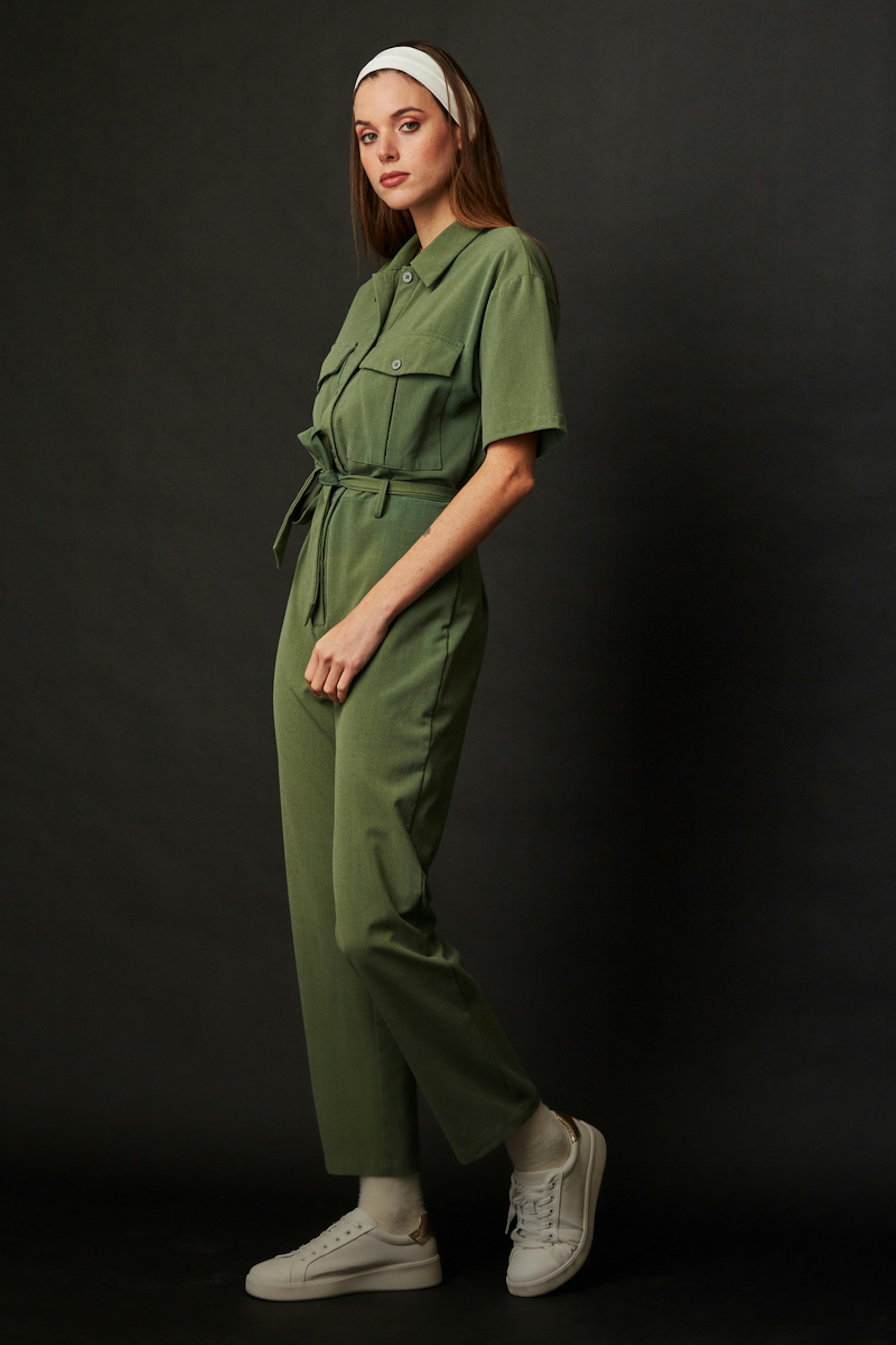 โข Combinaison pantalon vert menthe โข Manches courtes รฉvasรฉes โข Col chemise avec patte de boutonnage โข Ceinture en tissu ton sur ton โข Jambes droites โข Coupe mom โข Poches plaquรฉes boutonnรฉes