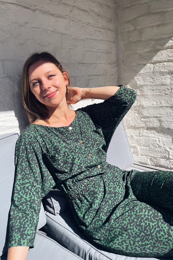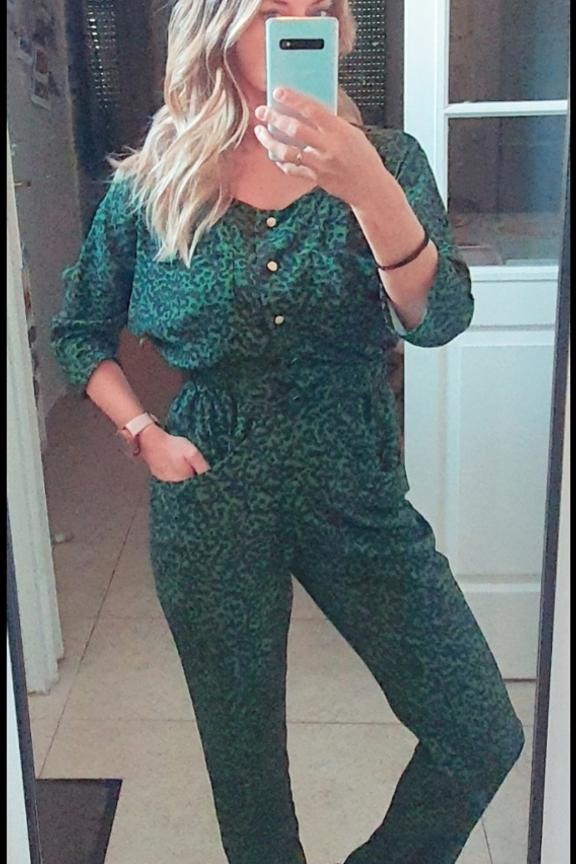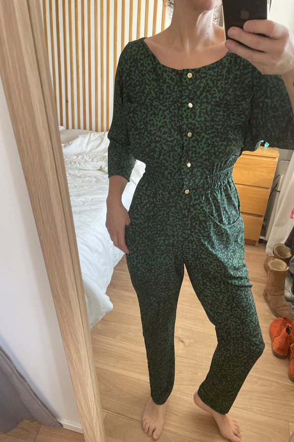 โข Combinaison pantalon โข Encolure bateau โข Manches 3/4 โข Ouverture devant par 5 pressions dorรฉes โข Taille รฉlastiquรฉe โข Deux poches plaquรฉes au niveau de la poitrine et sur les fesses โข Deux grandes poches arrondies sur les cรดtรฉs devant
