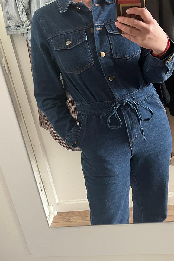 Optez pour des bottines en cuir et un sac à main structuré pour un look chic. Parfait en toute saison. • Combinaison en denim • Taille élastiquée avec lien • Manches longues • Poches poitrine à rabat • Boutonnage à l'avant