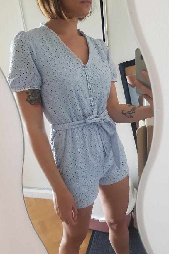 On craque pour cette combishort estivale conรงue en coton brodรฉ bleu ciel. A porter avec de jolies sandales et un panier.