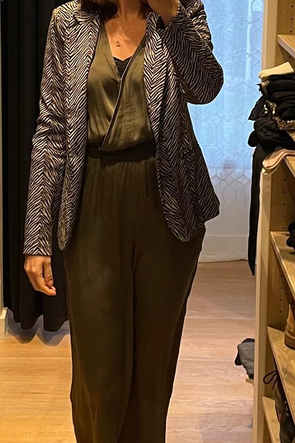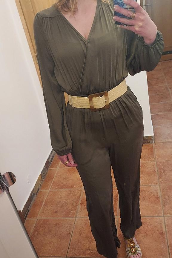 Ajoutez une ceinture dorée et des boucles d'oreilles pour une touche chic. Parfait en toute saison. • Combinaison fluide • Décolleté cache-cœur • Taille élastiquée • Manches longues • Couleur kaki sophistiquée