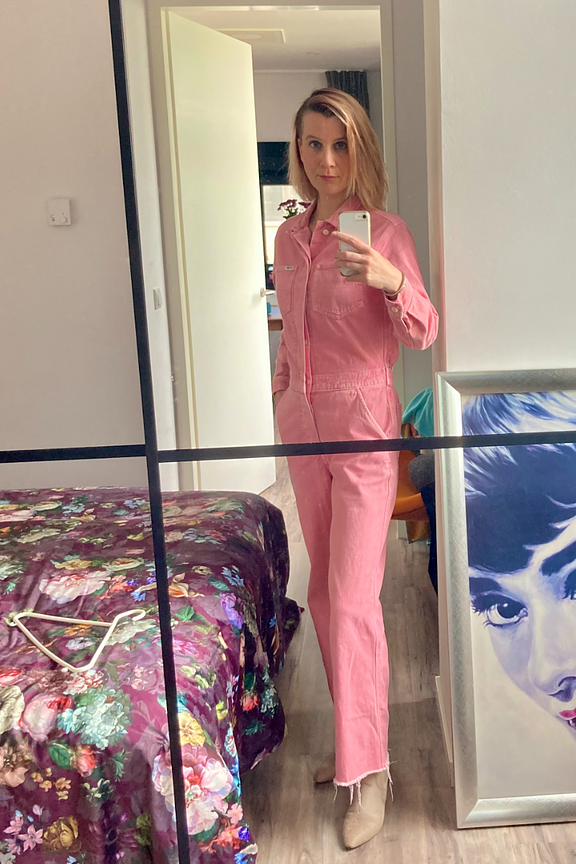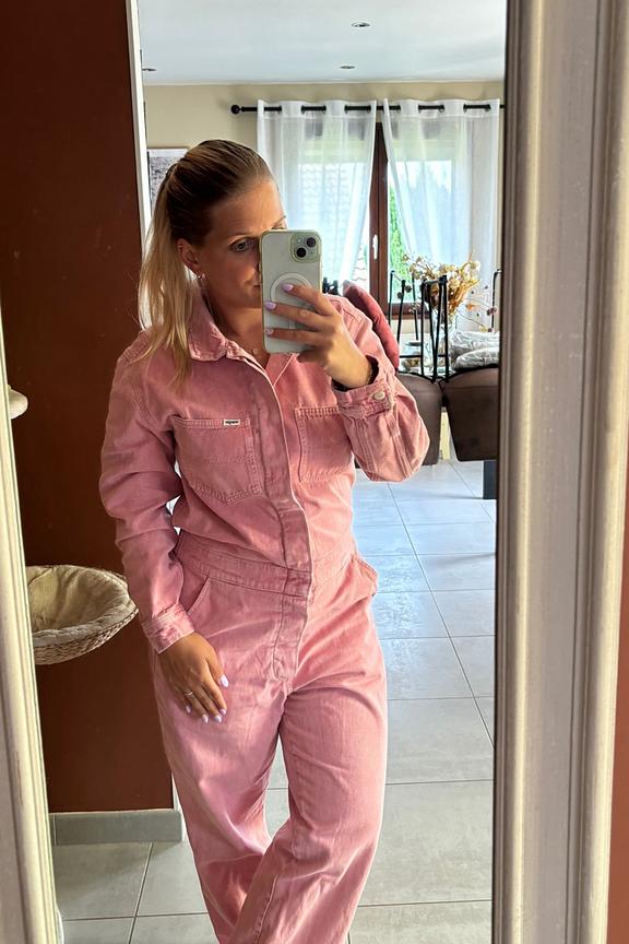 โข Combinaison pantalon en denim rose effet dรฉlavรฉ โข Col chemisier โข Patte de boutonnage โข Poches plaquรฉes poitrine โข Poches latรฉrales โข La longueur entrejambe est de 72 cm โข Coupe flare oversize, favoriser une taille en dessous si vous aimez les coupes prรจs du corps