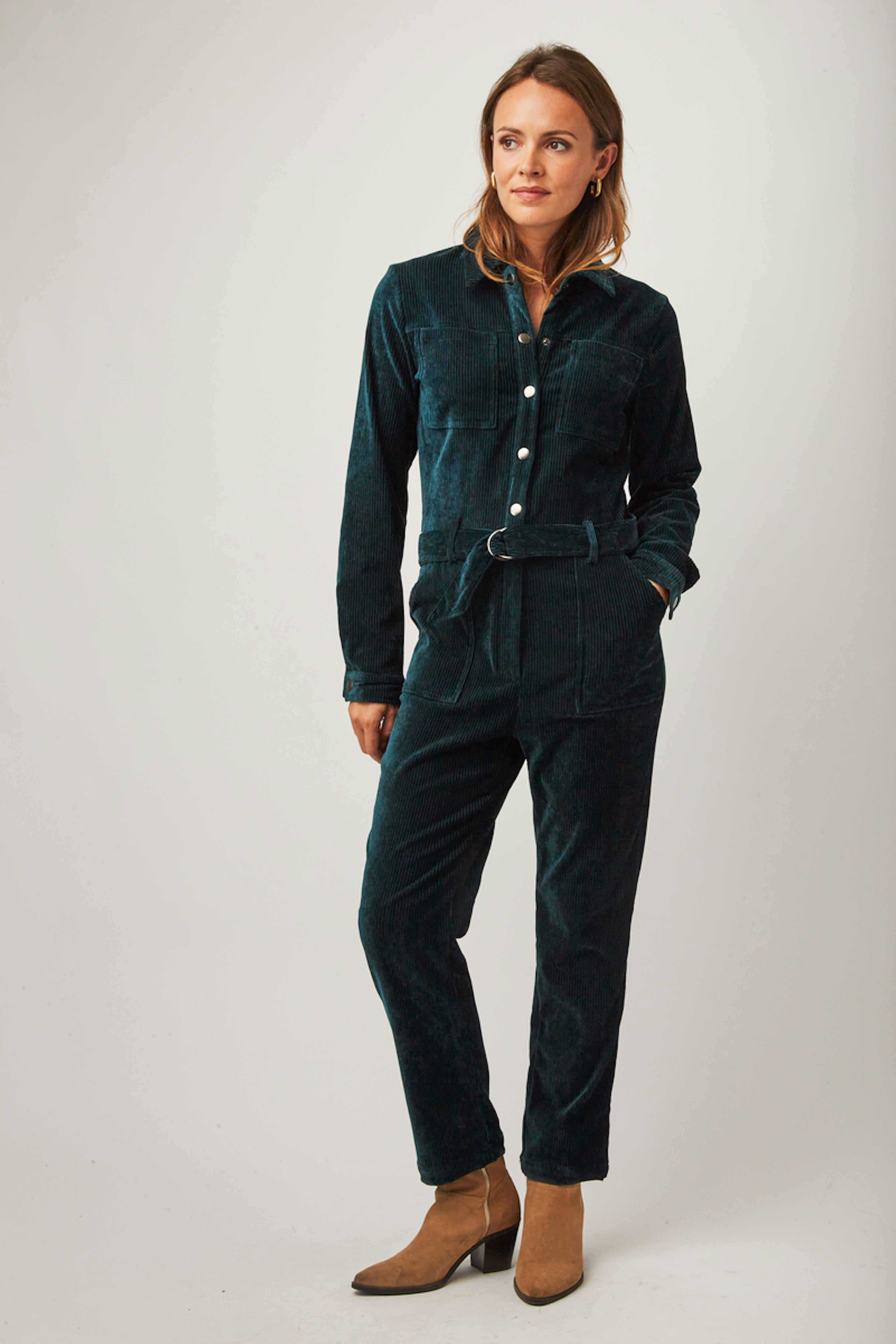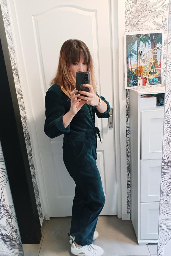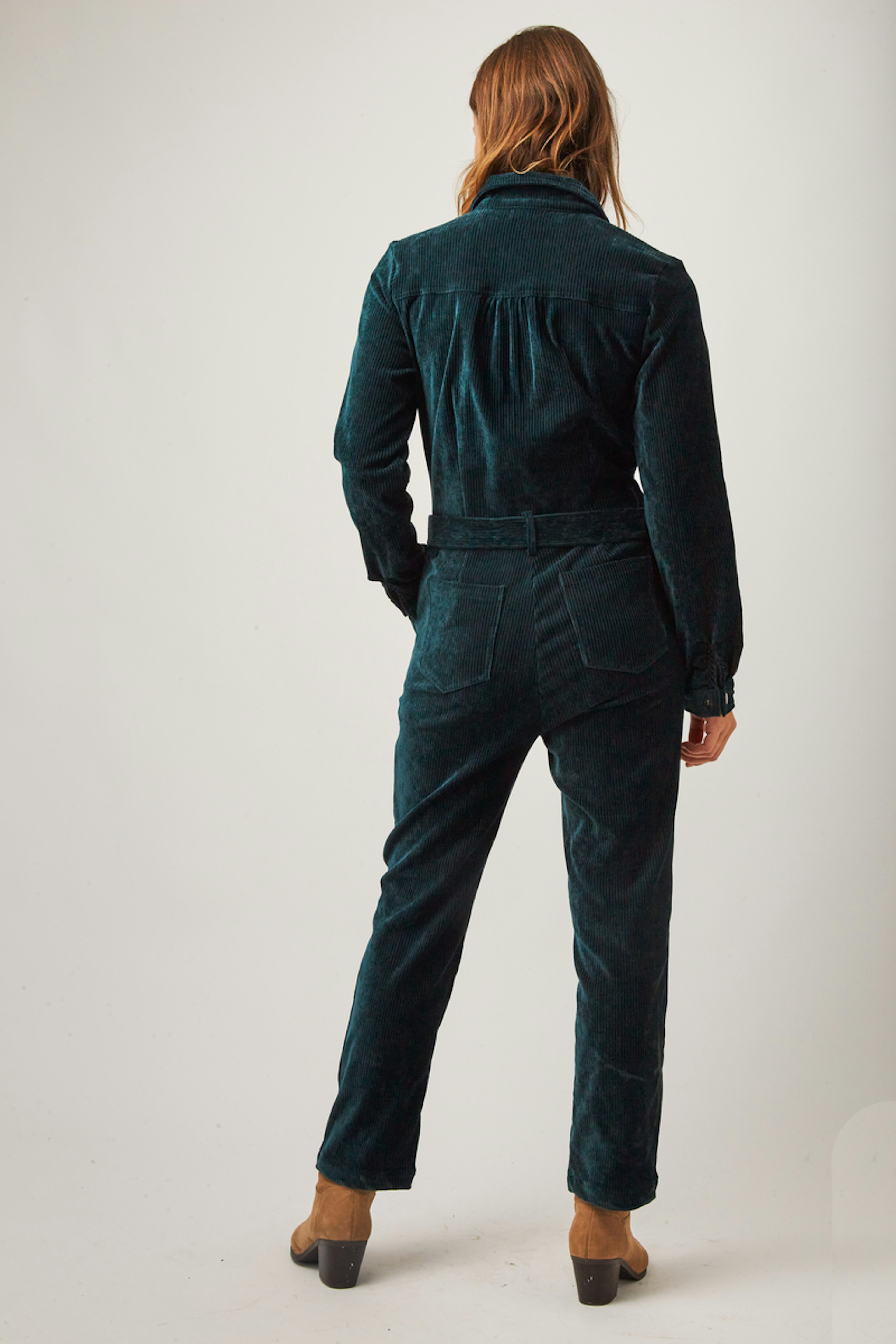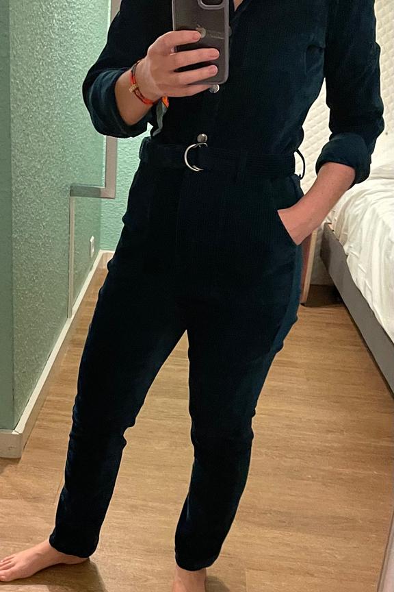• Combinaison workwear en velours vert • Col classique • Ceinture amovible avec boucle • Poches italiennes devant et poches plaquées au dos • Deux poches plaquées à la poitrine • Patte de boutonnage devant et zip • Longueur côté jambe 97,5cm (pour un S/36) • Composition en coton mélangé