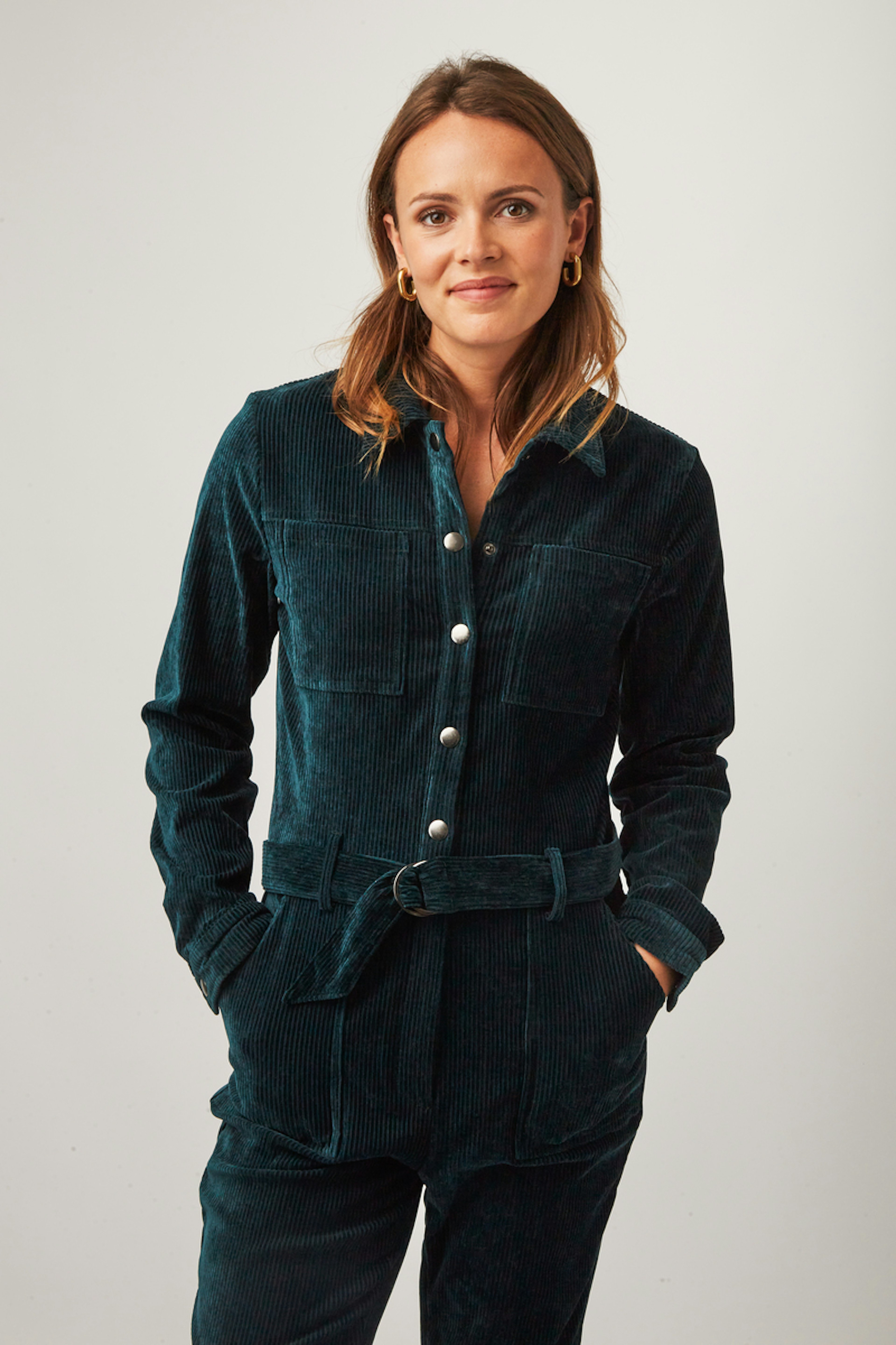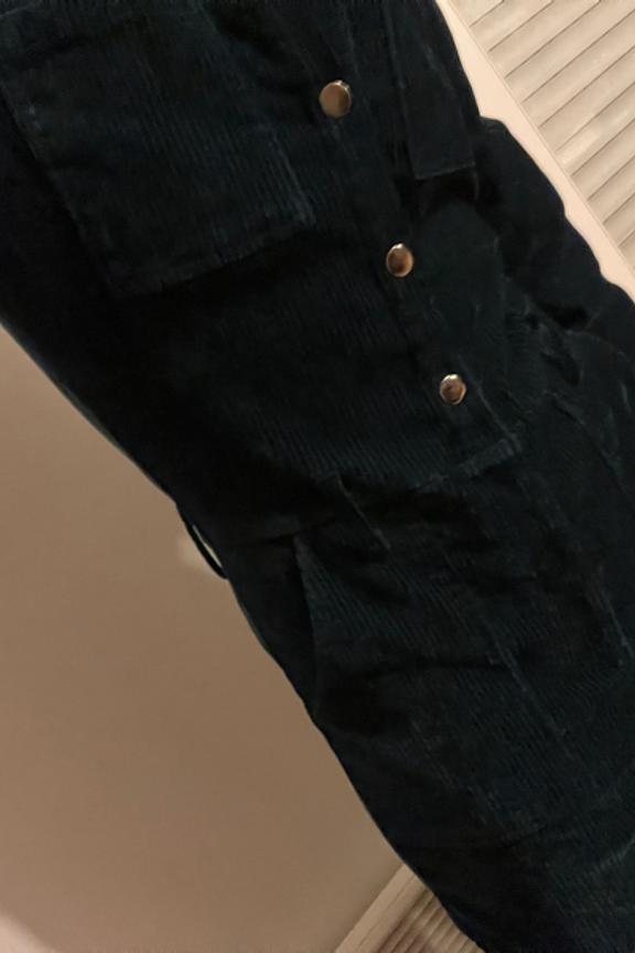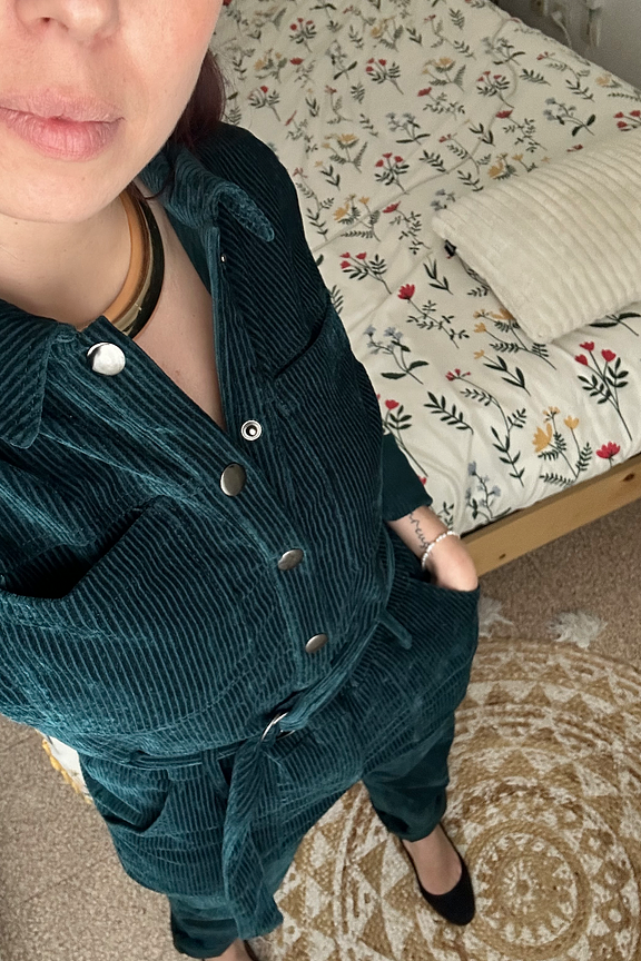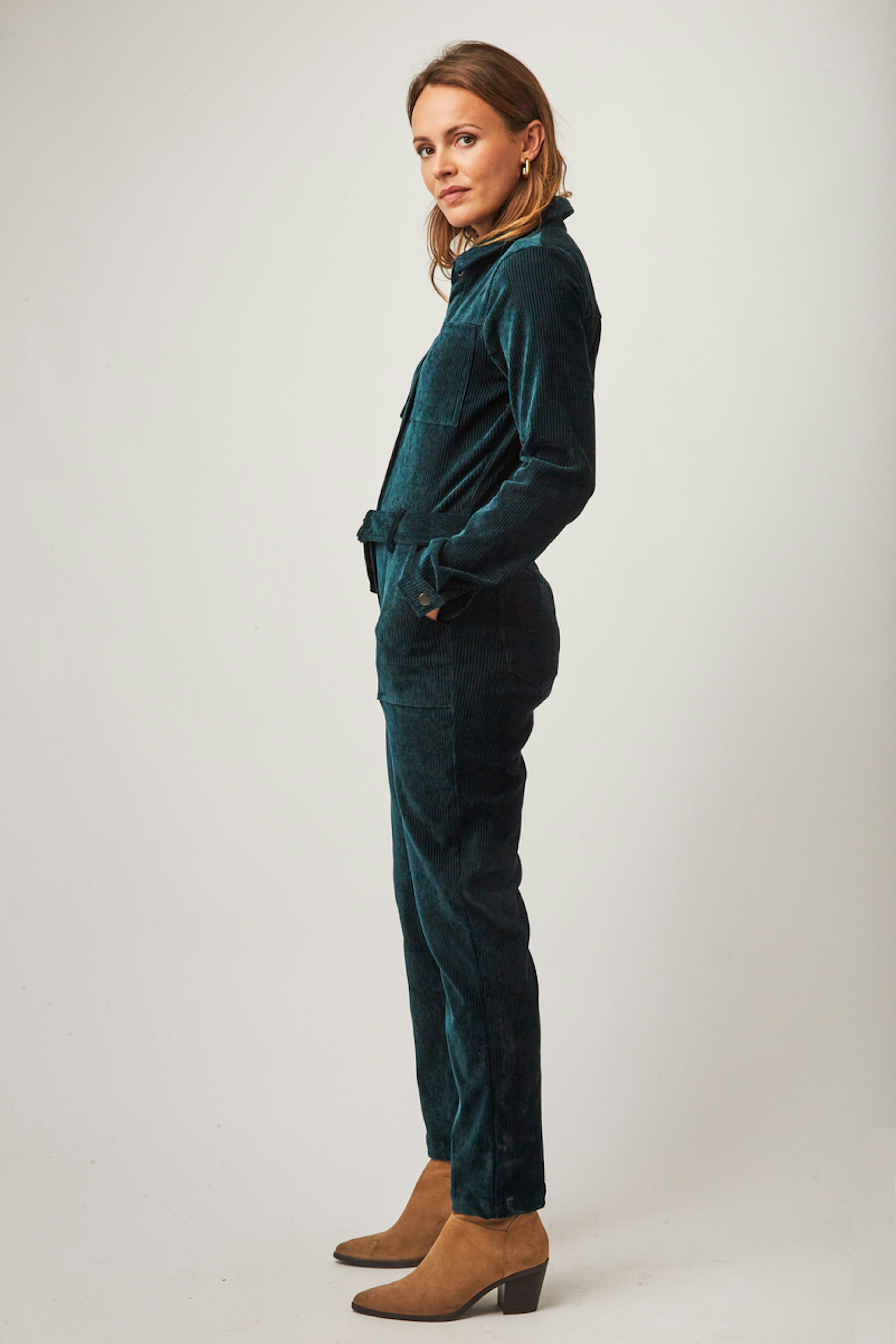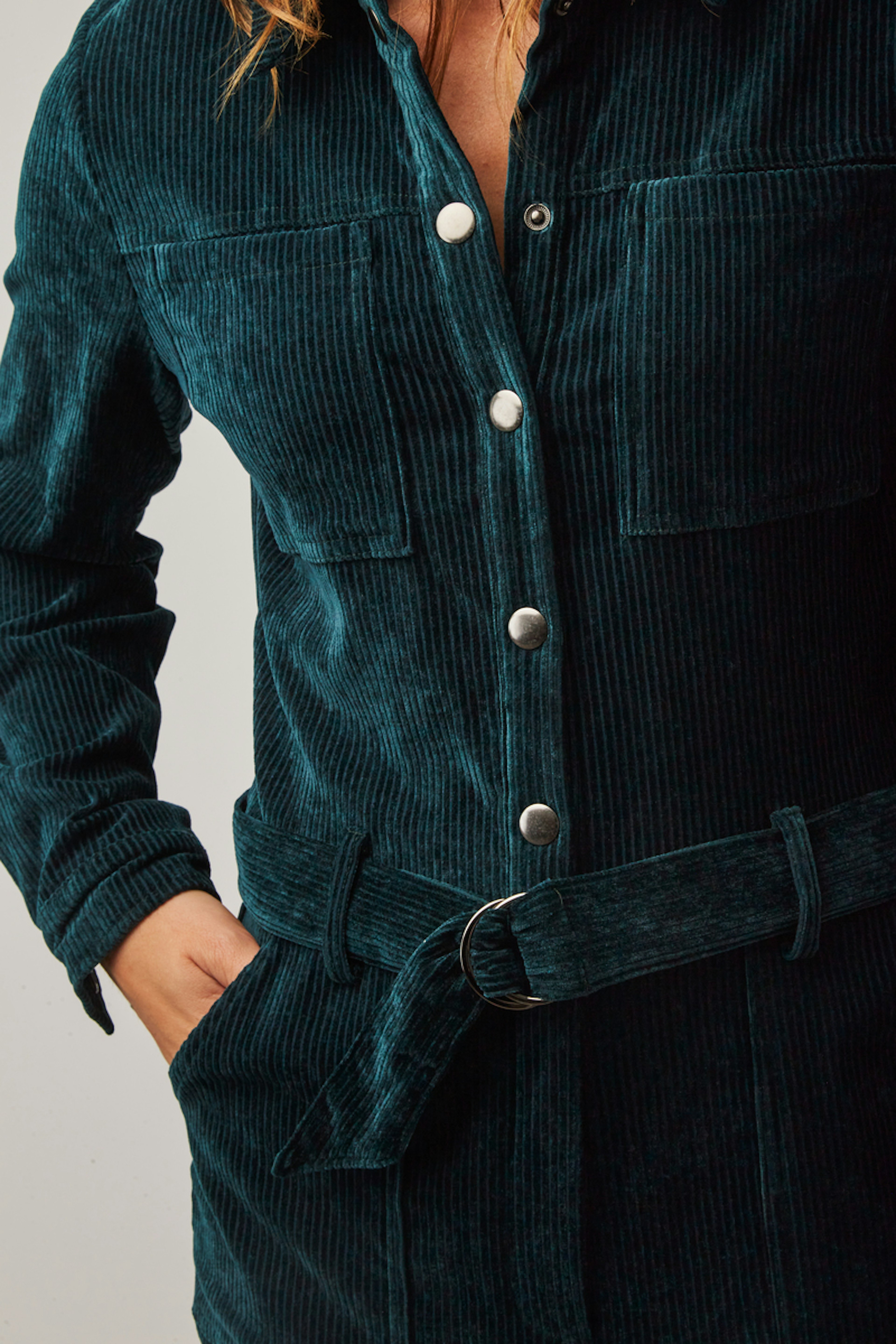 • Combinaison workwear en velours vert • Col classique • Ceinture amovible avec boucle • Poches italiennes devant et poches plaquées au dos • Deux poches plaquées à la poitrine • Patte de boutonnage devant et zip • Longueur côté jambe 97,5cm (pour un S/36) • Composition en coton mélangé