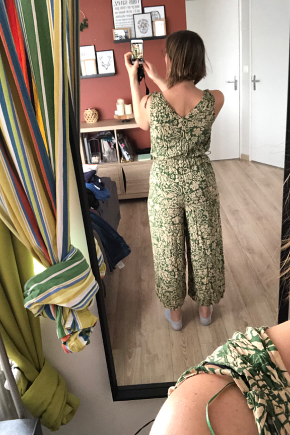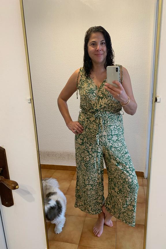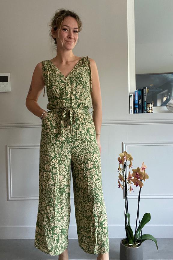 โข Combinaison pantalon sans manches verte imprimรฉe โข Rubans aux รฉpaules โข Taille cintrรฉe par une ceinture โข Idรฉale pour l'รฉtรฉ avec des sandales en cuir