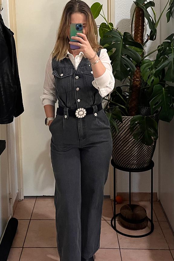 Pour un look chic et décontracté, associez cette combinaison en denim avec des sandales à talons et un sac en osier pour une touche bohème. Ajoutez quelques bijoux dorés pour une allure sophistiquée. Parfait en toute saison. • Combinaison en denim • Coupe sans manches • Évasée au niveau des jambes • Boutons sur le devant • Poches poitrine avec rabats