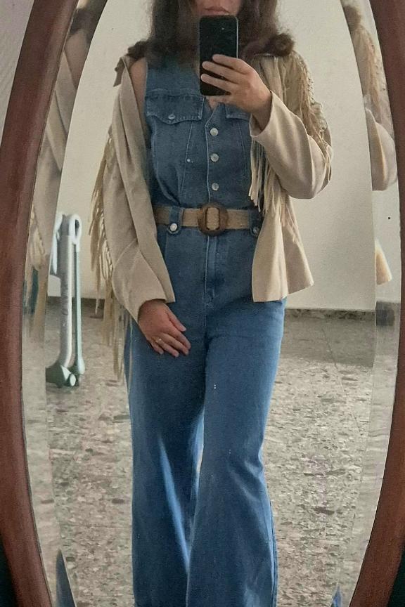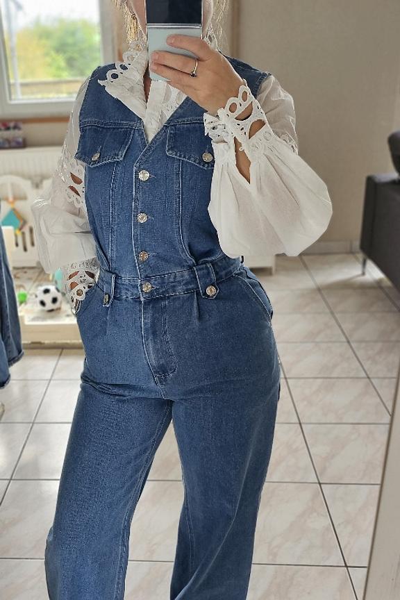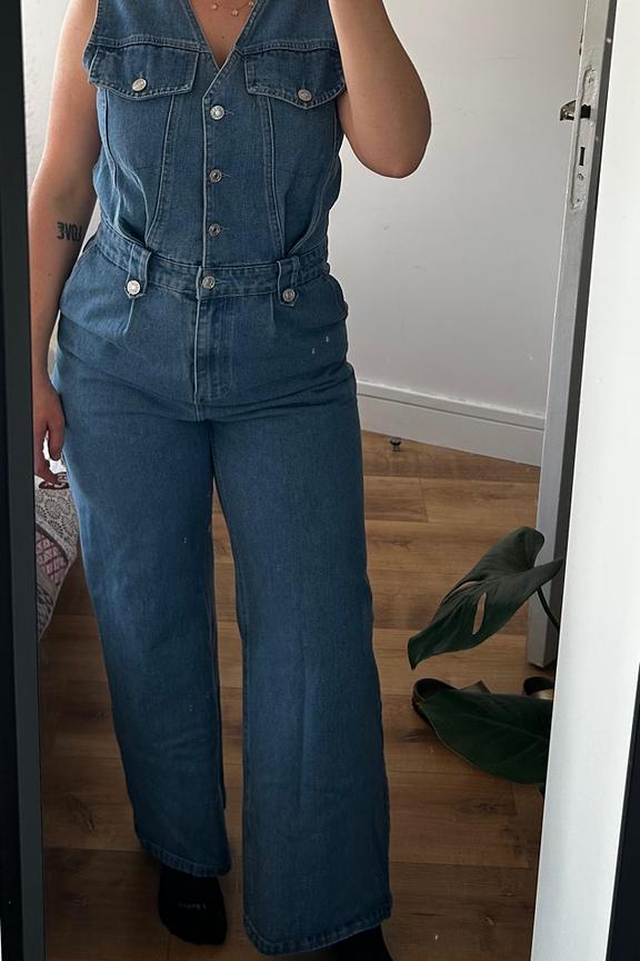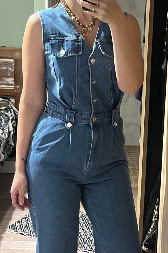 Pour un look chic et dรฉcontractรฉ, associez cette combinaison en denim avec des sandales ร talons et un sac en osier pour une touche bohรจme. Ajoutez quelques bijoux dorรฉs pour une allure sophistiquรฉe. Parfait en toute saison. โข Combinaison en denim โข Coupe sans manches โข รvasรฉe au niveau des jambes โข Boutons sur le devant โข Poches poitrine avec rabats