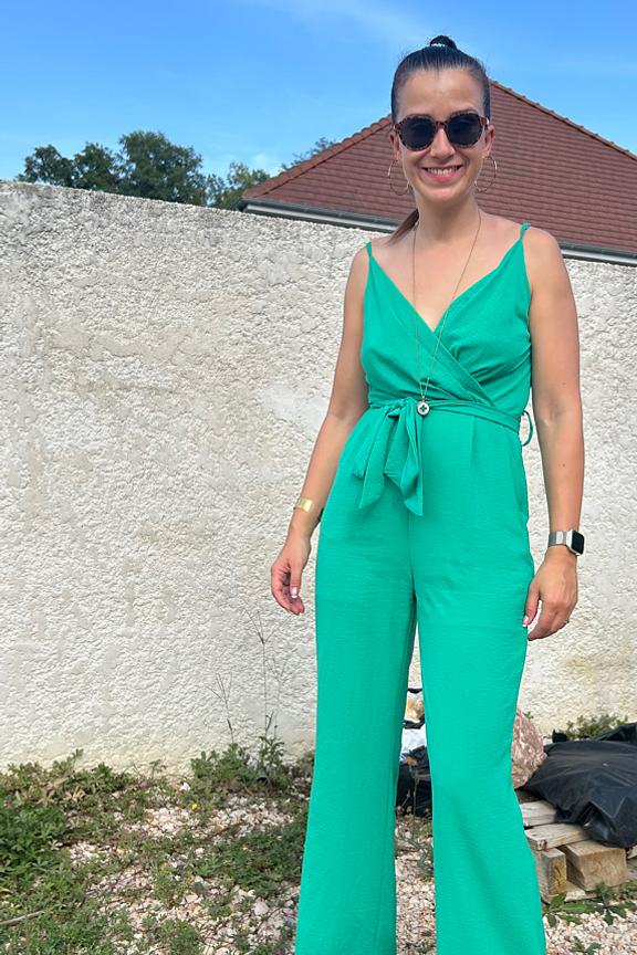 Pour une allure estivale et élégante, associez cette combinaison verte avec des sandales dorées et des boucles d'oreilles pendantes. Parfaite pour les soirées d'été et les événements en plein air. • Combinaison fluide • Décolleté en V • Bretelles fines • Jambes larges