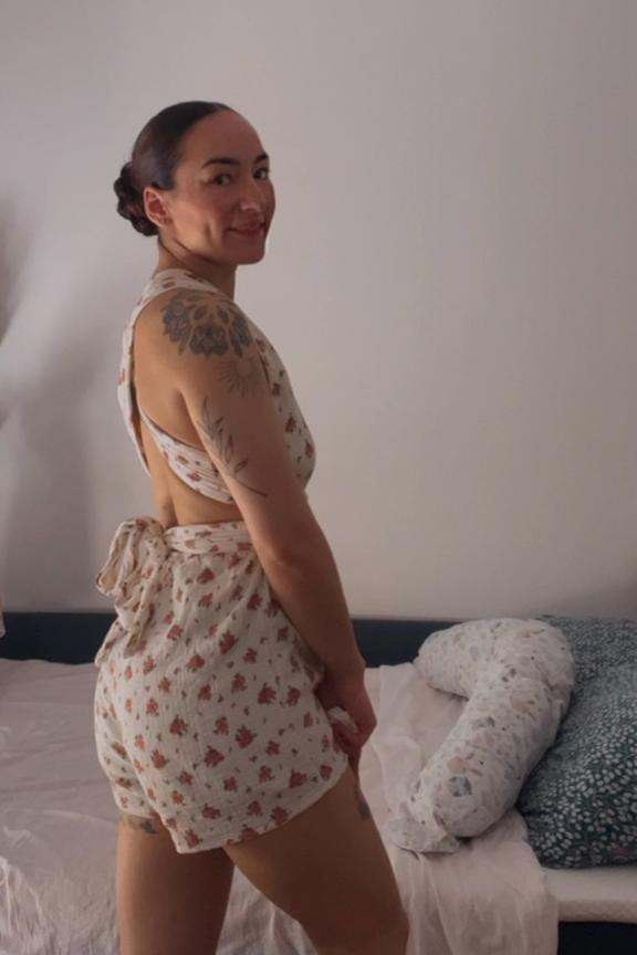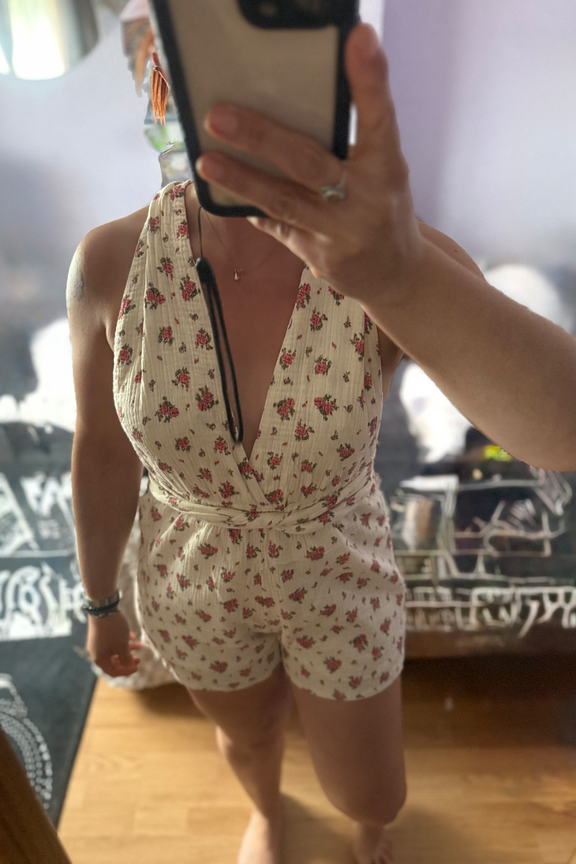 Léger et estival, cette combinaison sera parfaite avec des sandales dorées pour une journée ensoleillée. • Combishort courte à motif floral • Dos nu noué • Coupe ample • Taille ajustable • Col en V flatteur • Taille cintrée élastique • Tissu 100% Coton