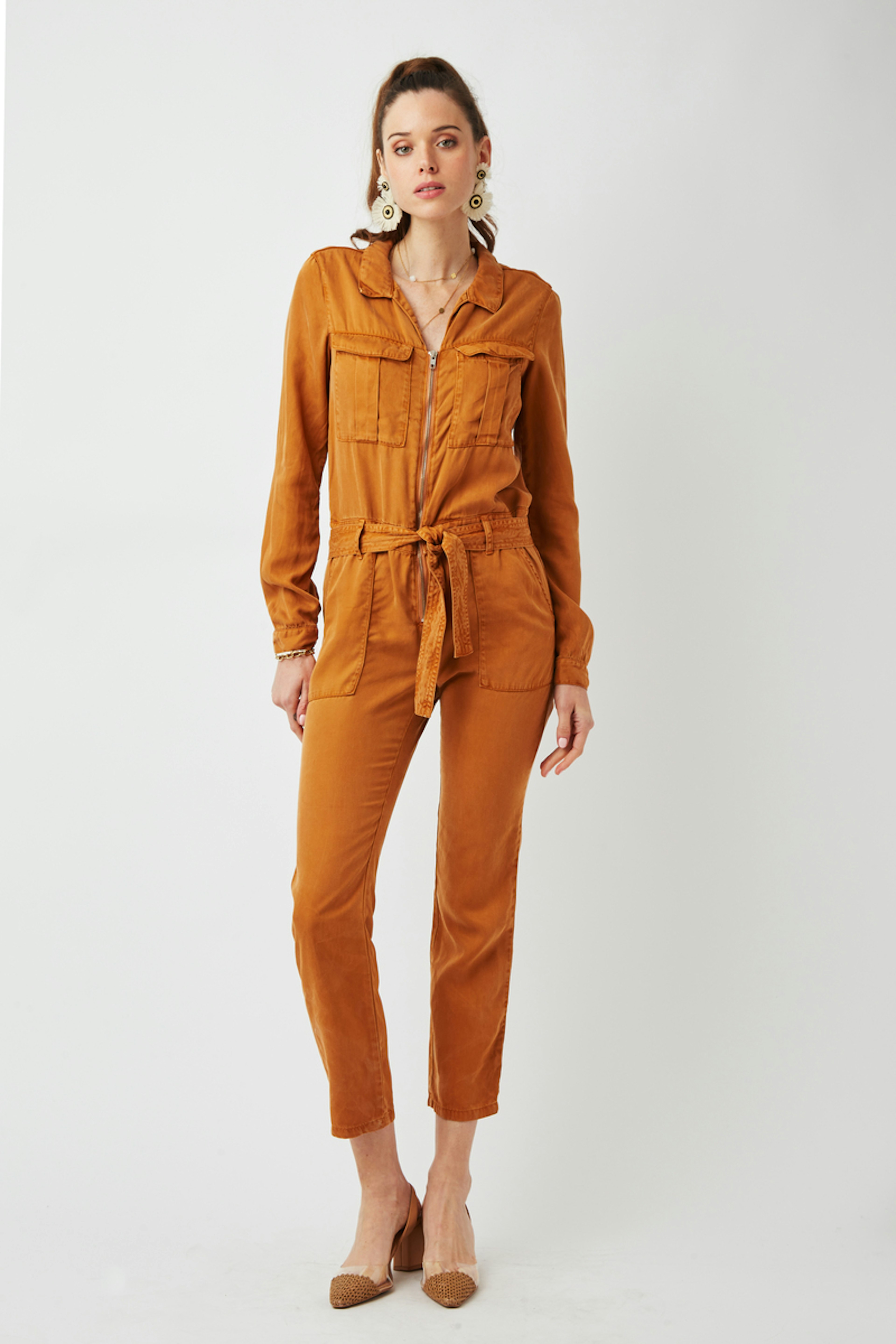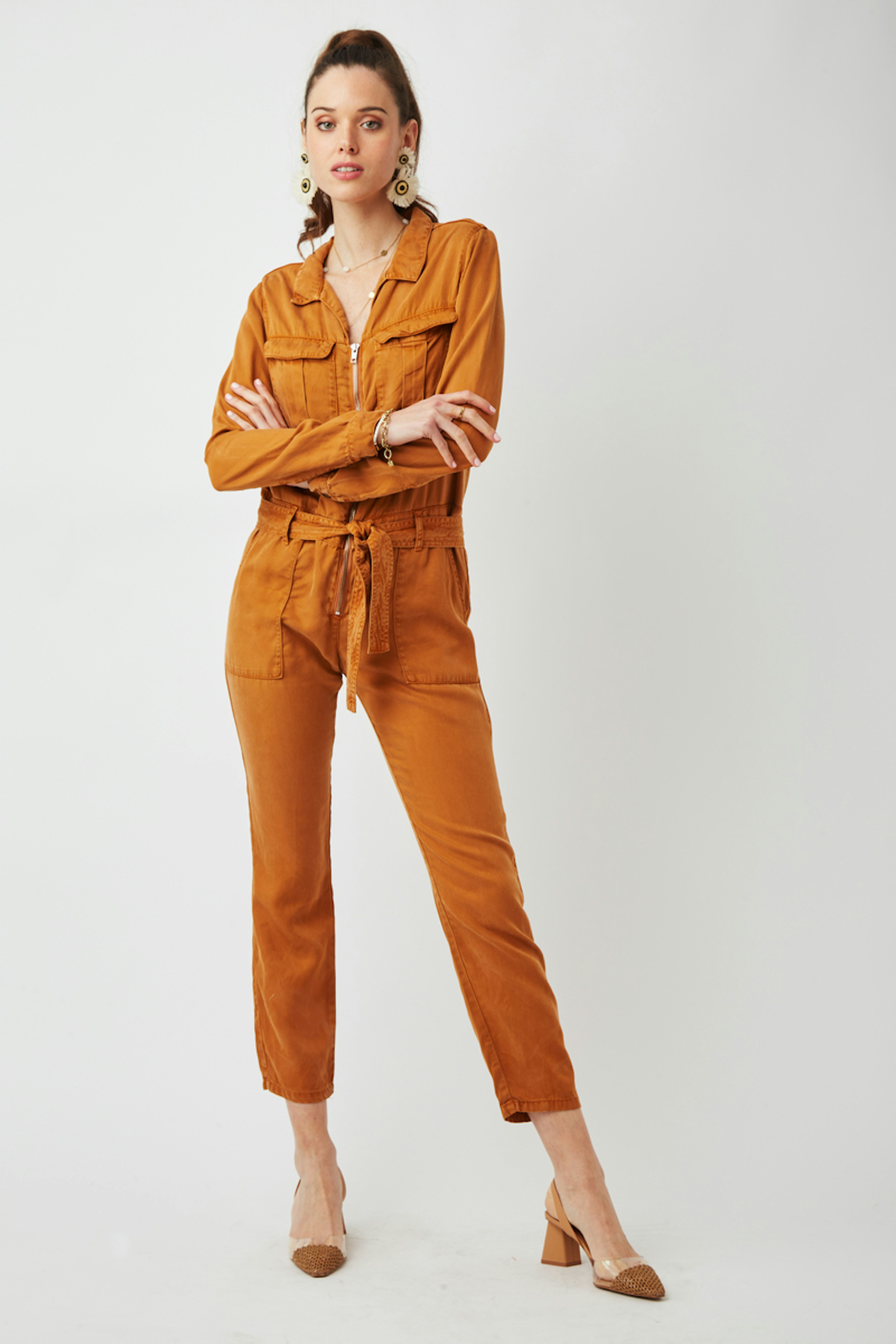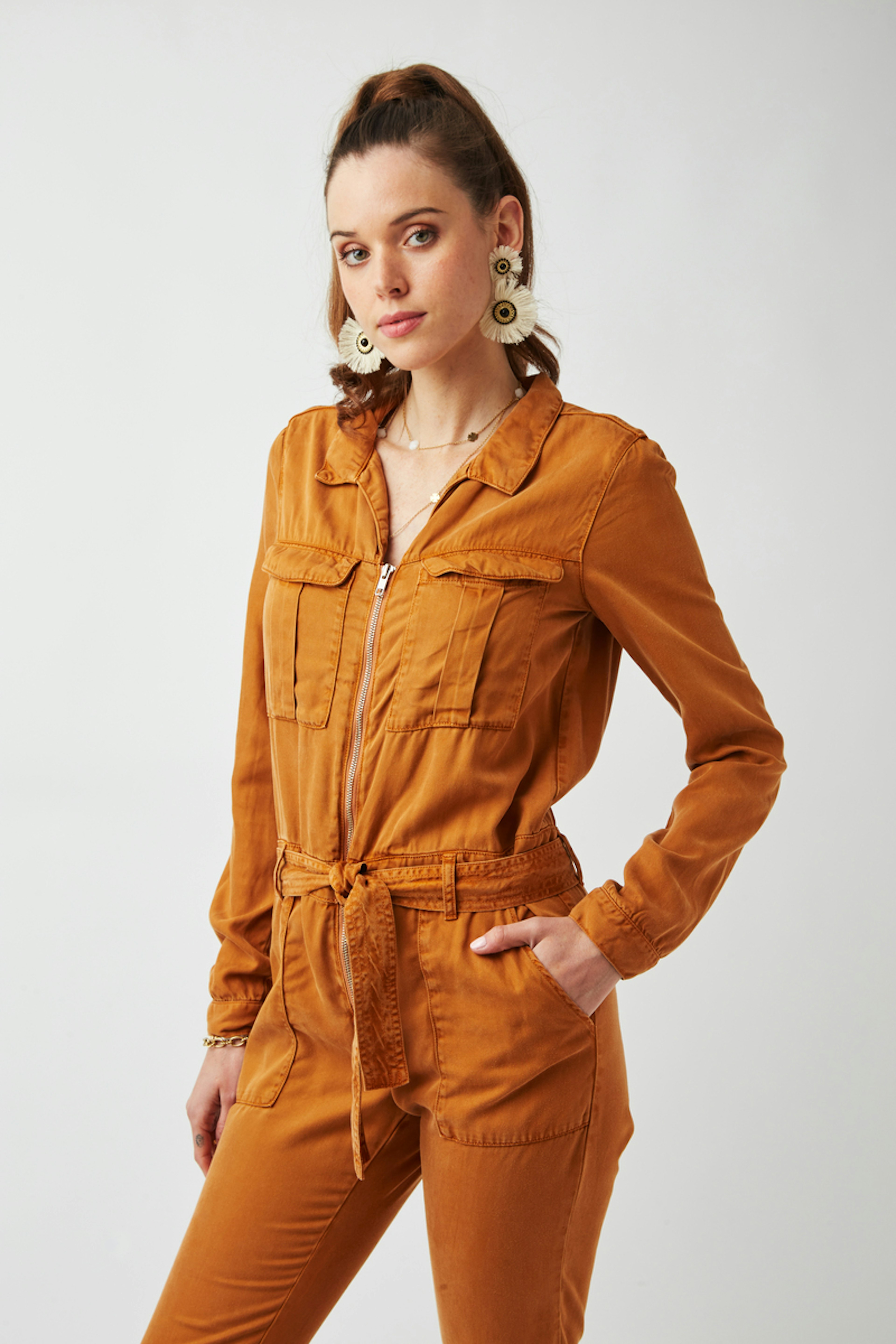 โข Combinaison ร manches longues marron conรงue en tencel โข Ceinture nouรฉe ร la taille โข Lien de serrage sur la manche โข Poche poitrine plaquรฉe ร rabat sur le devant โข 2 poches italienne ร lโavant โข Poche ร zip sur lโarriรจre โข Ouverture par zip