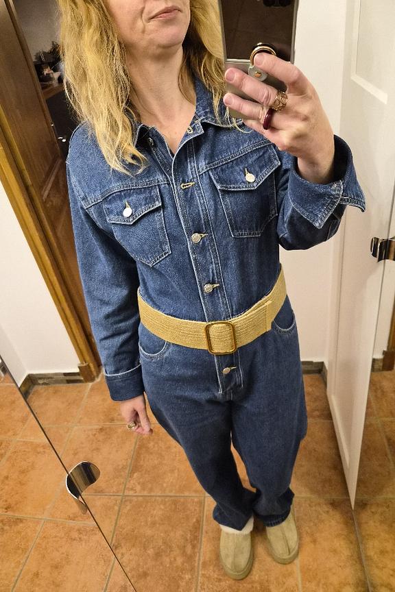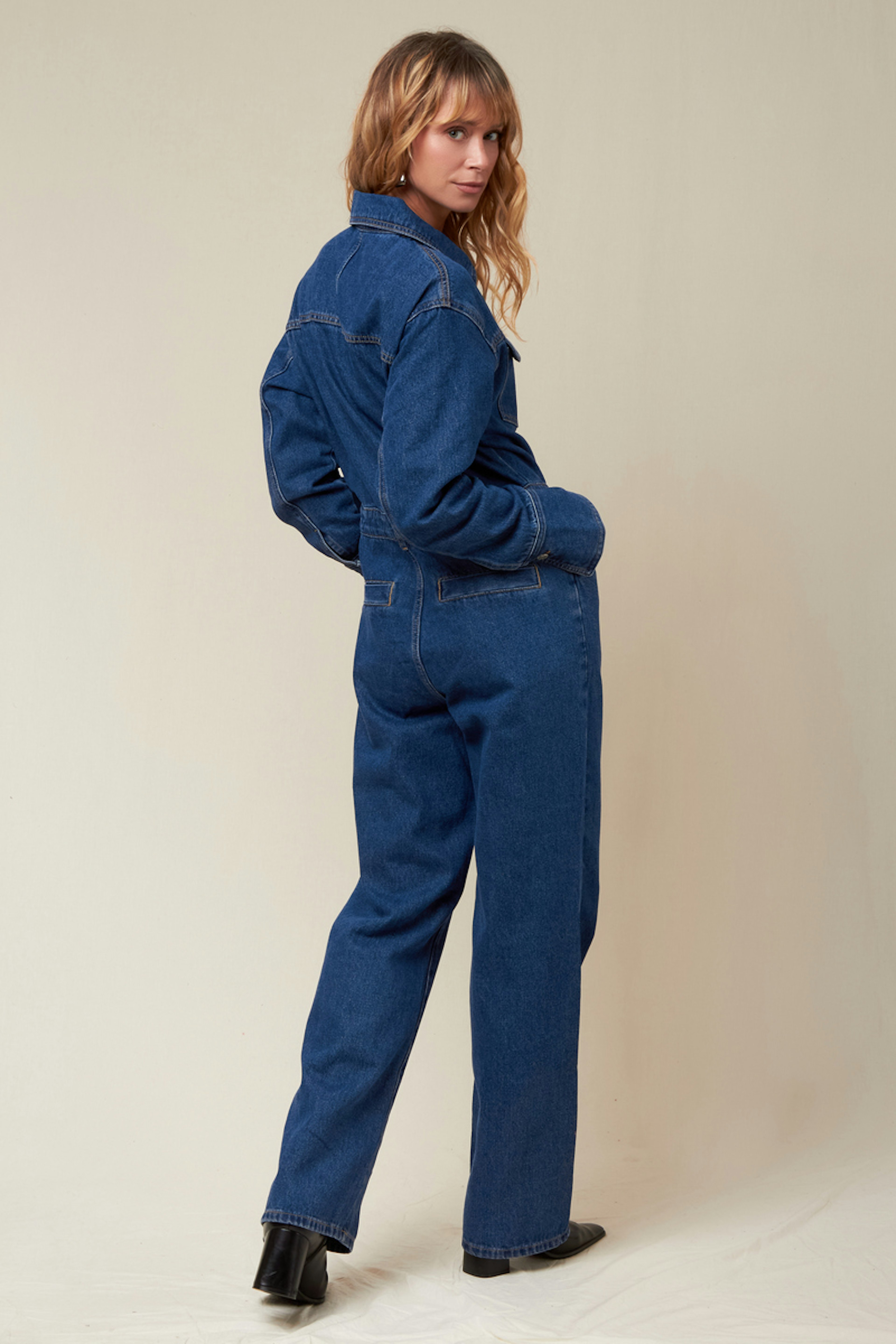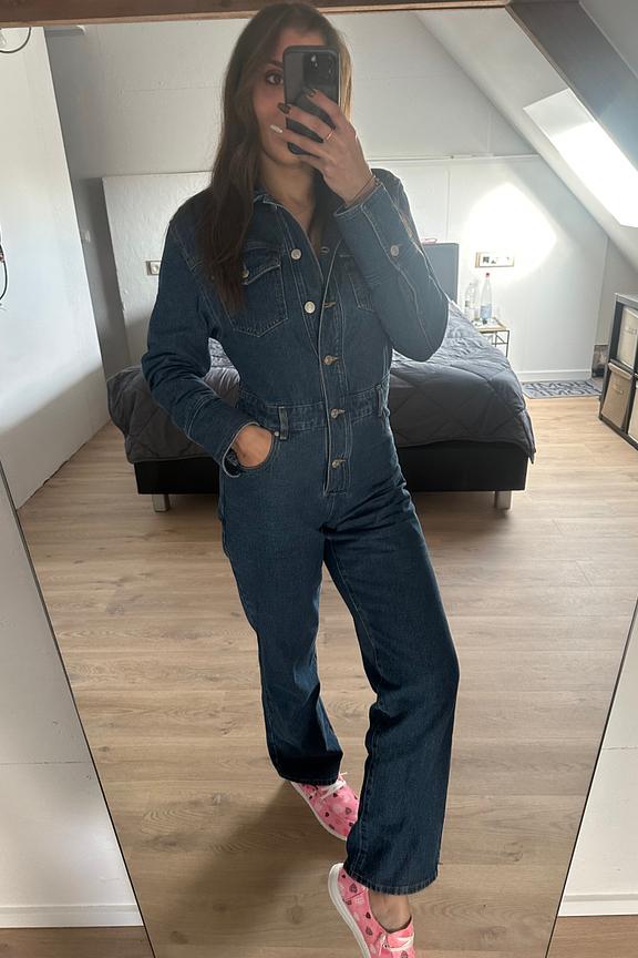 Associez cette combinaison à des bottines en cuir noir pour un look élégant et moderne en plein hiver. • Combinaison en denim • Taille cintrée • Manches longues • Poches à rabat • Fermeture à boutons-pression