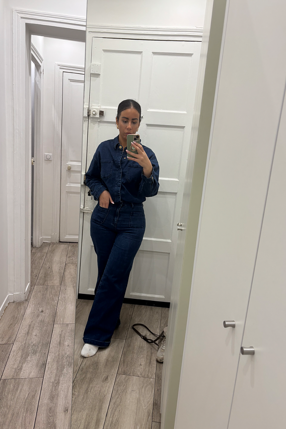 “J’adore, la coupe est très seyante. Seul souci avec la longueur car obligée de retourner le bas de pantalon avec mon mètre 58 😬”