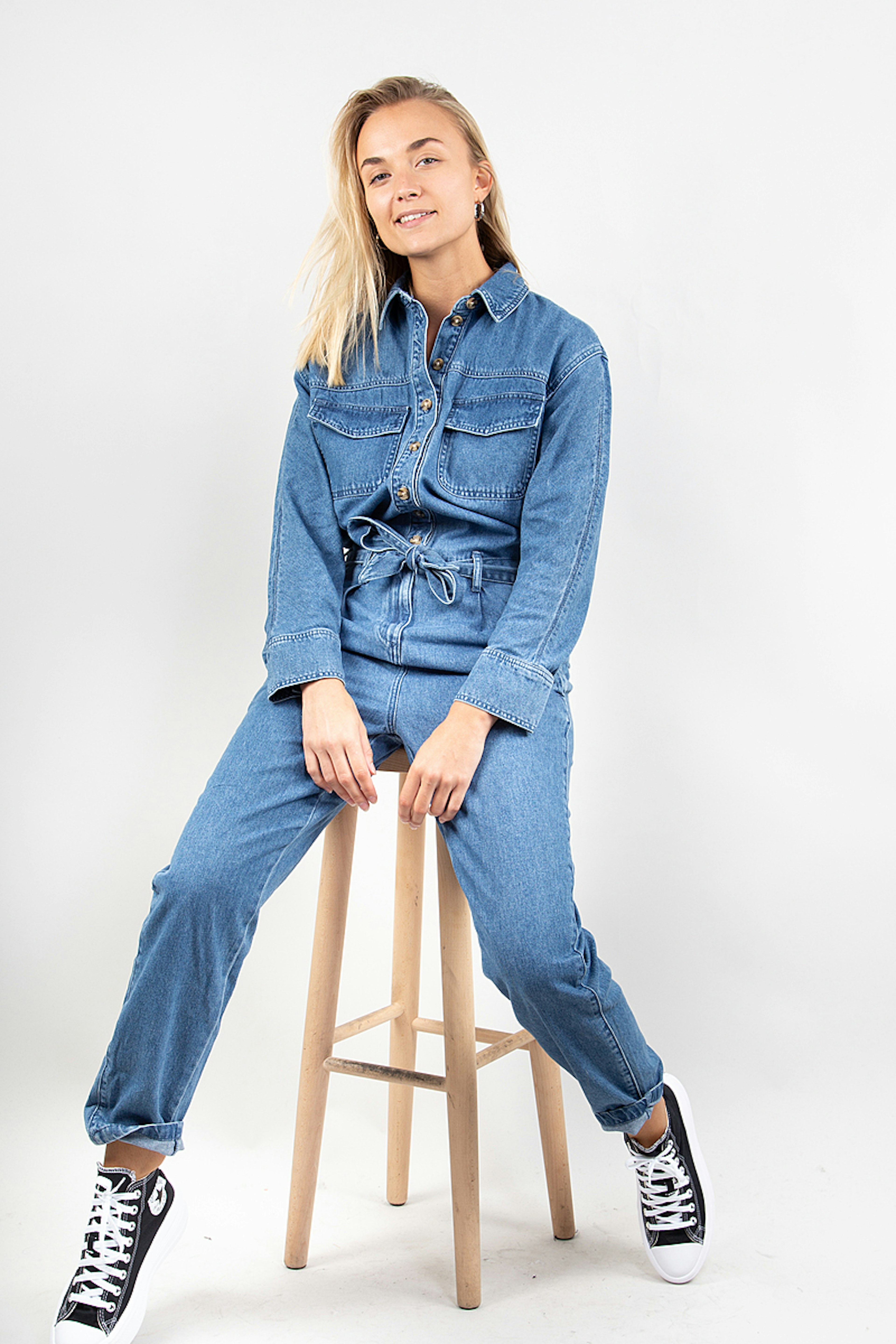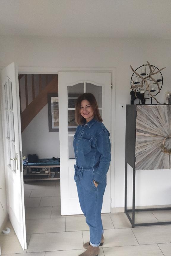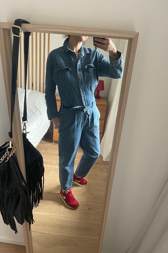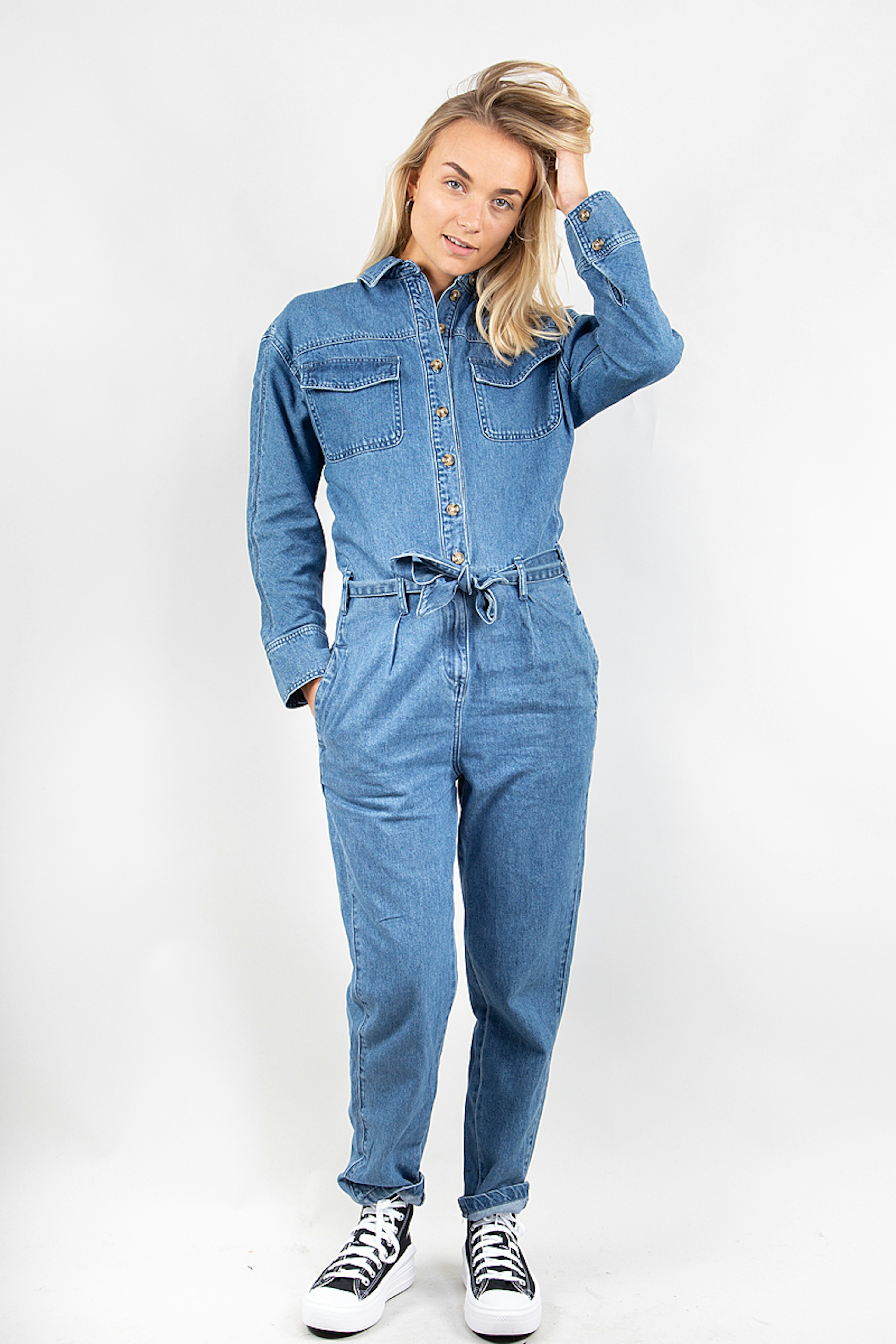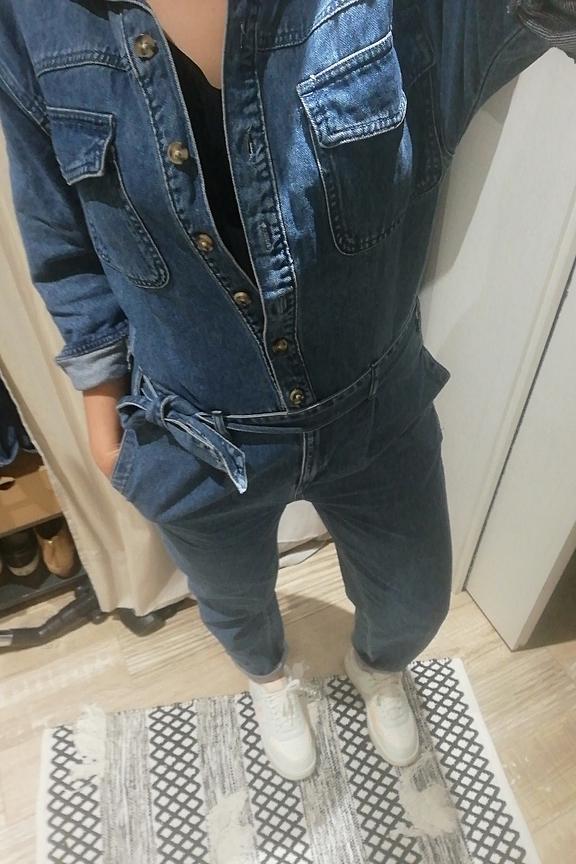 Soyez dans la tendance avec cette combinaison en denim. โข Col chemise โข Ouverture boutonnรฉe devant โข Taille marquรฉe โข Ceinture ร nouer โข Passants โข 6 poches โข Manches longues, poignets boutonnรฉs โข Jambes carrot โข Finition surpiquรฉe