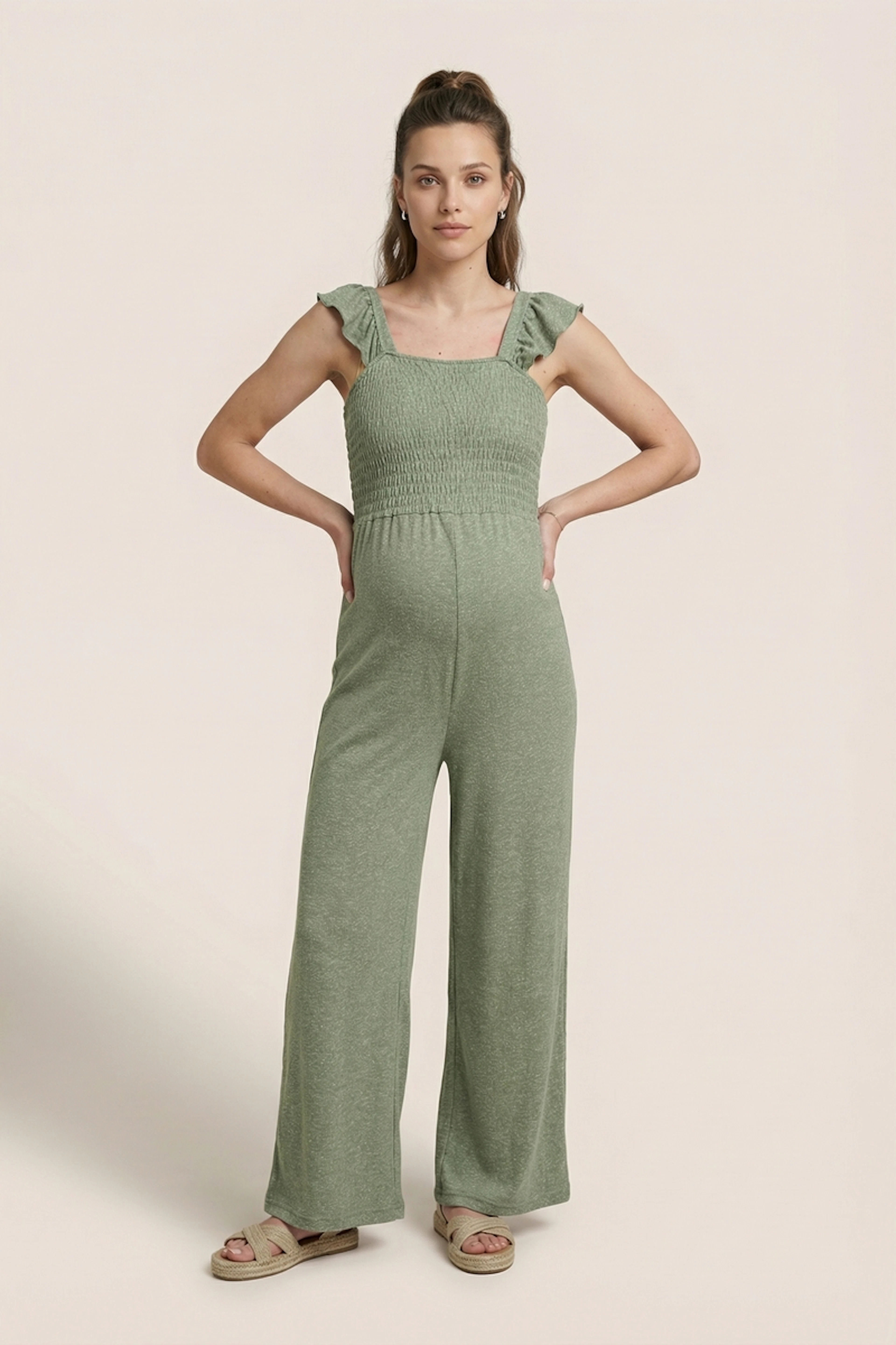 Associez cette combinaison avec des sandales dorées et un chapeau de paille pour un look estival décontracté. • Combinaison à bretelles volantées • Taille empire smockée • Jambe large et fluide • Sans manches • Matière légère et confortable