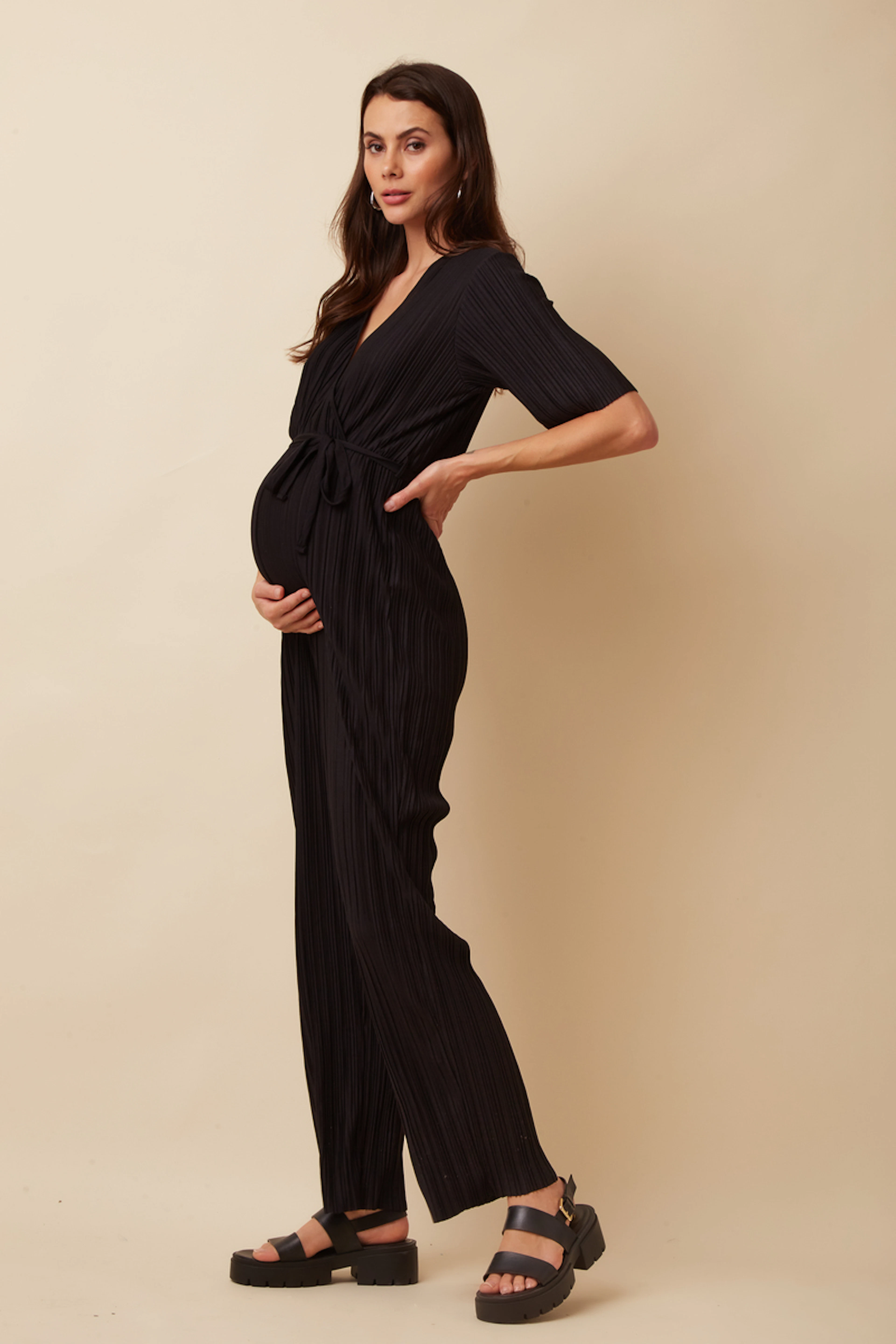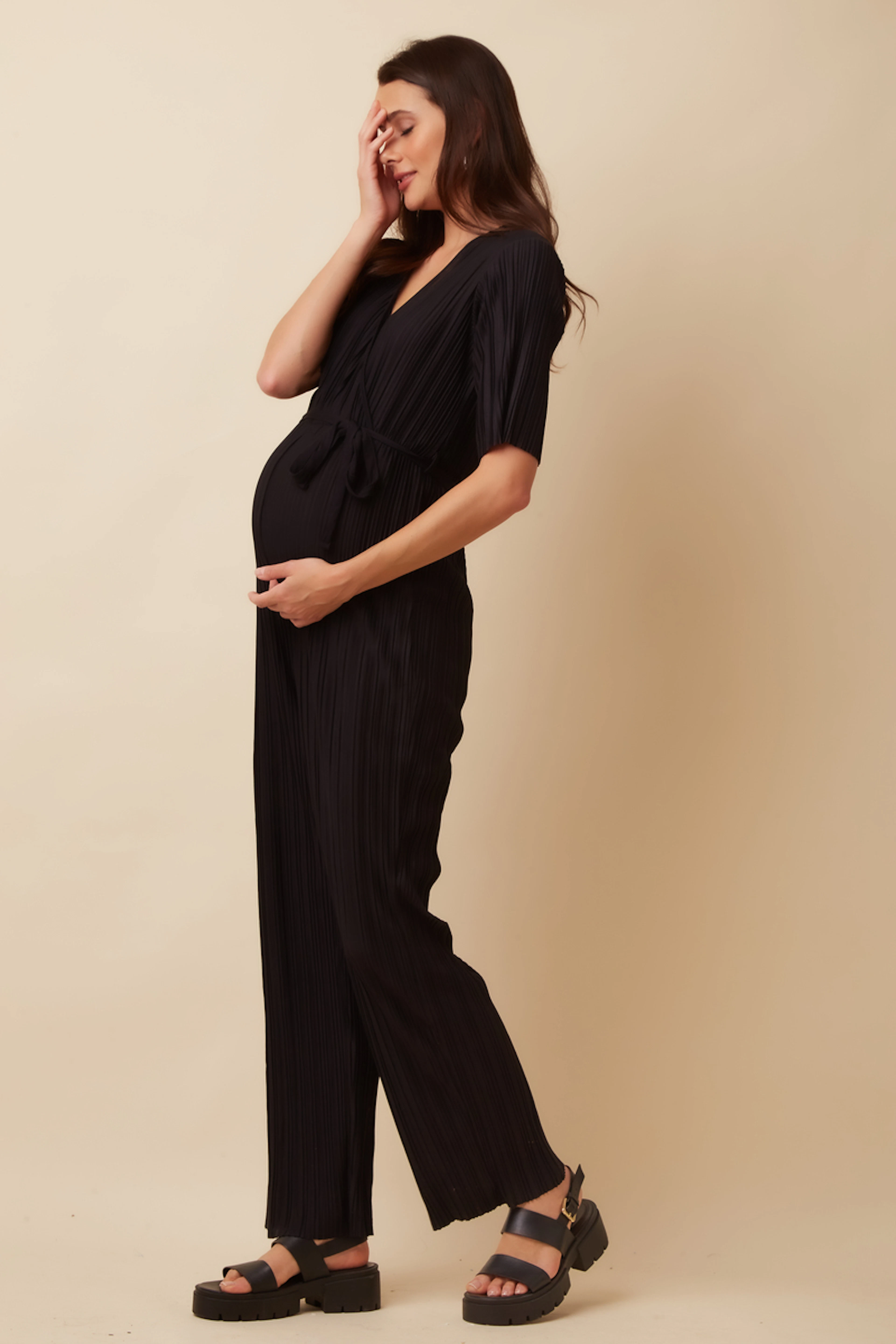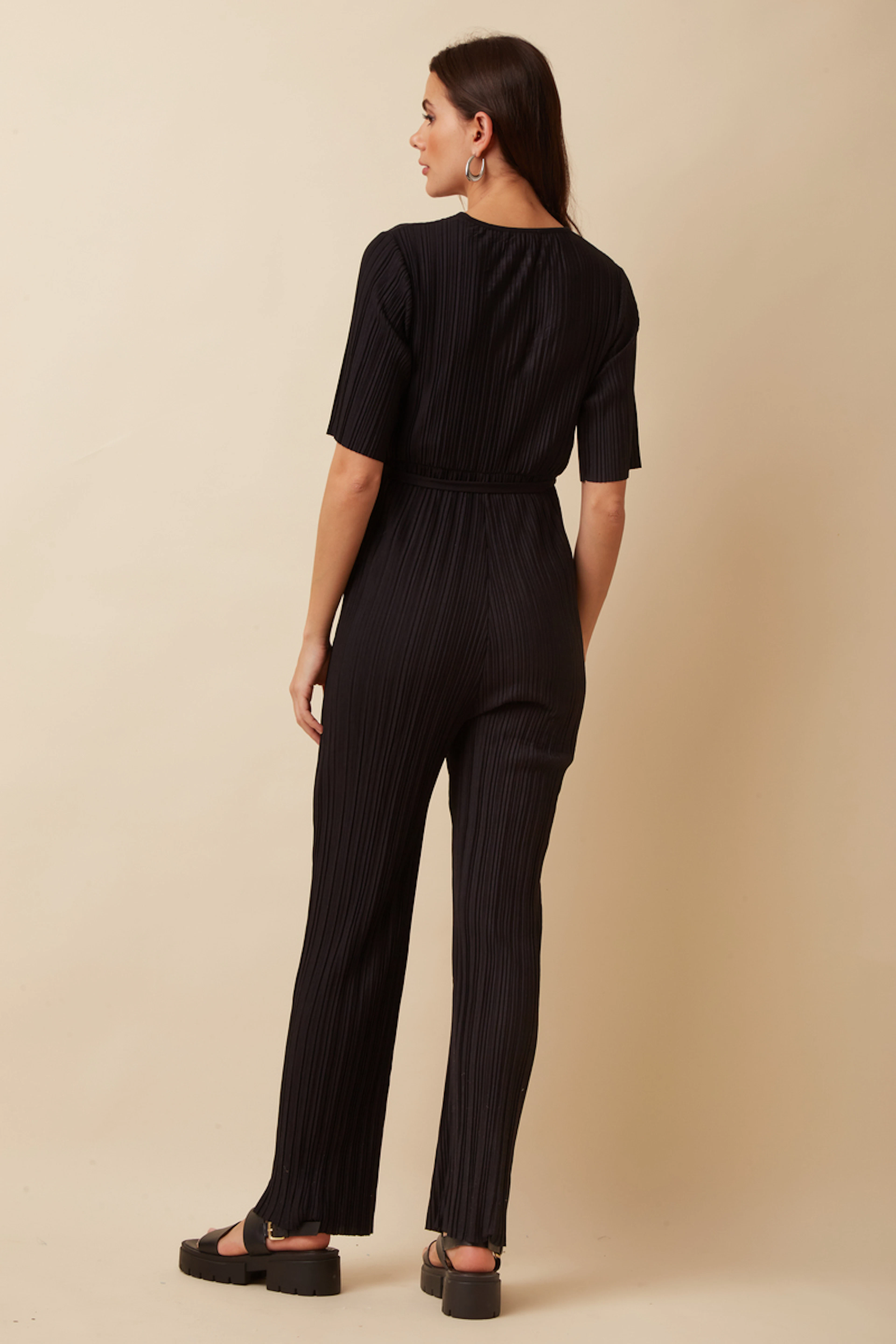 Pour un look chic et confortable, associez cette élégante combinaison avec une veste structurée et des mocassins tendance. En été, portez-la avec des sandales légères pour une allure décontractée. Parfait en toute saison. • Combinaison Cache-coeur • Manches courtes • Ceinture à nouer • Matière plissée