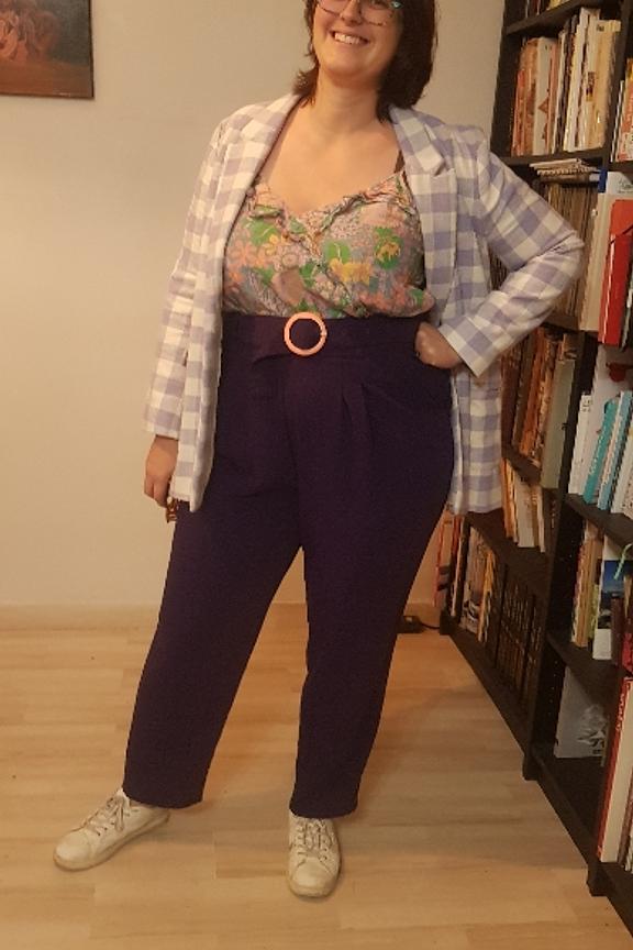 โข Combinaison pantalon bicolore โข Pantalon violet โข Top ร bretelles imprimรฉs fleuris โข Ceinture incluse