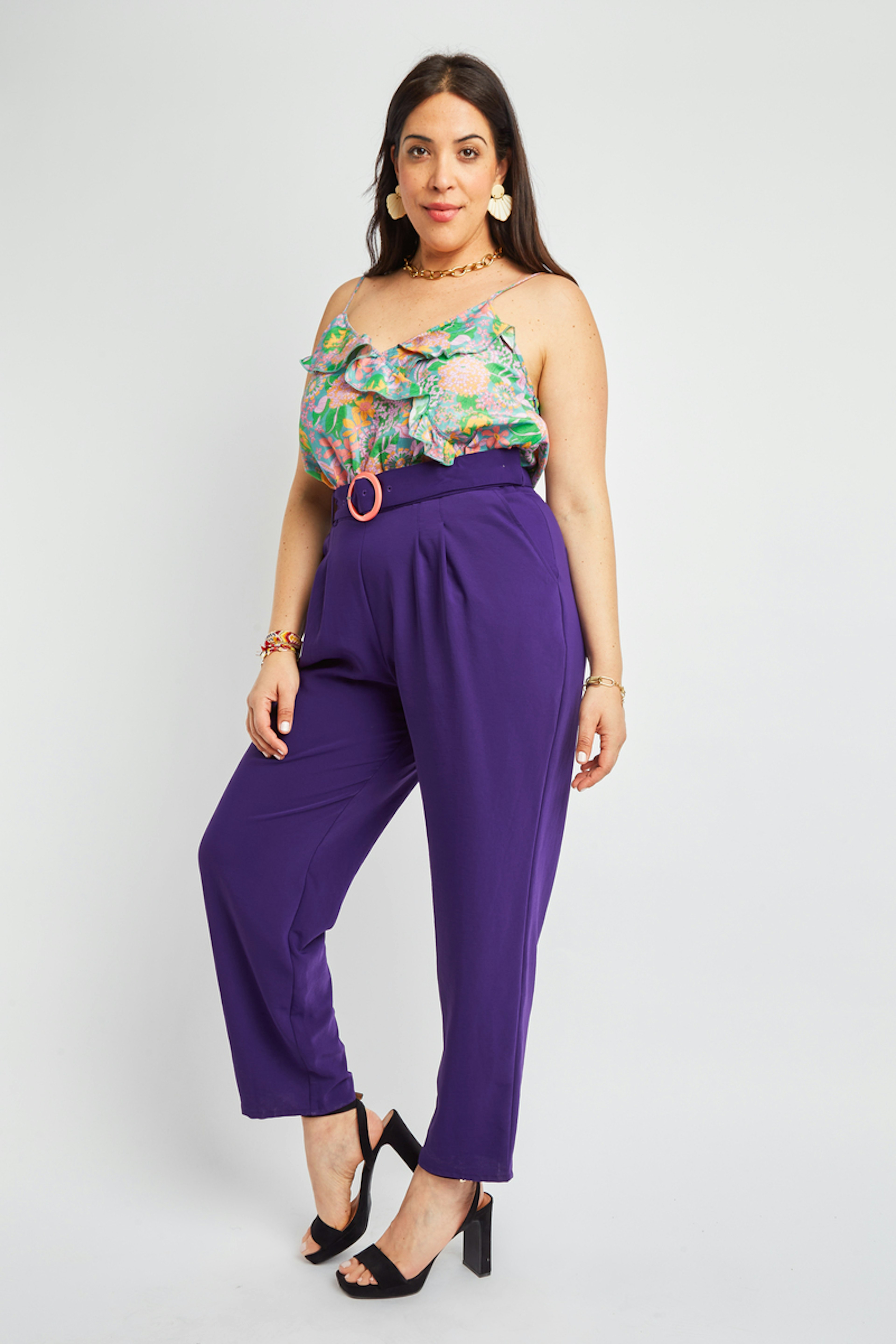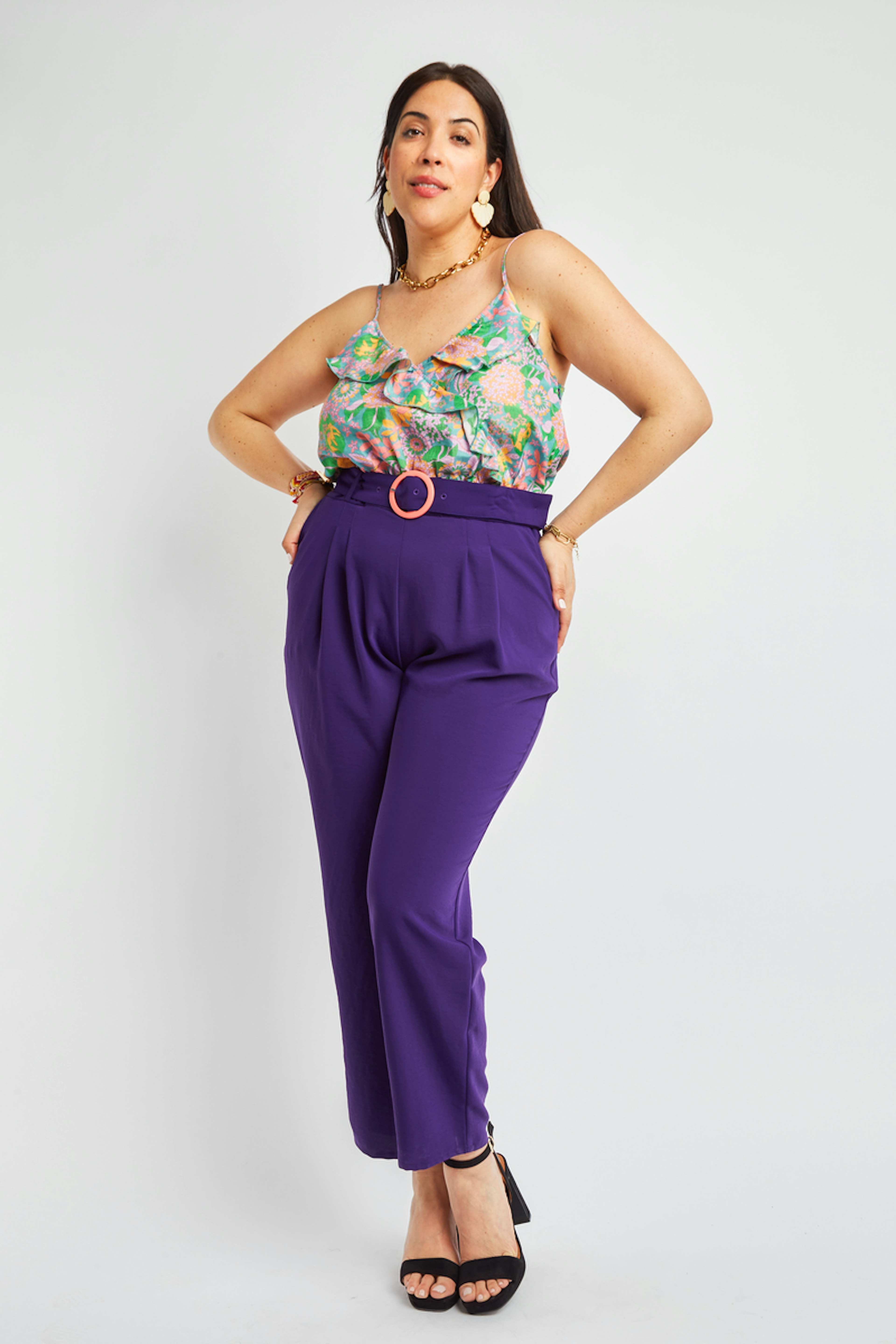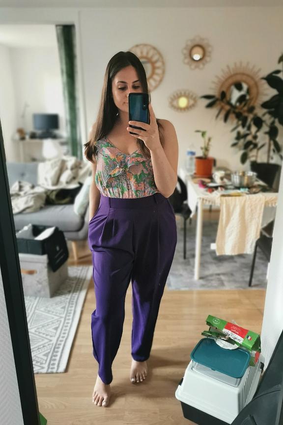 โข Combinaison pantalon bicolore โข Pantalon violet โข Top ร bretelles imprimรฉs fleuris โข Ceinture incluse
