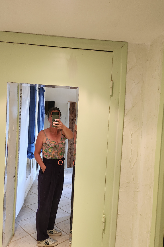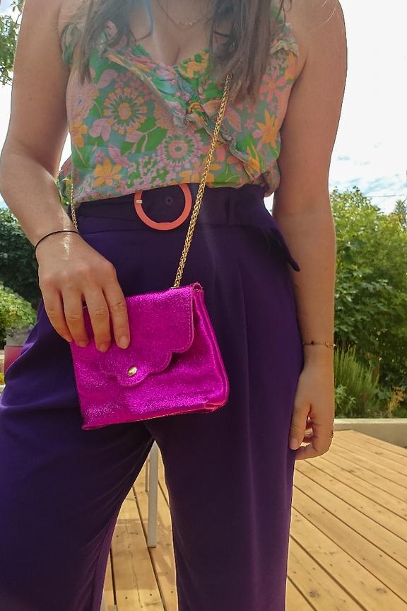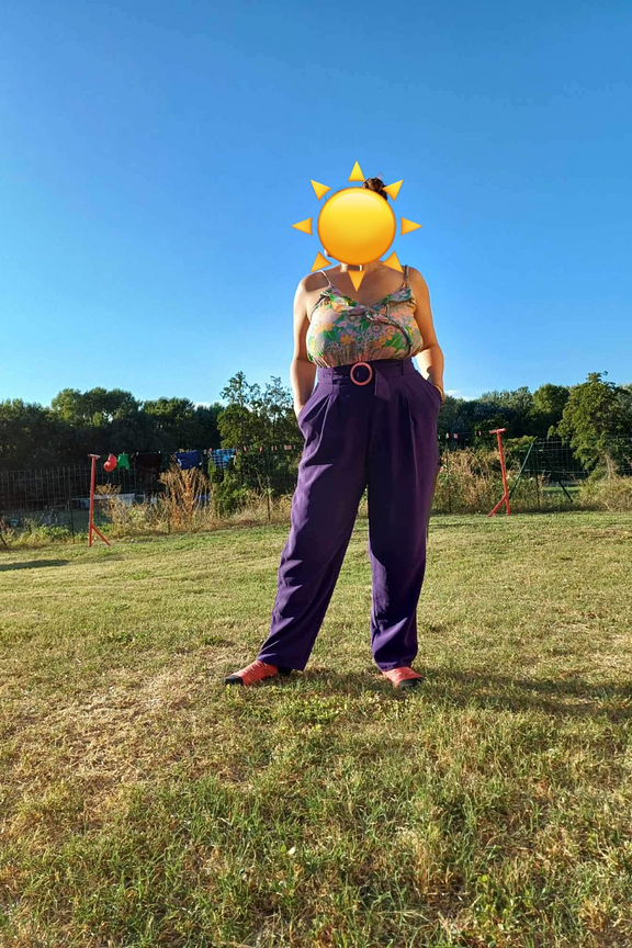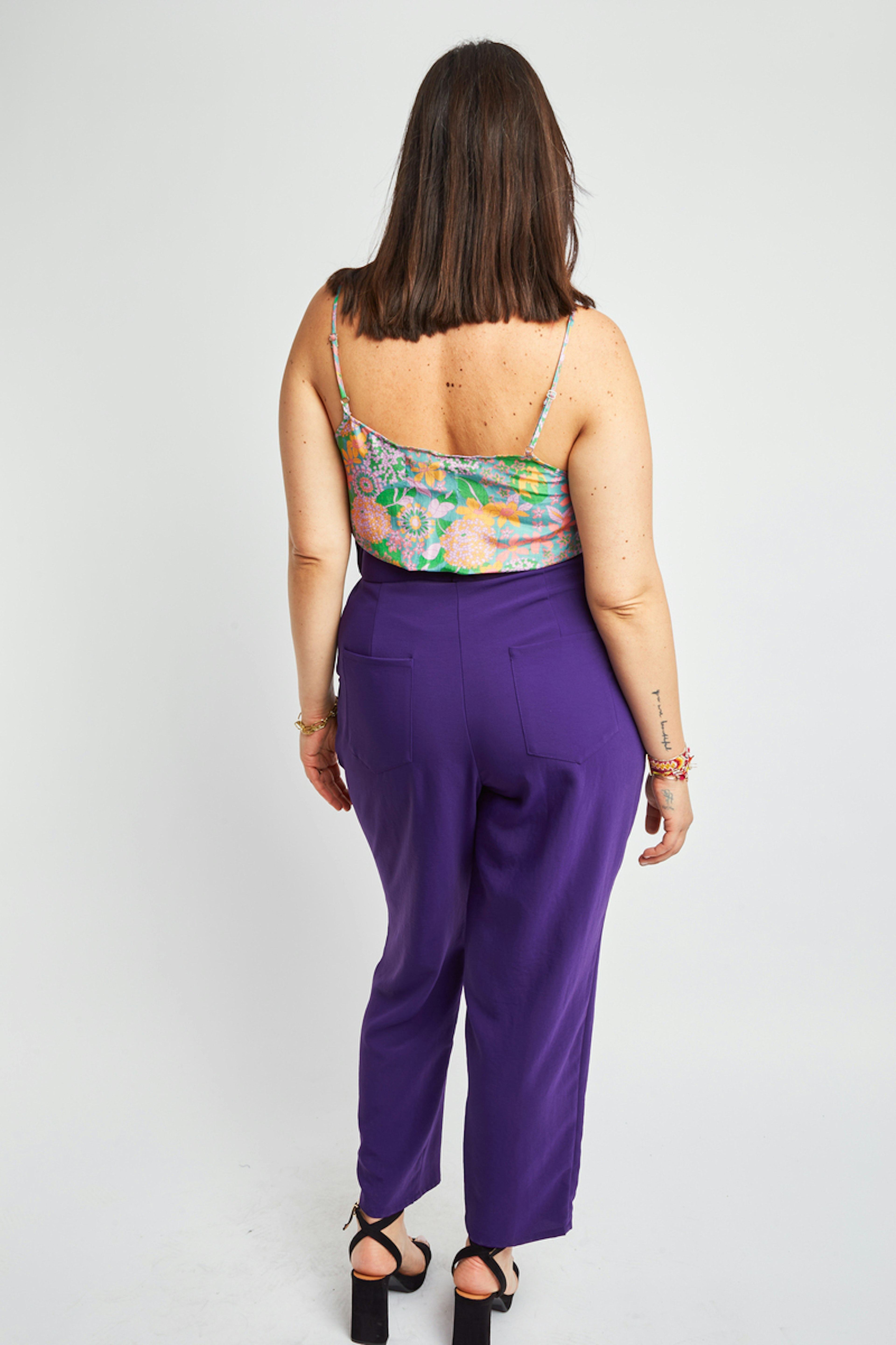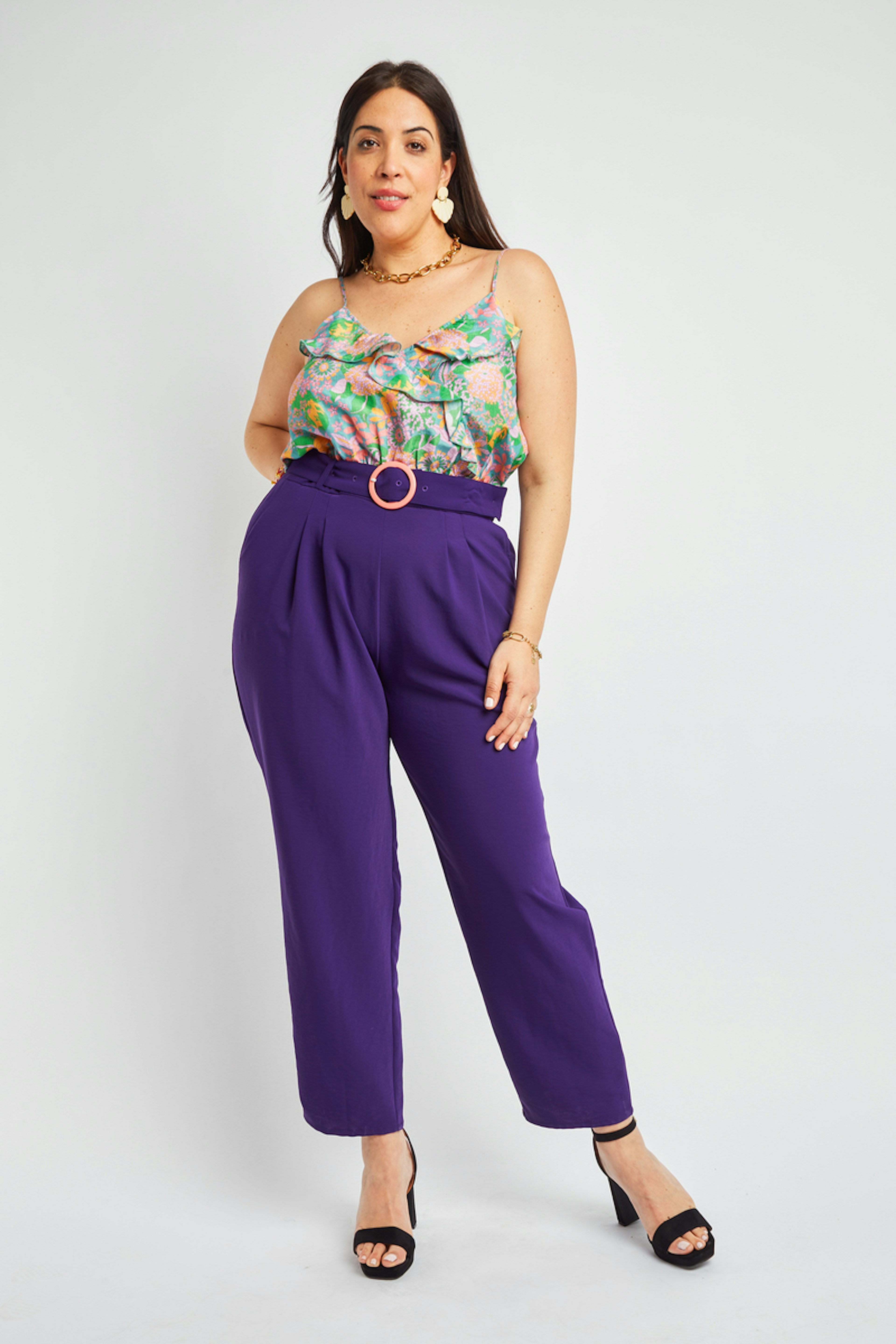 โข Combinaison pantalon bicolore โข Pantalon violet โข Top ร bretelles imprimรฉs fleuris โข Ceinture incluse