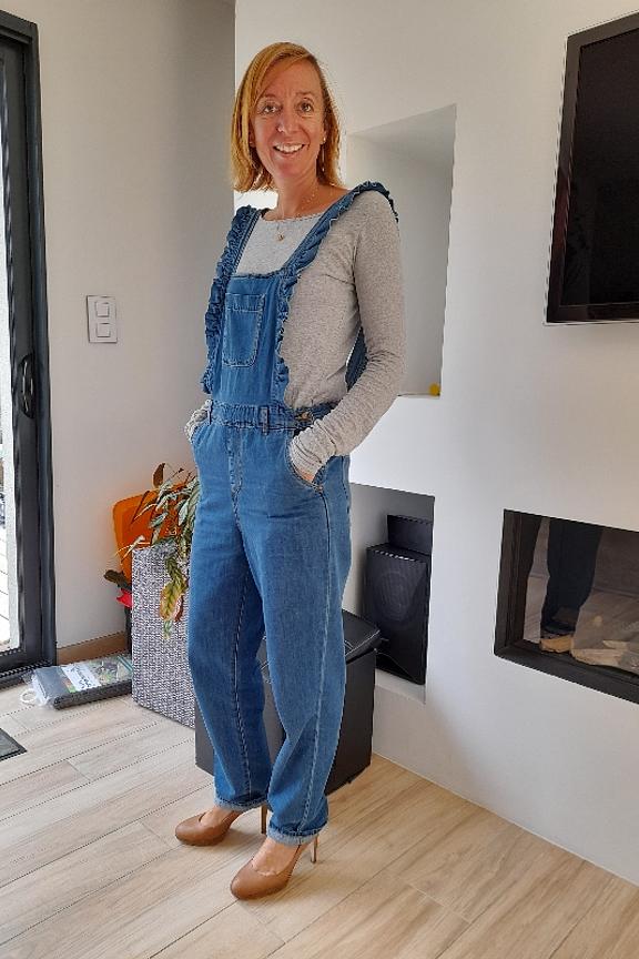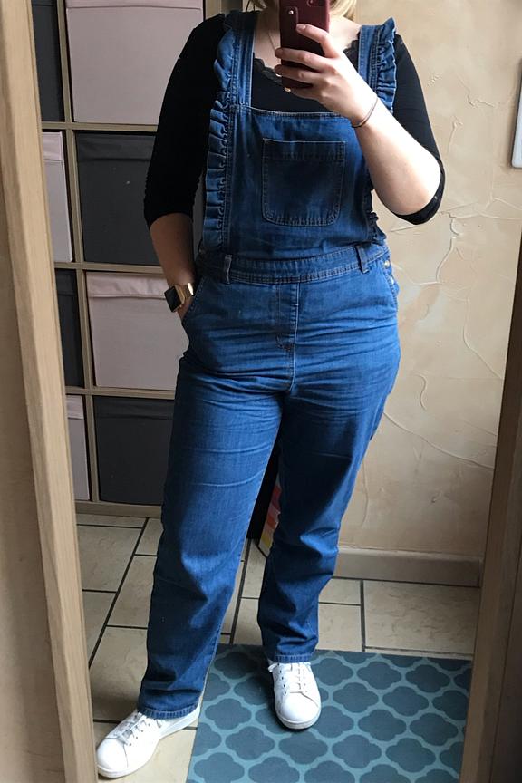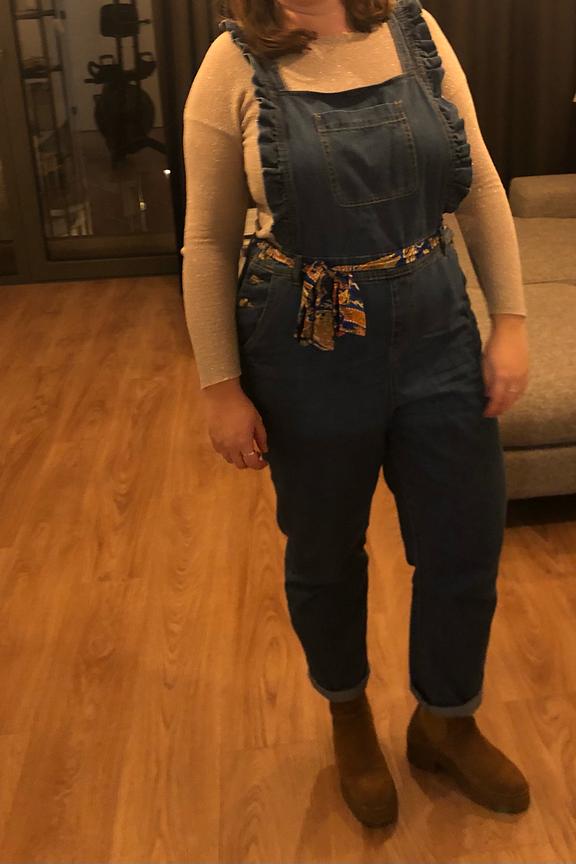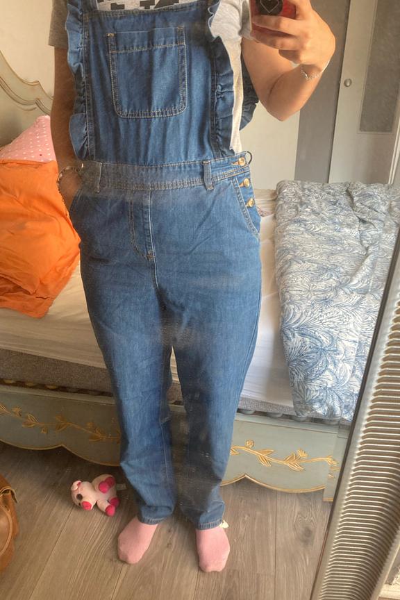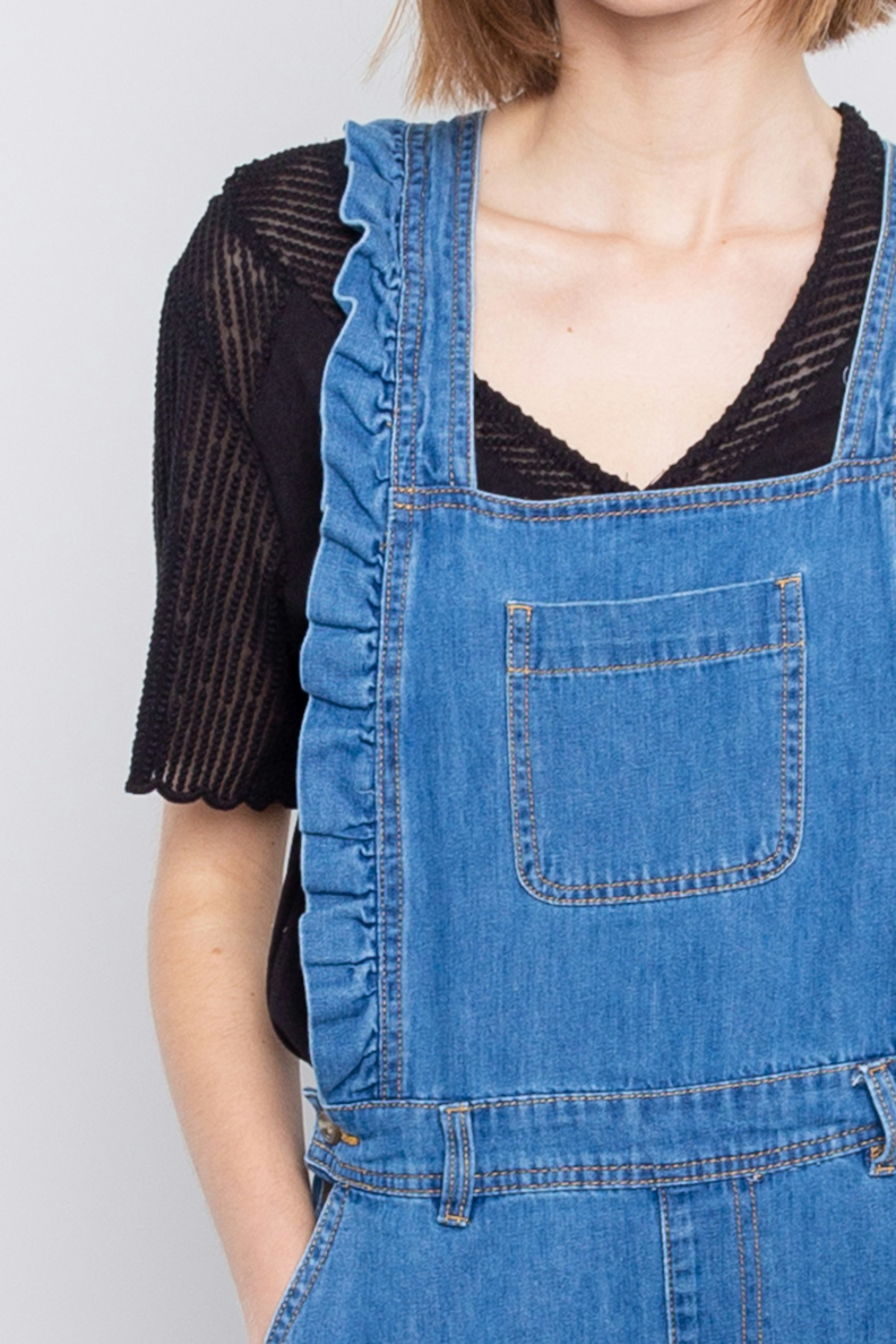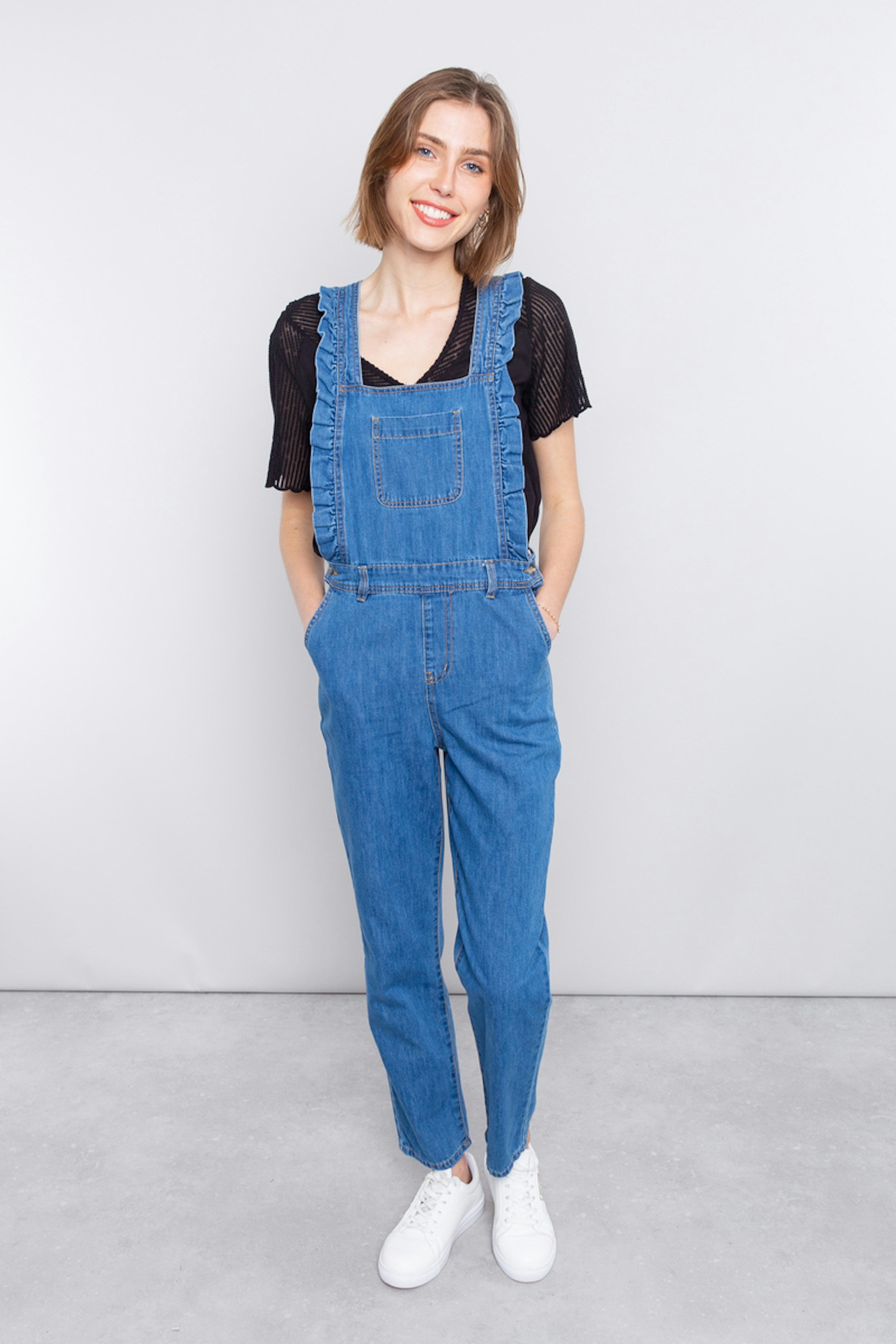 Craquez pour cette combinaison en jean au style romantique. โข Combinaison pantalon en jean bleu โข Volants au niveau des manches โข Poche plaquรฉe sur le devant โข Passants pour y ajouter une ceinture โข Contient du coton bio