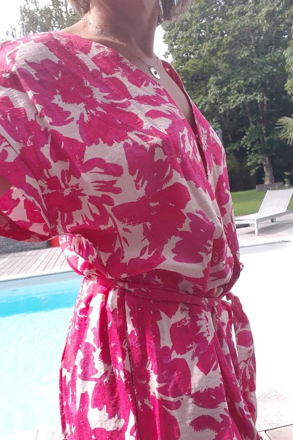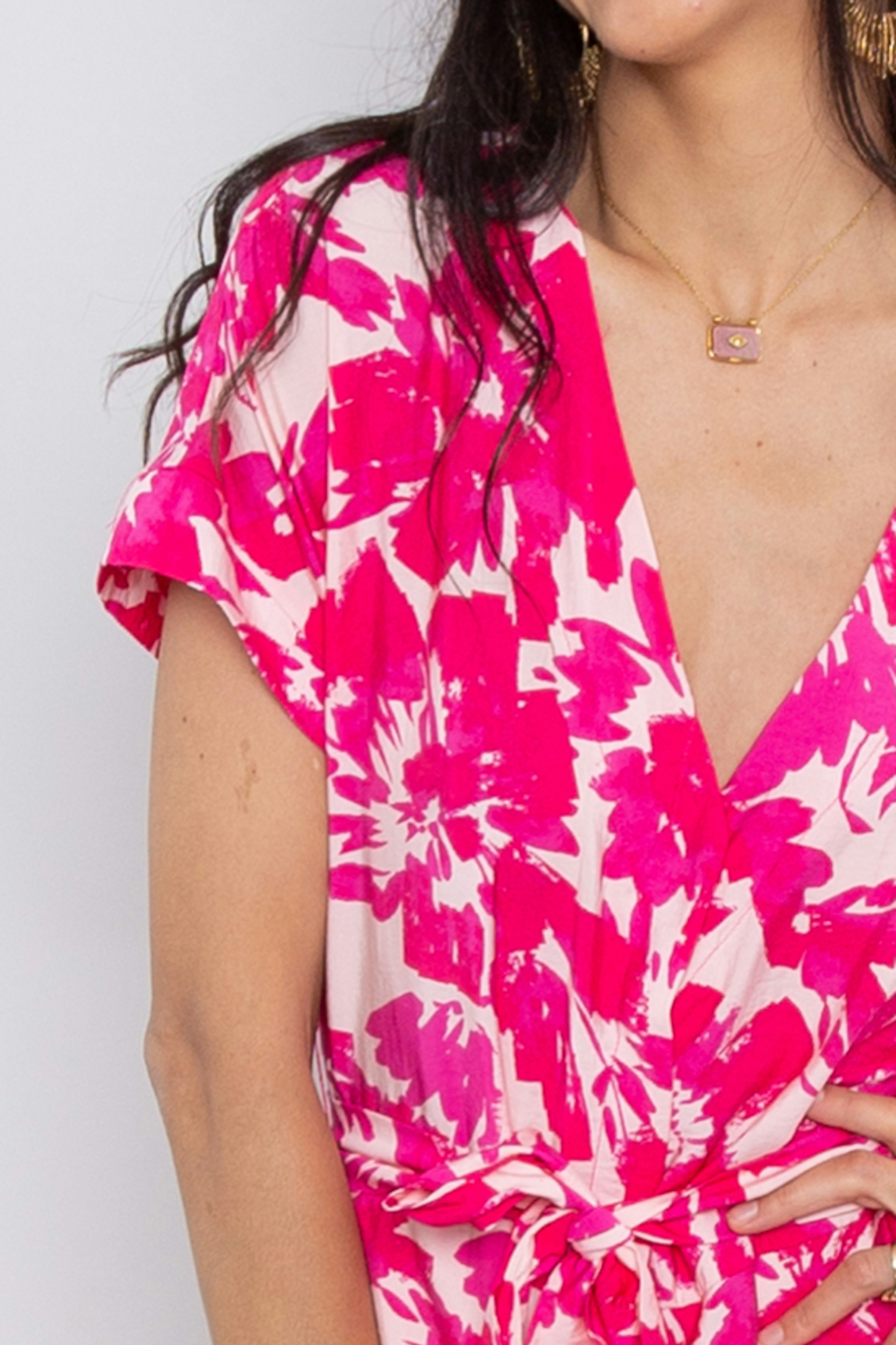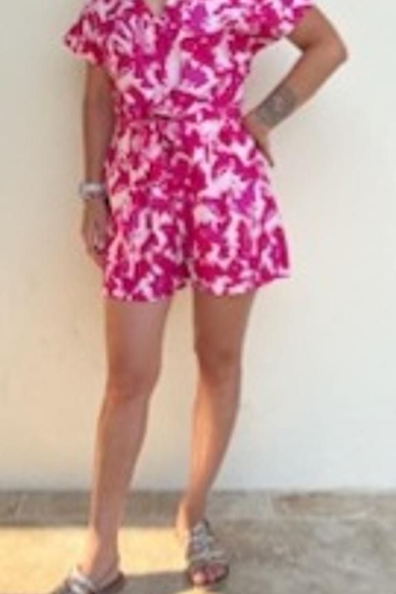 โข Combishort fuschia โข Imprimรฉ fleuri โข Manches courtes โข Dรฉcolletรฉ en V โข Taille cintrรฉe avec ceinture