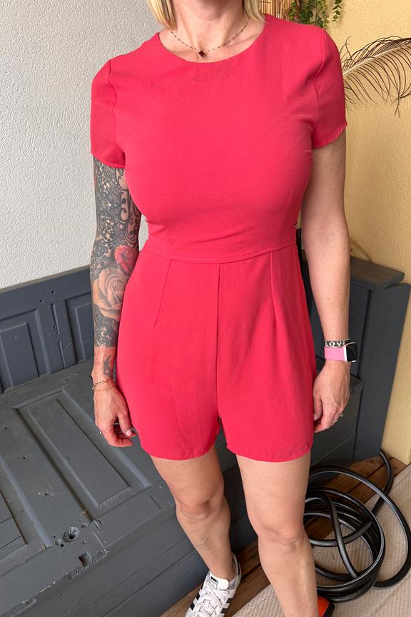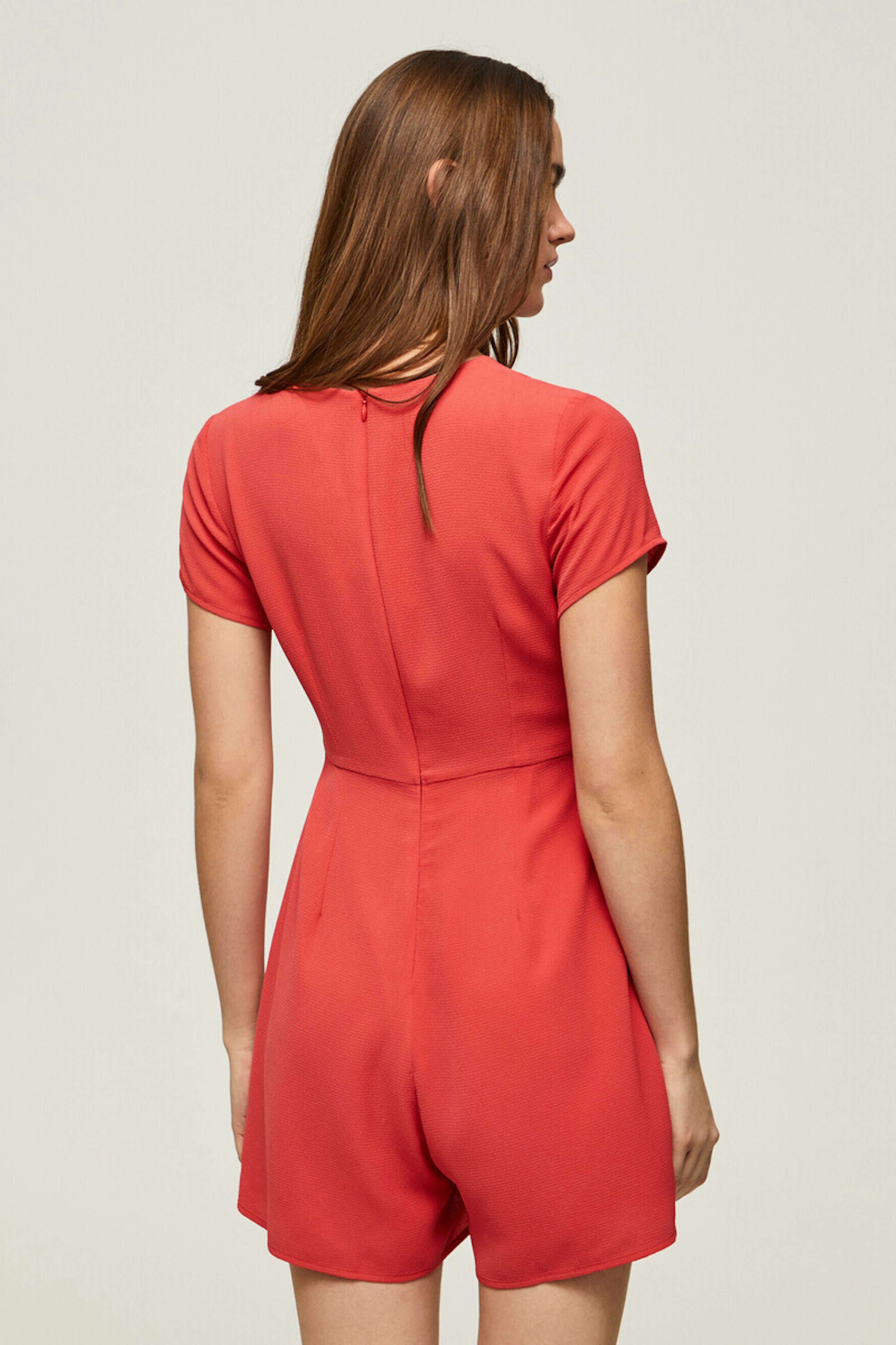 โข Combinaison courte en tissu crรชpe โข Col rond โข Manches courtes โข Fermeture au dos avec zip invisible