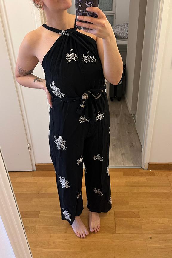 Associez cette combinaison avec des sandales minimalistes et un sac en osier pour un look estival et décontracté. • Combinaison avec imprimé • Bretelles licou • Pantalon ample • Taille ajustée • Motif floral