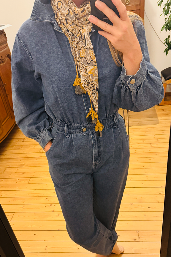 “Je confirme qu'elle taille vraiment petit à la taille : je porte du 36 en jeans et j'ai bien fait de prendre le L (63 kg pour 1m65). Matière denim brut épais qui offre une belle tenue, effet oversize en dehors de la taille : ne met pas en valeur la morphologie mais a du style !”