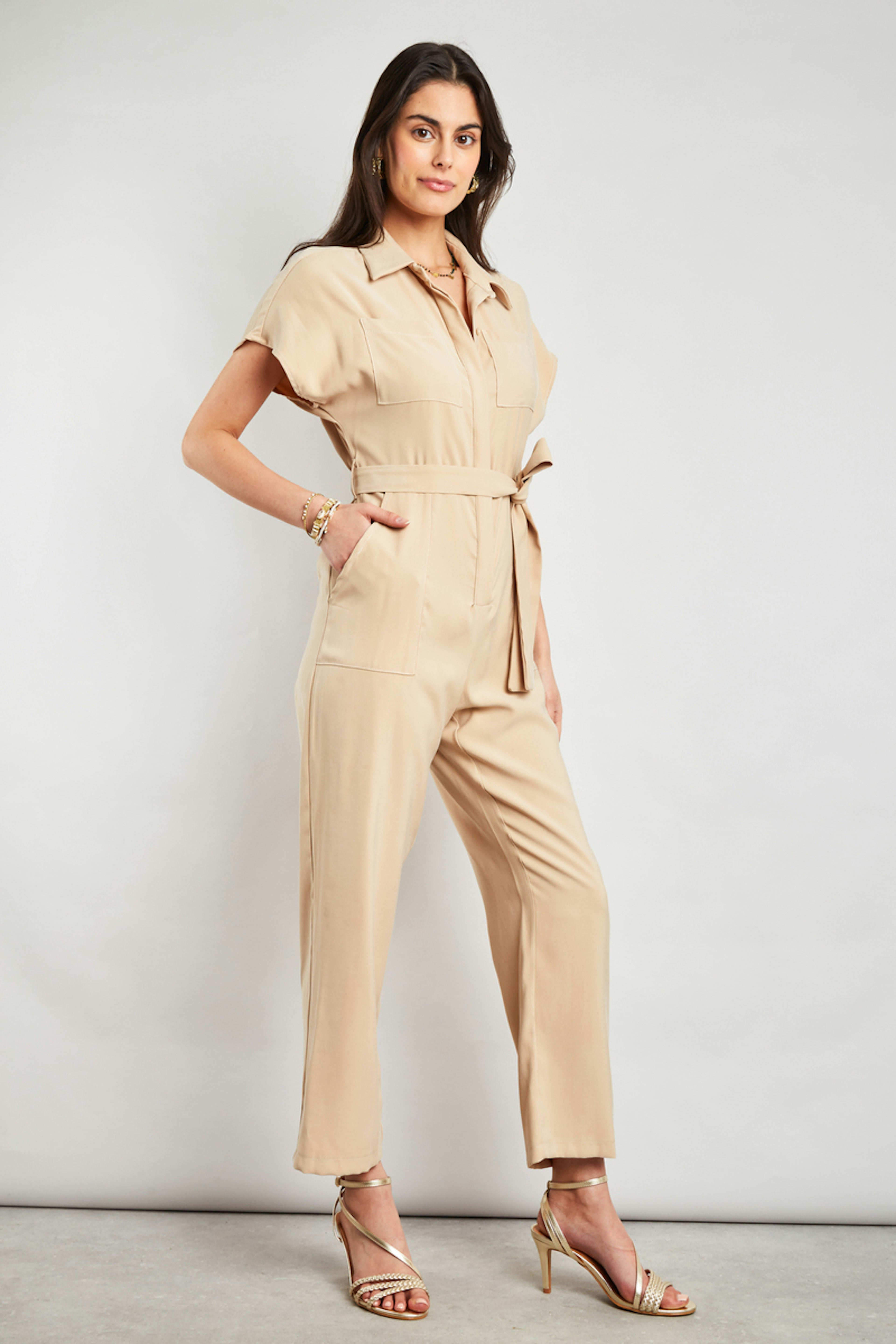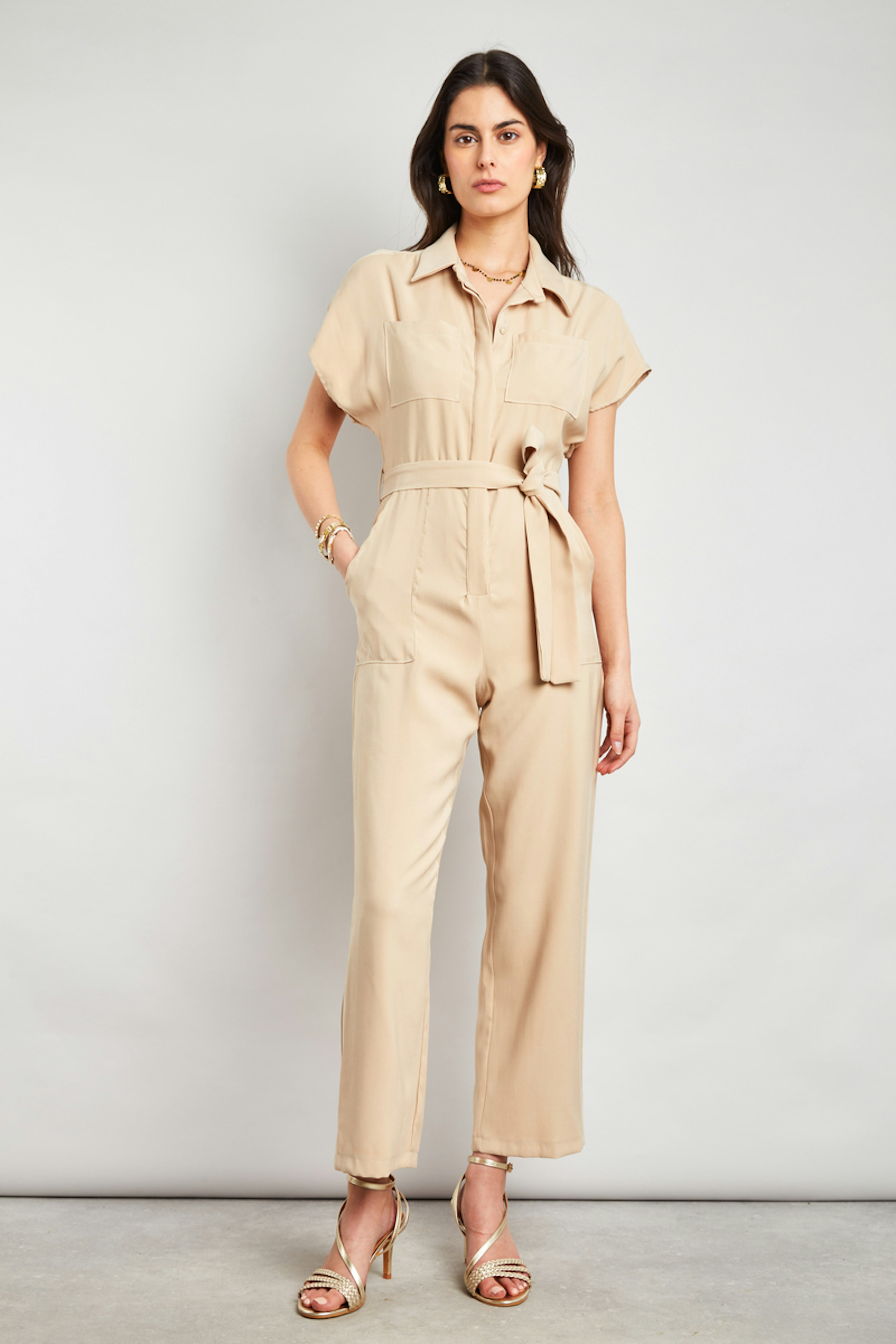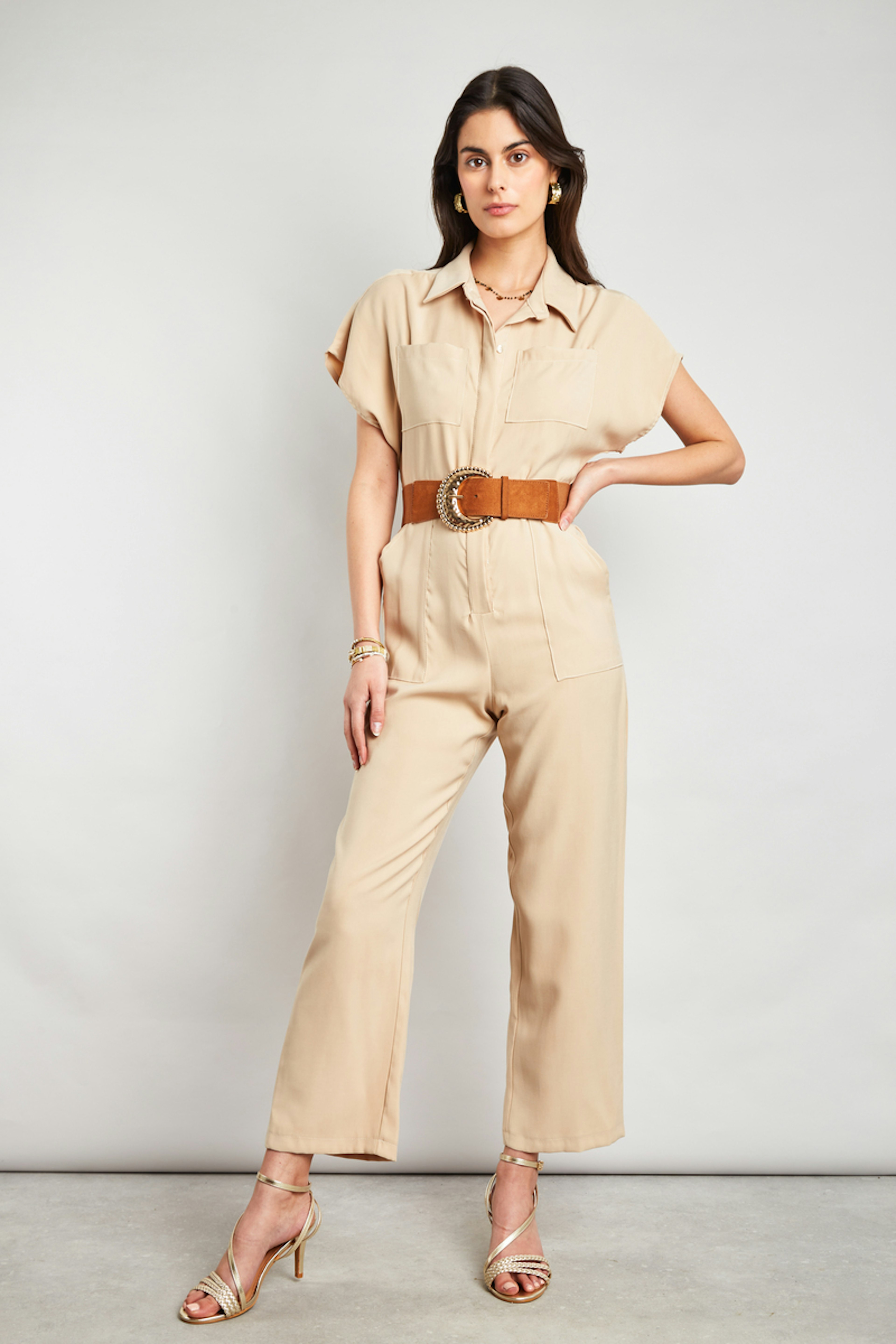 โข Combinaison pantalon โข Couleur unie beige โข Coupe droite โข Ceinture ton sur ton incluse โข Poches plaquรฉes sur la poitrine โข Col chemise classique โข Manches courtes โข Poches latรฉrales ouvertes โข Jambes droites 7/8