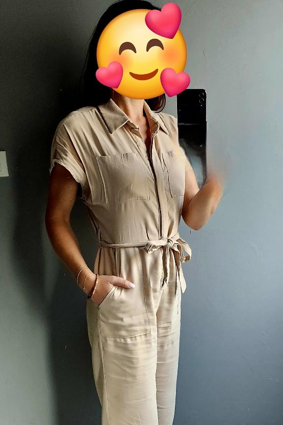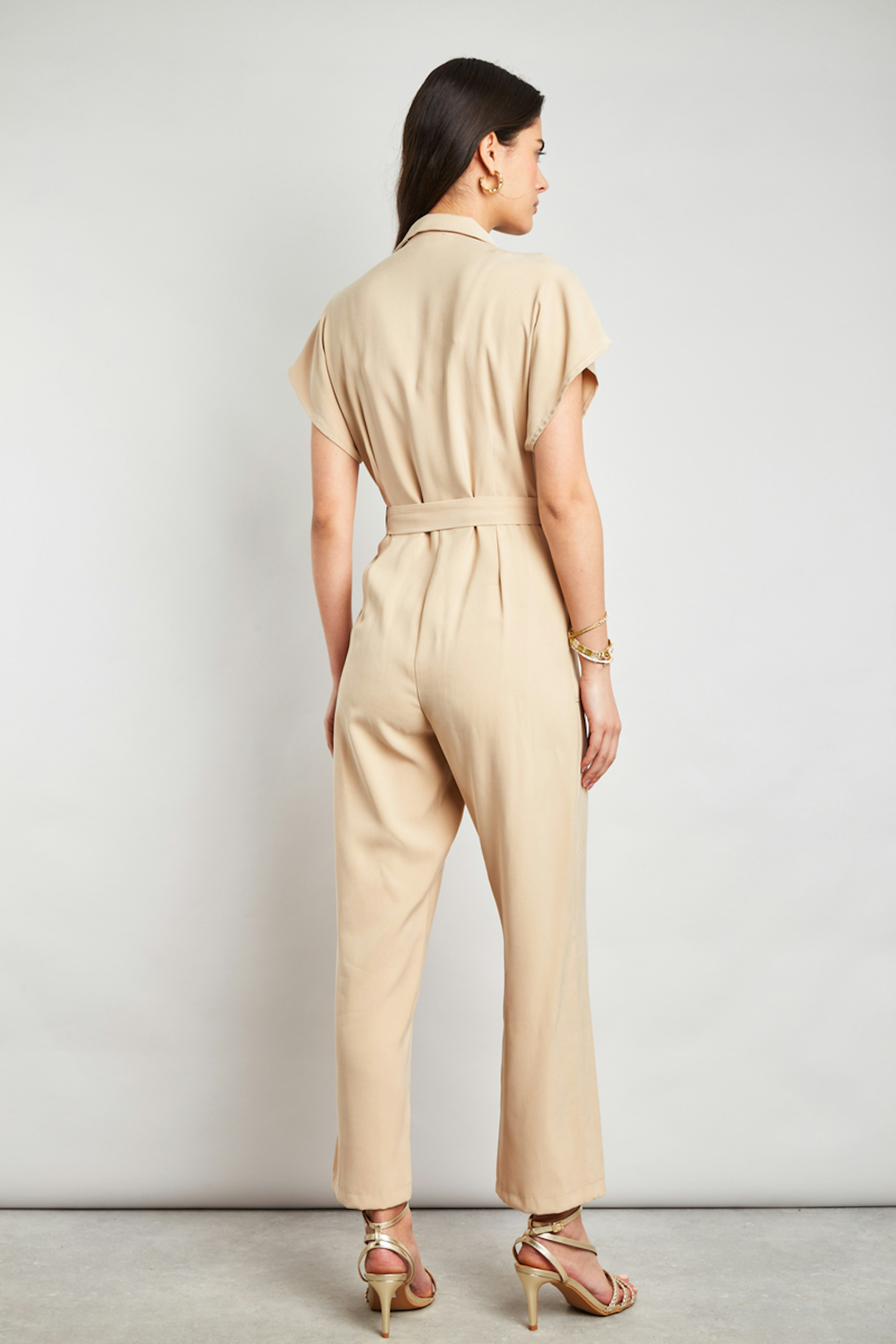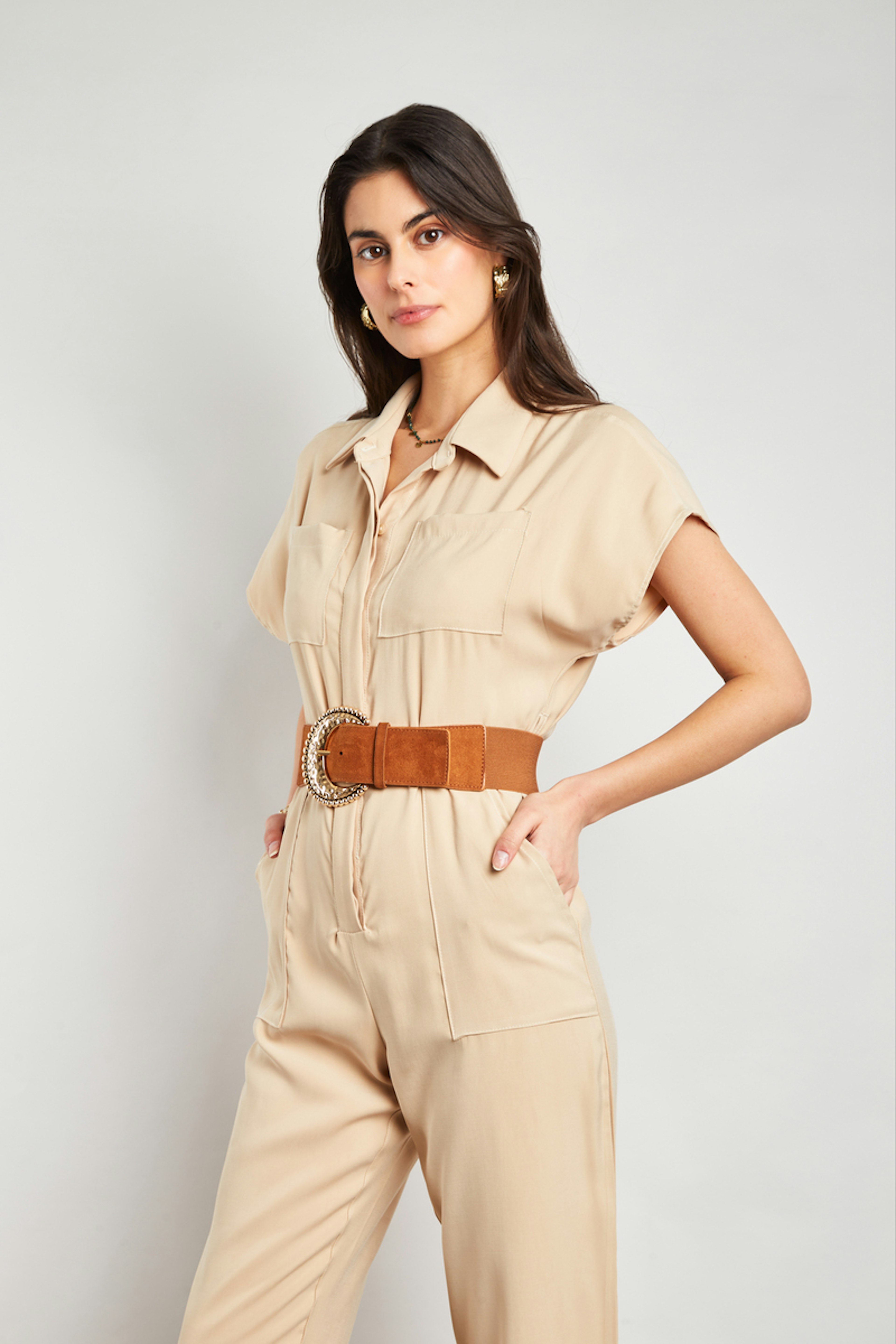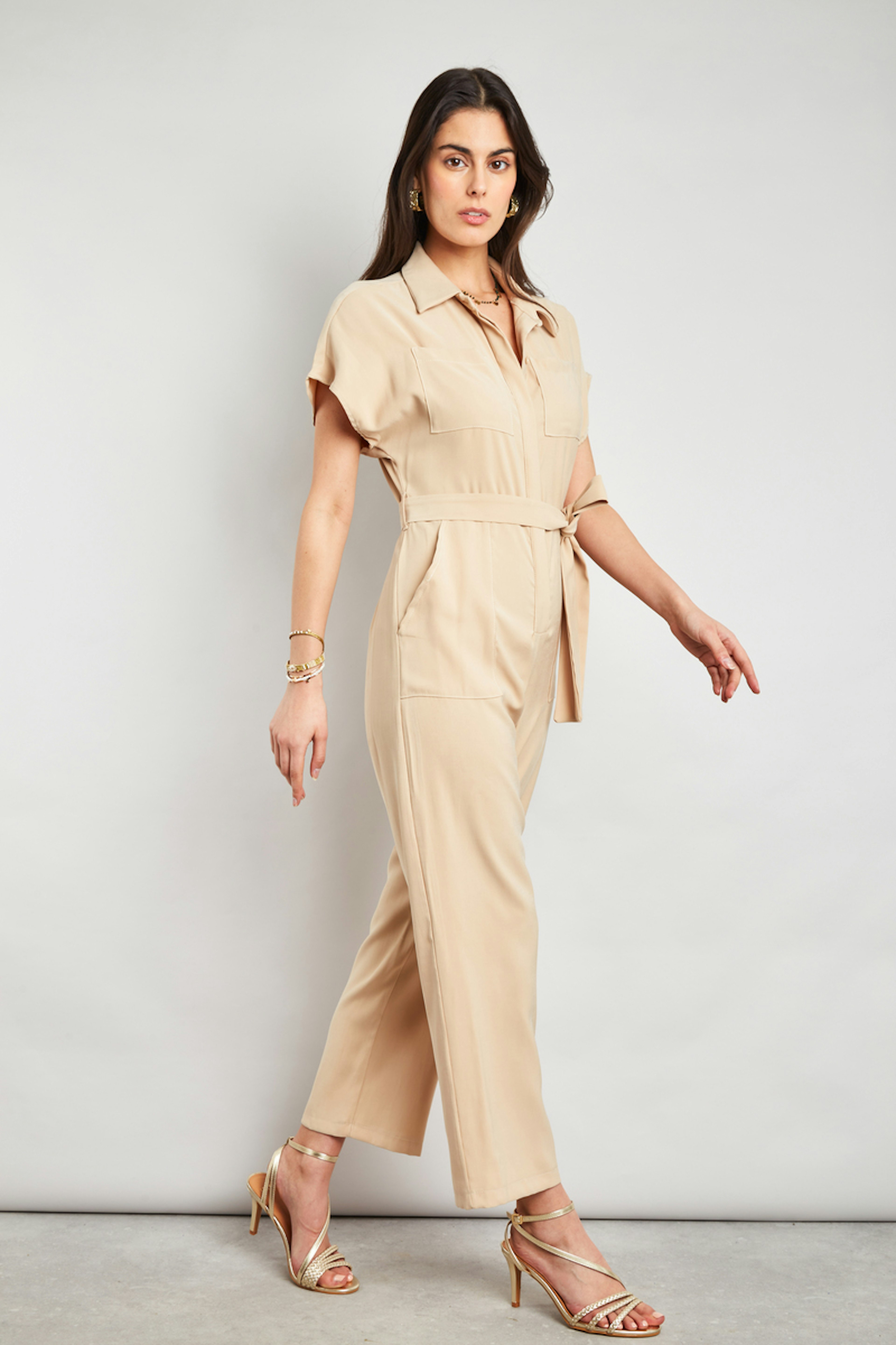 โข Combinaison pantalon โข Couleur unie beige โข Coupe droite โข Ceinture ton sur ton incluse โข Poches plaquรฉes sur la poitrine โข Col chemise classique โข Manches courtes โข Poches latรฉrales ouvertes โข Jambes droites 7/8