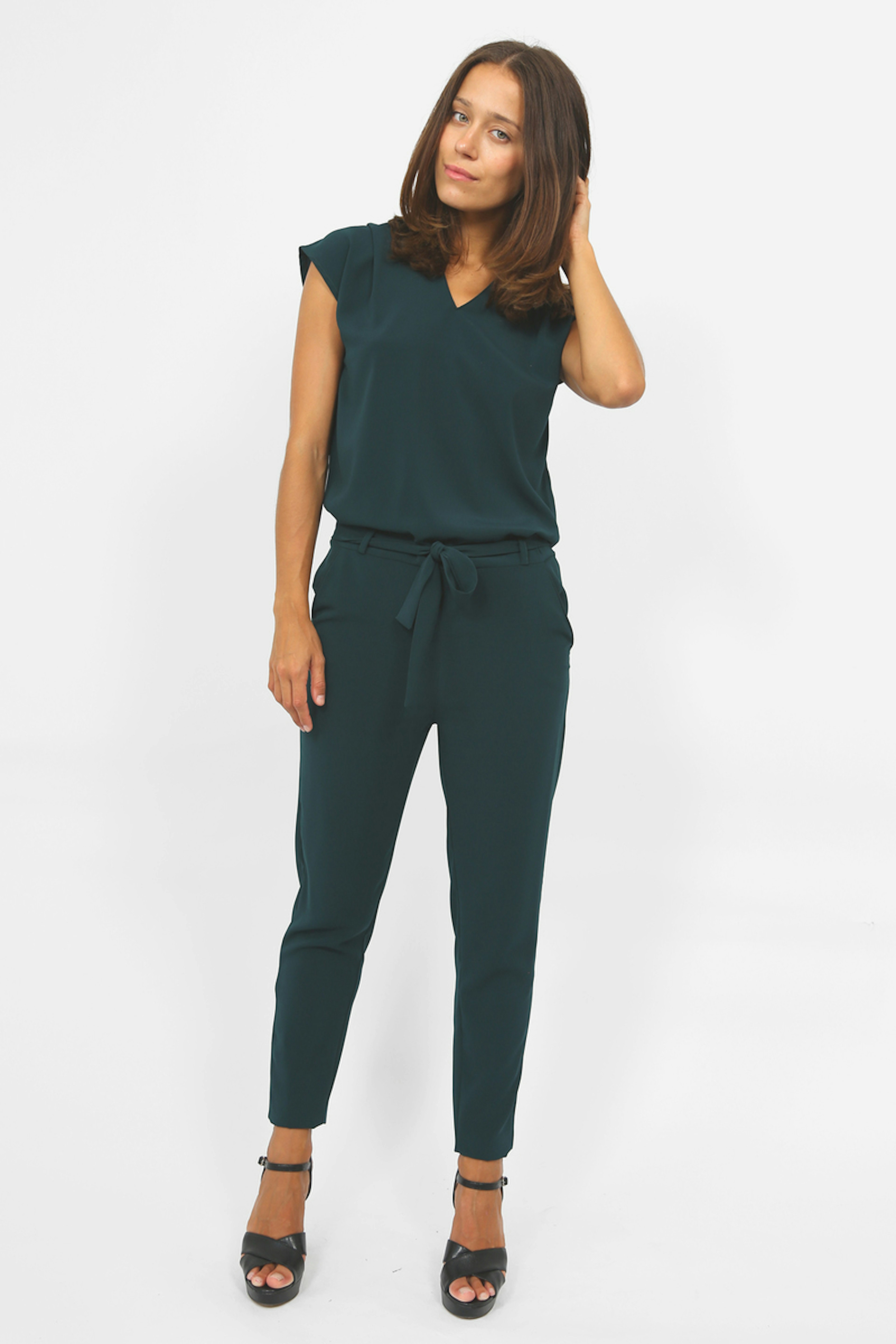 Combinaison verte, manches courte et col en V, cintrรฉe ร la taille grรขce ร un รฉlastique placรฉ ร l'arriรจre.