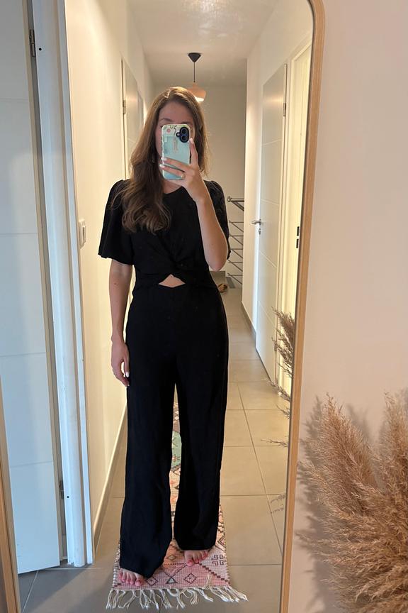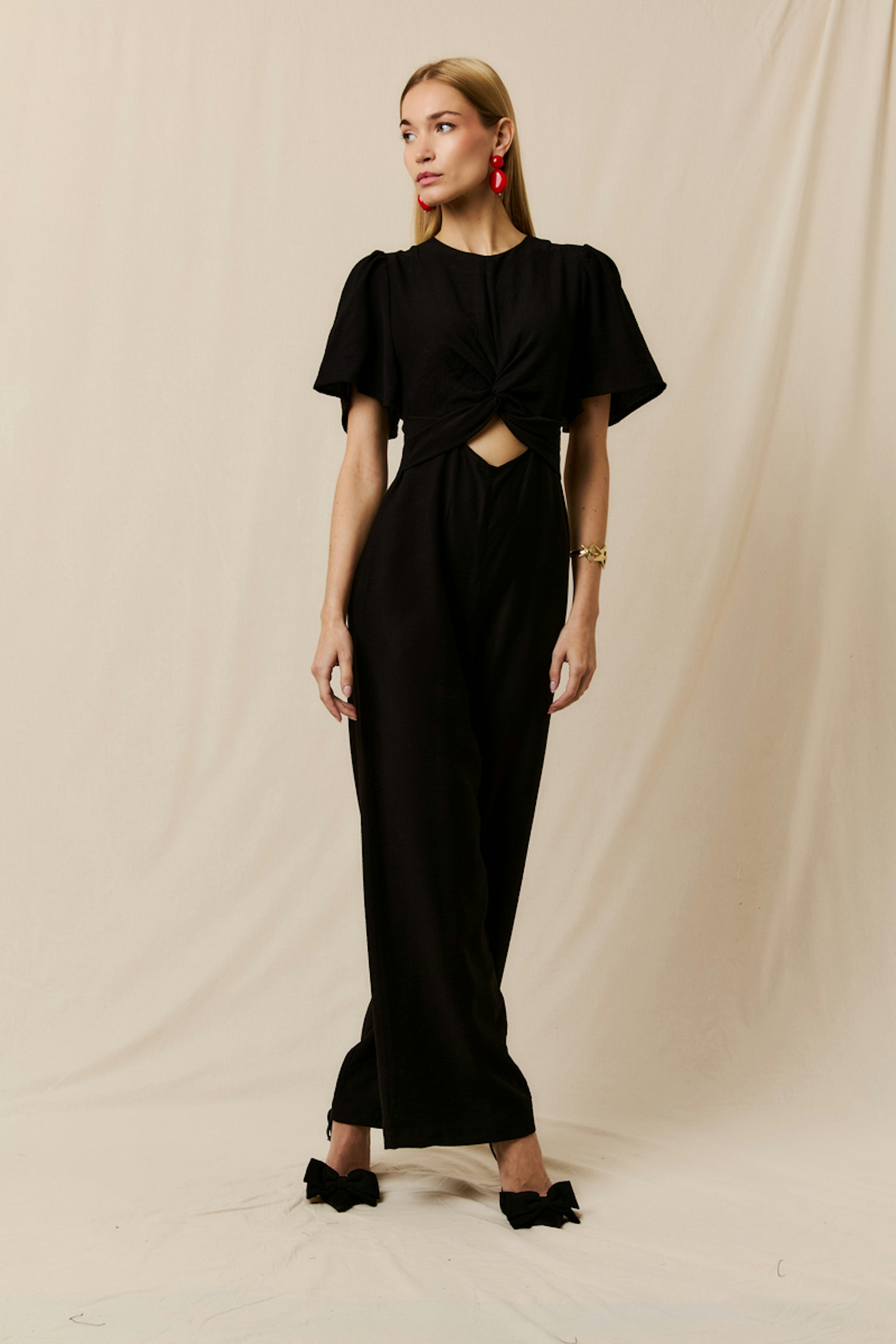 Optez pour des boucles d'oreilles audacieuses et des talons élégants pour une allure chic lors de vos soirées d'été. • Combinaison fluide • Manches courtes évasées • Découpe à la taille • Encolure ronde • Nœud central sophistiqué