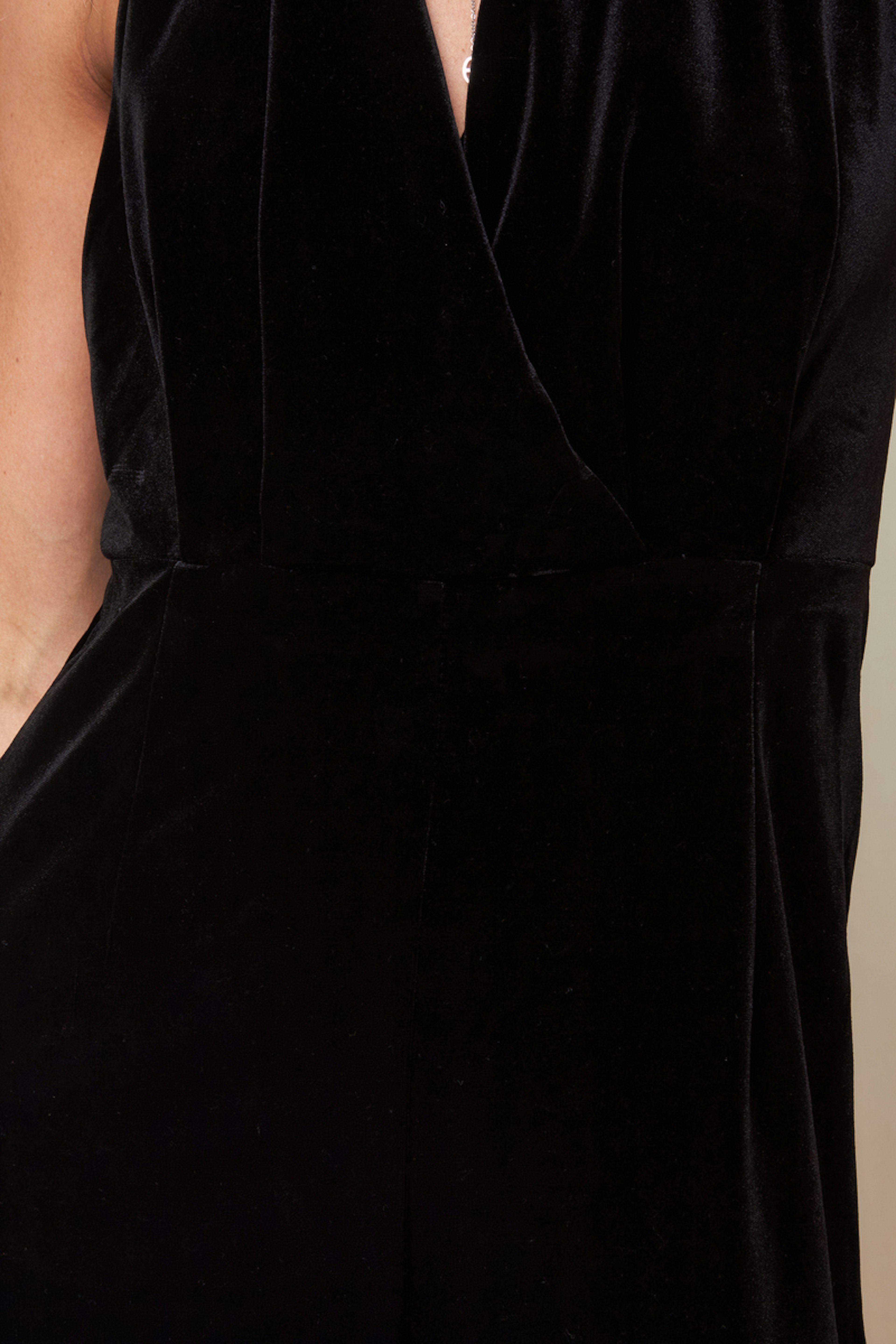 Portez-la avec des talons argentés pour un look chic et audacieux parfait en toute saison. • Combinaison élégante • Coupe dos-nu • Plongeant sur les côtés • Jambes larges • Nœud à l'épaule