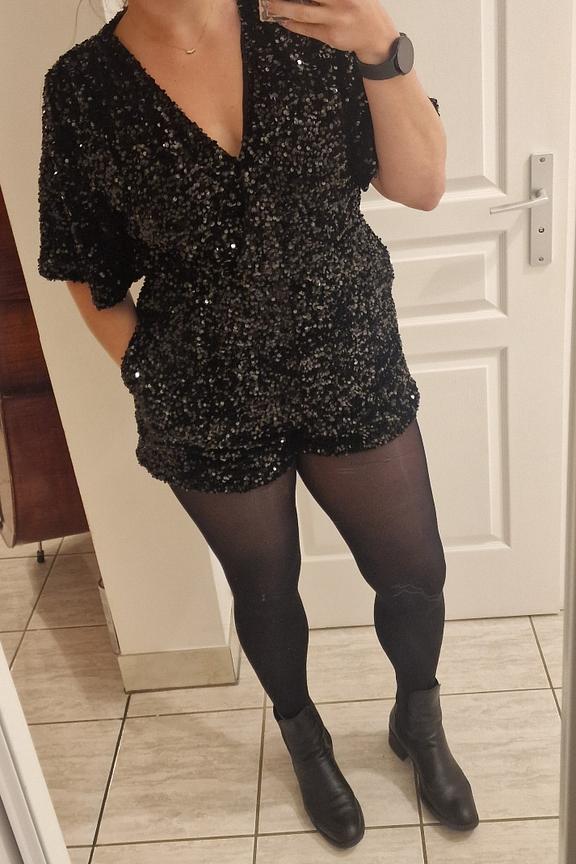 Pour un look audacieux, associez cette combinaison ร des bottes mรฉtallisรฉes et une pochette sobre. Idรฉale pour les soirรฉes d'hiver! โข Combinaison noire ร sequins โข Dรฉcolletรฉ en V โข Manches courtes et รฉvasรฉes โข Coupe courte flatteuse โข Fermeture invisible au dos