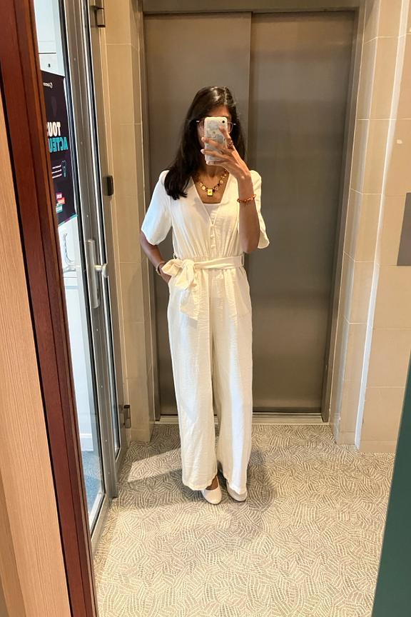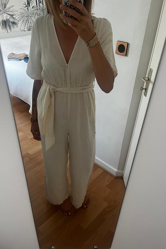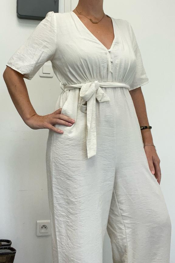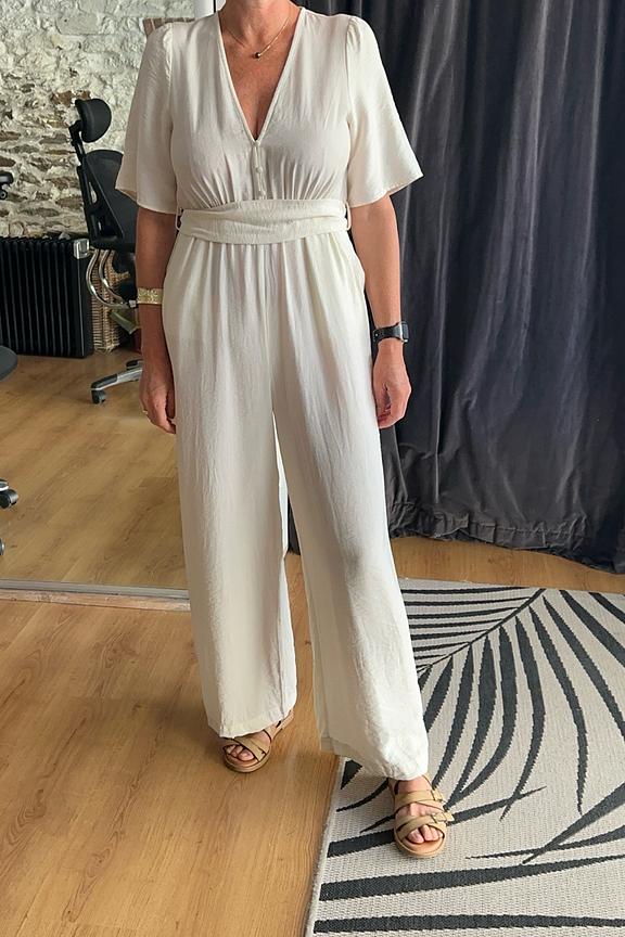 Associez cette combinaison écru à des sandales dorées et un sac en raphia pour un look estival frais et élégant. • Combinaison • Encolure en V • Manches courtes • Taille ceinturée • Large et fluide